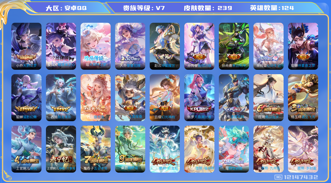 [12147432]V7 1典藏 2珍品传说 17传说 124英雄 239皮肤 可修改实名 女号 优质装备:天鹅之梦(小乔典藏),酷洛米之心,大耳狗之梦,猫影幻舞,末日机甲-孙尚香(绿蚂蚱),仲夏夜之梦(大飞蛾),飞鸢探春,游龙清影(小青龙),淬星耀世,挚爱花嫁,音你闪耀(rap皮),朵莉亚心动手记 传说皮:续相思,幻光神枪 珍宝阁皮:蔷薇恋人,女武神 限定皮:愿照·九州拓(澜年限),愿照·福禄聚(蔡文姬年限),愿照·岁时盈(虞姬年限),愿照·众生和(妲己年限),逐霄战戟,鸣野蒿,遇见飞天,高山流水,五谷丰年,梁祝,天狼溯光者,时之祈愿-瑶(瑶传限),神器·万象笔 史诗皮:器灵·浮梦炉,绮世丹青,化蝶舞,龙之律动,雪豹·霜爪,茶境仙,战舞者,涂山红红,奇遇星旅,遇见神鹿,紫霞仙子,白龙吟,江河有灵,魅语,偶像歌手,暗夜猫娘,猫狗日记-孙策,乱世虎臣,节奏热浪,女仆咖啡,水果甜心,绅士熊喵,心灵骇客,功夫厨神,德古拉伯爵,鬼剑武藏,心灵战警,舞动绿茵,地狱岩魂,繁星吟游(呼啦呼啦),拒霜思,缤纷独角兽,逐浪之夏,水晶猎龙者,唤灵魅影,圣诞恋歌,鹰眼统帅,暗夜贵公子,黎明之约