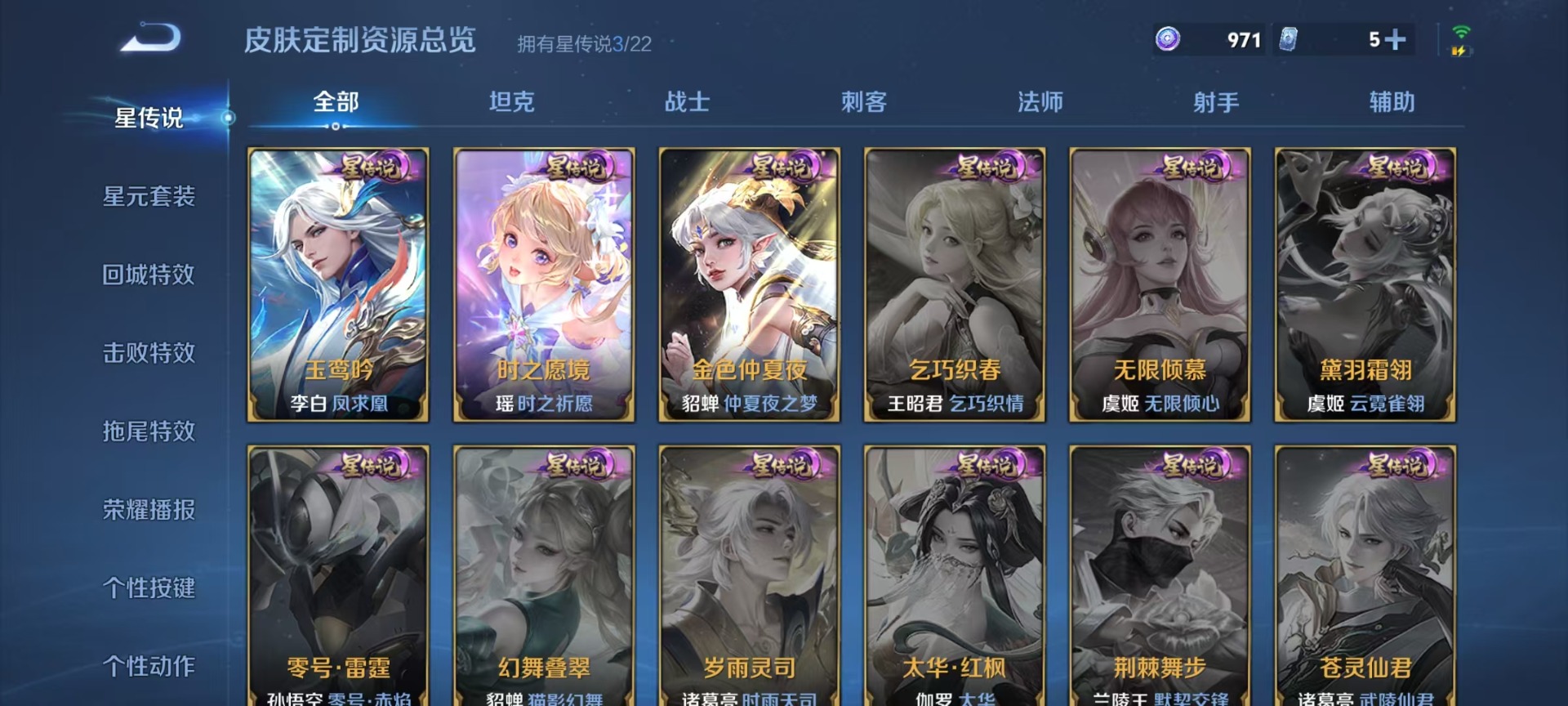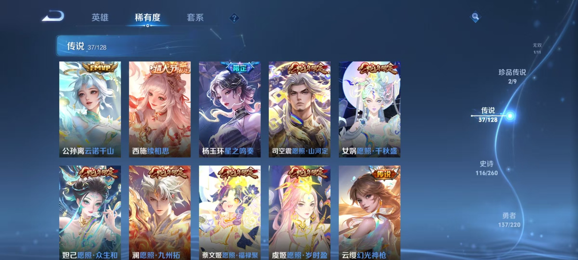 金蝉唐三藏,夏侯惇匿光决锋者,铠青龙志,伽罗天狼溯光者,苏烈玄武志,吕布御风骁将,后羿如梦令,露娜一生所爱,镜匿光追影者,公孙离玉兔公主,司空震愿照·山河定,裴擒虎李小龙,上官婉儿梁祝,李白诗剑行,花木兰青春决赛季,猪八戒猪悟能,女娲补天,女娲愿照·千秋盛,孙悟空孙行者,孙悟空大圣娶亲,孙悟空至尊宝,孙悟空美猴王,赵云引擎之心,云中君时之祈愿,妲己愿照·众生和,韩信傲雪梅枪,百里守约朱雀志,蔡文姬愿照·福禄聚,瑶时之祈愿,澜愿照·九州拓,虞姬霸王别姬,虞姬愿照·岁时盈,王昭君凤凰于飞
