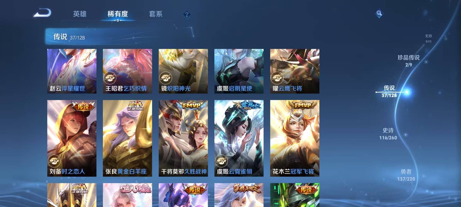 - [12090047]V7 1典藏 7传说 125英雄 243皮肤 可修改实名 优质装备:全息碎影(猴子典藏),地狱之眼,胖达荣荣,澜逐花归海,黄金天蝎座 传说皮:乘龙·问璇玑(孙尚香年限),吕布曦玄引 珍宝阁皮:蔷薇恋人 限定皮:鸣野蒿,白晶晶,飞衡(韩信年限),五谷丰年,李小龙,如梦令-后羿,美猴王,时之奇旅-妲己 史诗皮:鸭鸭历险记-刘禅,化蝶舞,龙之律动,破空之剑,琥珀纪元伽罗,蔬乡物语(鲁班七号),乘龙·聚宝船(安琪拉年限),百相守梦-黄忠,遇见神鹿,紫霞仙子,苍穹之光,黄金分割率,特工魅影,千年之狐,江河有灵,百解令(蒙犽),高渐离燃音魔法,蒙恬荣光圣徽,冰冠公主,青蛇,偶像歌手,电玩·爆裂旋风,末日机甲-吕布,猫狗日记-大乔,节奏热浪,修罗,摇滚巨星,水果甜心,心灵骇客,功夫厨神,德古拉伯爵,暗隐猎兽者,幽灵船长,鬼剑武藏,暗渊魔法,纤云弄巧,拒霜思,缤纷独角兽,乘风破浪,逐浪之夏,曙光守护者,金属风暴,原初追逐者,圣诞狂欢,圣诞恋歌,鹰眼统帅,暗夜贵公子,魅力维加斯,无心,未来纪元-赵云
