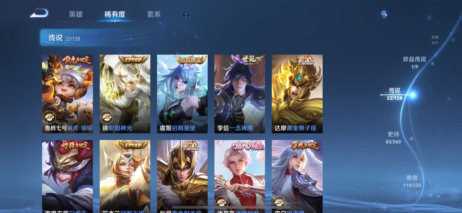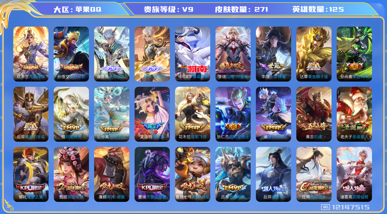 [12147515]V9 2典藏 2无双 1珍品传说 22传说 125英雄 271皮肤 可修改实名 优质装备:全息碎影(猴子典藏),九霄神辉(木兰典藏),器灵·螭龙剑,天机白泽,怪盗基德,黄金狮子座,黄金射手座,冠军飞将,炽阳神光,一念神魔,末日机甲-孙尚香(绿蚂蚱),超时空战士-狄仁杰,山海·炽霜斩(李信年限),浮生妄,澜逐花归海 传说皮:云诺千山 珍宝阁皮:优雅恋人,女武神 限定皮:愿照·九州拓(澜年限),愿照·岁时盈(虞姬年限),愿照·山河定(司空震年限),愿照·众生和(妲己年限),至尊宝,白虎志(电光耗子),凤求凰(白切鸡),凤凰于飞,武陵仙君(小桃花),神威(电光马子),飞衡(韩信年限),遇见飞天,高山流水,诗剑行,怒海麟威,五谷丰年,冰锋战神,游园惊梦,梁祝,逐梦之翼,烈魂,天狼征服者,天狼绘梦者,李小龙,逐梦之光,朱雀志(守约年限),如梦令-后羿,圣诞老人,大圣娶亲,蜜橘之夏,寅虎·御盾(廉颇年限),寅虎·瑞焰(虎皮蛋子),山海·玄木吟(马可年限) 史诗皮:器灵·浮梦炉,糖绘人间,瑰影绮梦,化蝶舞,龙之律动,雪豹·霜爪,布丁狗之誓,石田雨龙,茶境仙,紫霞仙子,苍穹之光,黄金分割率,特工魅影,千年之狐,百解令(蒙犽),冰冠公主,晚萤,猫狗日记-孙策,时之恋人-孙尚香,乱世虎臣,节奏热浪,修罗,女仆咖啡,水果甜心,绅士熊喵,星夜王子,心灵骇客,功夫厨神,德古拉伯爵,暗隐猎兽者,鬼剑武藏,心灵战警,天秀·启明,纤云弄巧,繁星吟游(呼啦呼啦),缤纷独角兽,乘风破浪,逐浪之夏,水晶猎龙者,曙光守护者,箭羽风息,金属风暴,原初追逐者,圣诞狂欢,圣诞恋歌,鹰眼统帅,王者之锤,黎明之约,雪上飞焰,寅虎·御盾,未来纪元-赵云