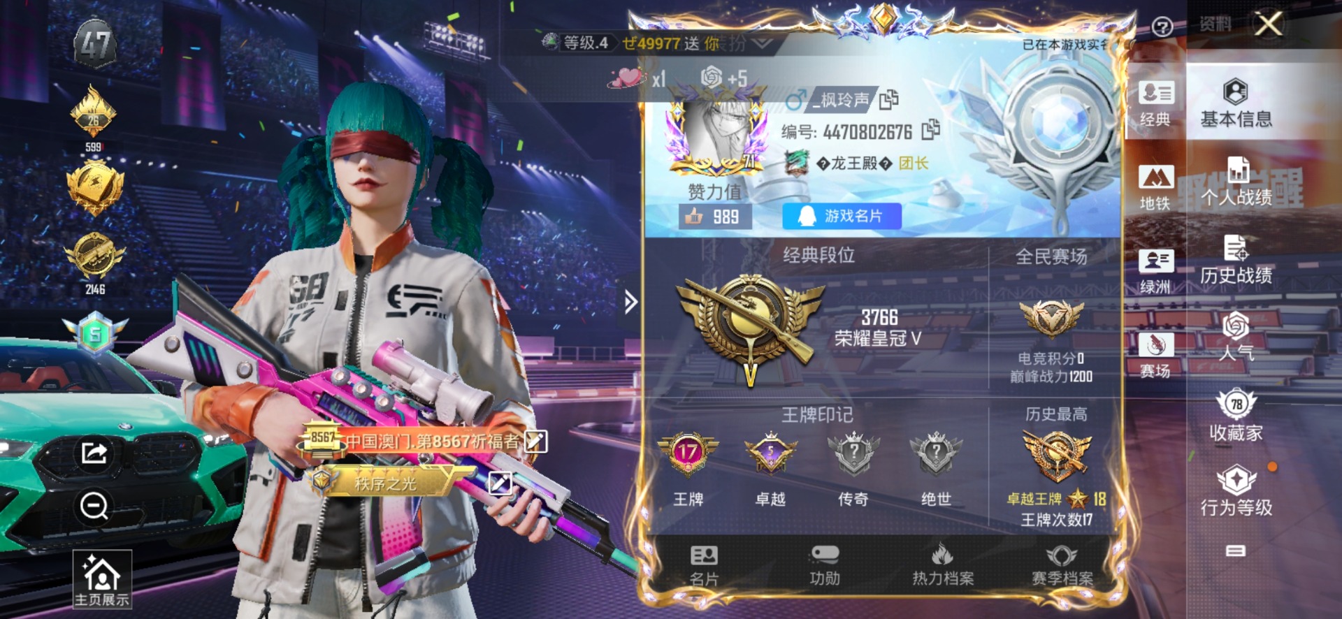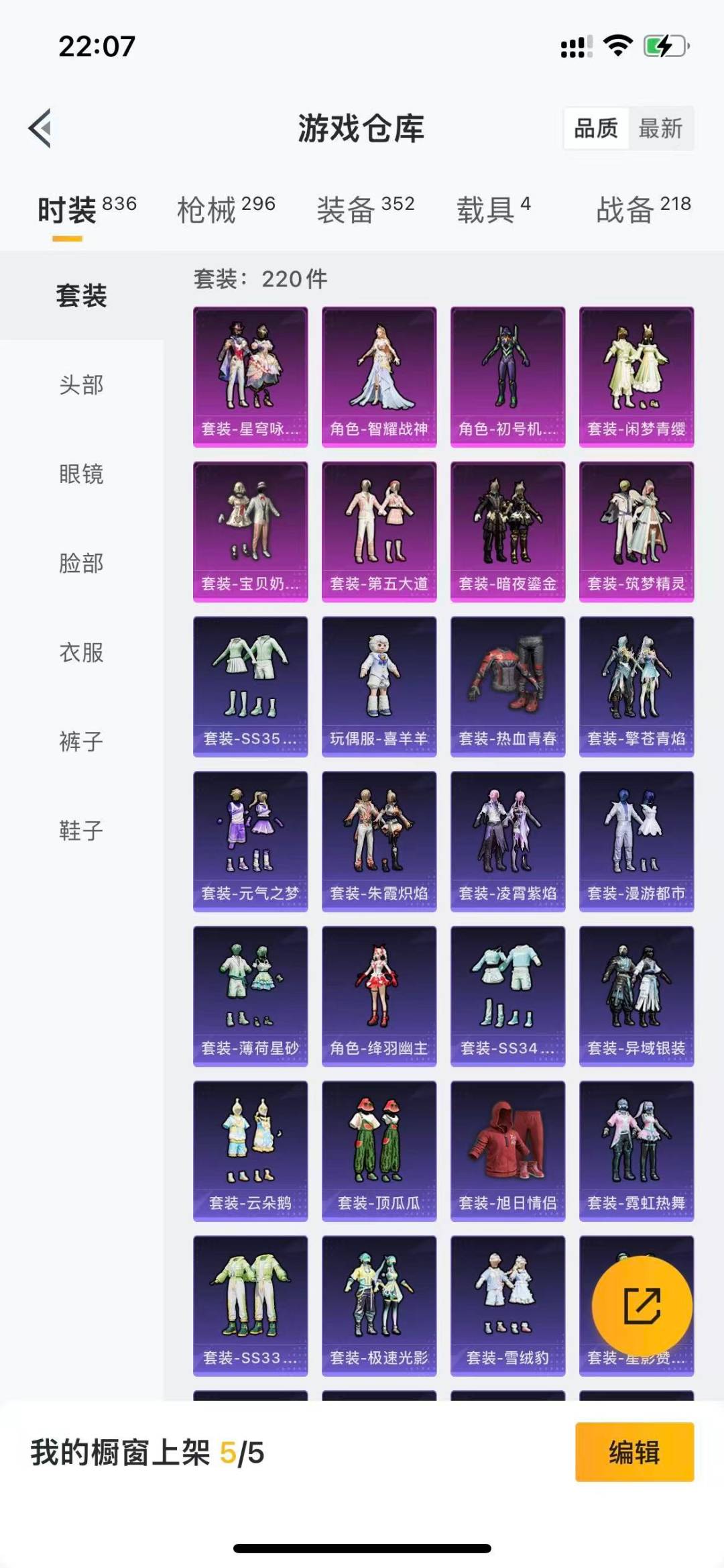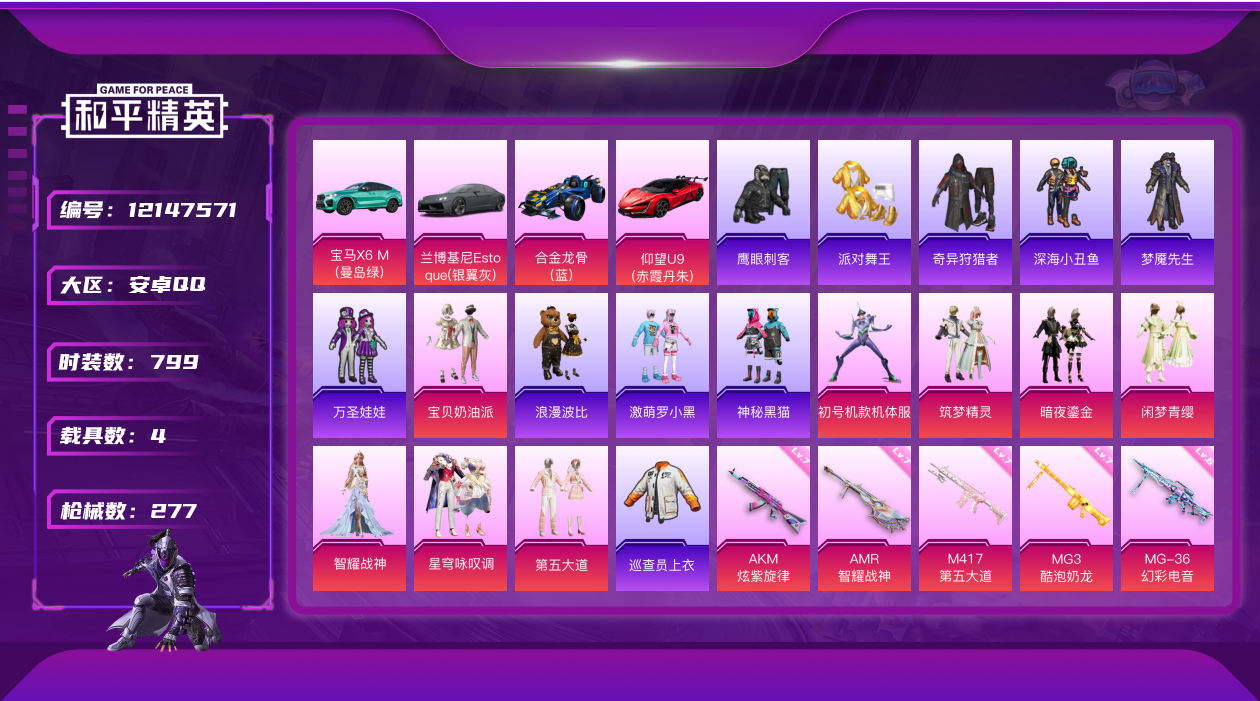 [12147571]8粉装 14特效枪 4载具 17印记 可二次 可修改实名 身法装备:舞王派对(派对舞王、小金鞋),暗影哥特(红眼罩),初号机款机体服(紫螳螂),巡查衣(绝对防御上衣) 优质装备:仰望U9(赤霞丹朱),宝马X6 M(曼岛绿),初号机款机体服(紫螳螂),合金龙骨(蓝),巡查员衣服(绝对防御上衣),兰博基尼Estoque(银翼灰),巡查衣(绝对防御上衣),舞王派对(派对舞王、小金鞋),AKM炫紫旋律,奇异狩猎者,宝贝奶油派,M417第五大道,MG3酷泡奶龙,七级MG3-酷泡奶龙,七级M417-第五大道,七级AKM-炫紫旋律,M416电玩时刻,M762-青锋波束,GROZA-镜光银凌,AUG-暖羊咩咩,智耀战神,AMR-智耀战神,七级AMR-智耀战神,星穹咏叹调,AKS-74U-星穹咏叹调,MK14-甜梦熊击,MG3-辉羽雀灵,MG-36-幻彩电音,Kar98K-巳巳如意 热门装扮:筑梦精灵,暗夜鎏金,第五大道,闲梦青缨,神秘黑猫,激萌罗小黑,鹰眼刺客,万圣娃娃,梦魇先生,深海小丑鱼,浪漫波比,派对舞王(小金鞋) 稀有枪皮:DP-28-豹影疾电 六级特效枪:六级MG-36-幻彩电音 五级特效枪:五级M762-青锋波束,五级GROZA-镜光银凌,五级Kar98K-巳巳如意,五级DP-28-豹影疾电,五级AUG-暖羊咩咩,五级MK14-甜梦熊击,五级AKS-74U-星穹咏叹调,五级M416-电玩时刻 三级特效枪:三级MG3-辉羽雀灵 紫色装扮:霓虹热舞,极速光影,SS31特训套装,SS30特训套装,SS23特训,云朵鹅,雪绒豹,SS33特训套装,青涩时光,旭日情侣,顶瓜瓜,幻彩翩翩,熠彩粉晶,碧波幻想,田园牧歌,轻风白浪,和煦暖阳,SS22特训,莱茵河畔,香榭午后,妙红点点,吉莉礼服,坚韧舞者,夏日音浪,完美偶像,帅气教官,幻世战舞者,幻影武者,怒火燎原,冷焰舞者,人气偶像,冰川特警,SS21特训,零款战斗服,明日香款战斗服,电音精灵,天籁歌者,瑞龙福将,团圆交子,SS17特训,治愈之星,科技之星,SS14特训,萌趣颜团子,SS15特训,暗夜傀儡,甜心亚梦,虚音幻奏,SS20特训,竞技角斗士,梦幻奶油,暖心橘喵,战地督导,娇憨猪猪,萌趣咩咩,焰山流火,异彩先驱,SS18特训,飞驰魅影,音速流光,SS19特训,黎明保卫者,风行保卫者,飞行日记,魅力单车,鹤鸣,麻辣教官,黄色伏