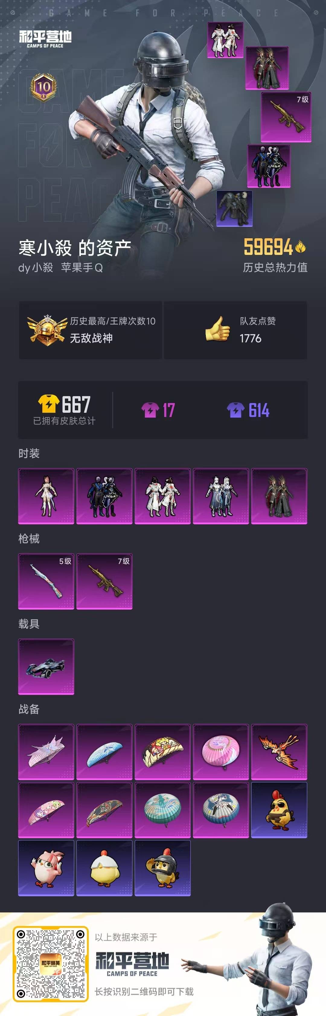 - PX_2108281-可二次 等级59 75套装 100枪皮 历史Z高超级王牌3星 3王牌印记 热力值31973 1车 5粉 2特效 玛莎拉蒂Ghibli粉 满级M249蓝莓炮弹 2级98k巳巳如意 熔岩统帅 恐龙拽拽 冰炎战车 紫钛骑冰 宙之时溯 时希公主 天籁歌者 暗夜魅影 薄荷蓝莓 万圣娃娃 狂沙舞者 AKM百万伏特 SCAR-L黄金龙骨 Vector暗夜玫瑰 万古烈焰飞行器 7粉降落伞