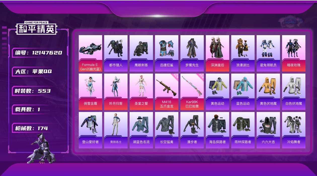 [12147620]5粉装 2特效枪 1载具 10印记 可二次 可修改实名 战神框 身法装备:都市猎人 优质装备:Formula E Gen2(幽光蓝),都市猎人,M416五爪金龙,深渊皇后,七级M416-五爪金龙,Kar98K-巳巳如意 热门装扮:俏雪含霜,吟月归客,暗夜玫瑰,圣堂之誓,迅捷狂鲨,鹰眼刺客,梦魇先生,浪漫波比,都市猎人,星兔领航员 五级特效枪:五级Kar98K-巳巳如意 紫色装扮:SS31特训套装,SS30特训套装,SS23特训,SS33特训套装,幻彩翩翩,碧波幻想,田园牧歌,轻风白浪,和煦暖阳,SS22特训,摩登艾咪,妙红点点,吉莉礼服,夏日音浪,幻世战舞者,冷焰舞者,六六大吉,军械专家,冰川特警,SS21特训,时空追击者,暴风机械师,SS16特训,龙宫之主,遗落祭司,欧布奥特曼,电音精灵,瑞龙福将,团圆交子,SS17特训,星梦畅游,治愈之星,迅捷之星,科技之星,SS14特训,萌趣颜团子,特种颜团子,青春冒险家,光影梦想家,潮流游乐家,SS15特训,蝎王蛇后,甜心亚梦,虚音幻奏,猎梦纪元,SS20特训,竞技角斗士,娇憨猪猪,萌趣咩咩,异彩先驱,缤纷焰火,SS18特训,水晶王族,雪兔飞飞,飞驰魅影,音速流光,SS19特训,军刀雅典娜,风行保卫者,魅力单车,鹤鸣,麻辣教官,黄色伏地魔,黄色运动,青春校园,龙的传人,龟仙人,龙魂突击队,香桃花海,野性战心,迎春赐吉,长空猛禽,雨林探路者,霓虹极客,霓虹街区,超能勇士,湖蓝色名流,滨海假日,滨海厨神,潮流先锋,炫蓝之夏,热血青春,燃烧卡路里,牛气冲天,牛气满满,探宝勇士,朋克治安官,极地朋克,柠萌假日,海岛探路者,格斗先锋,沙漠兵团,沙漠毒蛇,特战装甲,绮丽涂鸦,缤纷果语,耀眼新星,蓝色运动,虎虎生威吉莉,登山爱好者,王牌教练,甜蜜熊情侣,甜蜜菠萝,白色伏地魔,破晓战魂,福星高照,空岛之星,空投萌叽,突袭者,SS28特训,玉兔迎春,智谋强哥,竞技名士,绒宝小鹅,惊鸿侠骨,SS24特训(SS24特训套装),SS25特训,锦衣飞扬,SS27特训,Alan Walker,蝶吟花词,明鸳圣池,浪漫天命,SS26特训,薄荷蓝莓,银白舞王,击剑大师,超能拳王,绯格组合,萌黄之夏,SS32特训服(SS32特训套装),光之冒险,恋语绒绒,漫步者,冰冻风暴,海上生明月 优质战备:江南烟雨降落伞,海螺星光降落伞,甜心宝贝降落伞,夏