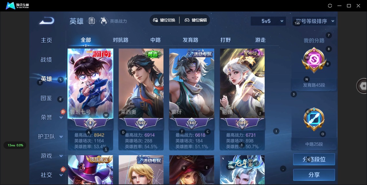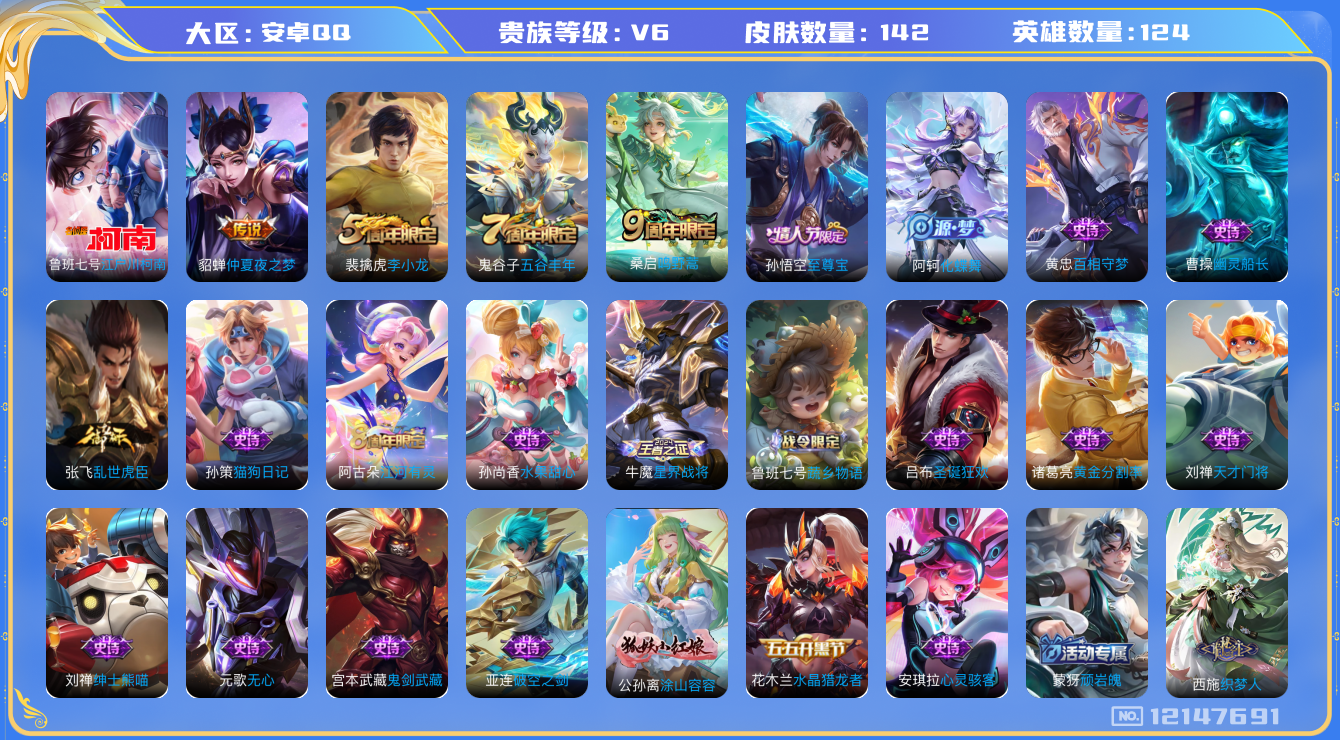 [12147691]V6 1珍品传说 2传说 124英雄 142皮肤 可修改实名 优质装备:江户川柯南,仲夏夜之梦(大飞蛾),涂山容容 珍宝阁皮:妄想食味 限定皮:鸣野蒿,至尊宝,五谷丰年,李小龙 史诗皮:化蝶舞,星界战将,炽弈燎原,破空之剑,蒙犽顽岩魄,蔬乡物语(鲁班七号),百相守梦-黄忠,织梦人,黄金分割率,江河有灵,猫狗日记-孙策,乱世虎臣,水果甜心,绅士熊喵,天才门将,心灵骇客,幽灵船长,鬼剑武藏,心灵战警,繁星吟游(呼啦呼啦),逐浪之夏,水晶猎龙者,金属风暴,原初追逐者,圣诞狂欢,鹰眼统帅,魅力维加斯,无心,未来纪元-赵云