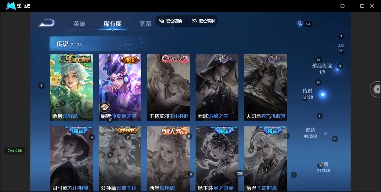 - PX_2097100-92 安卓微信/至尊星耀/138皮肤/121英雄/1典藏/0珍品无双/0无双/1珍品传说/8传说/40史诗/5稀有英雄 【1 珍品传说】时之奇旅 孙策, 【1 典藏皮肤】弑枪猎影 韩信, 【8 传说皮肤】地狱火 孙悟空,鹤羽星尊 诸葛亮,战鼓燎原 典韦,愿照·九州拓 澜,幻光神枪 云缨,祥瑞亨通 裴擒虎,愿照·岁时盈 虞姬,鸣野蒿 桑启, 【40 史诗皮肤】末日机甲 吕布,紫