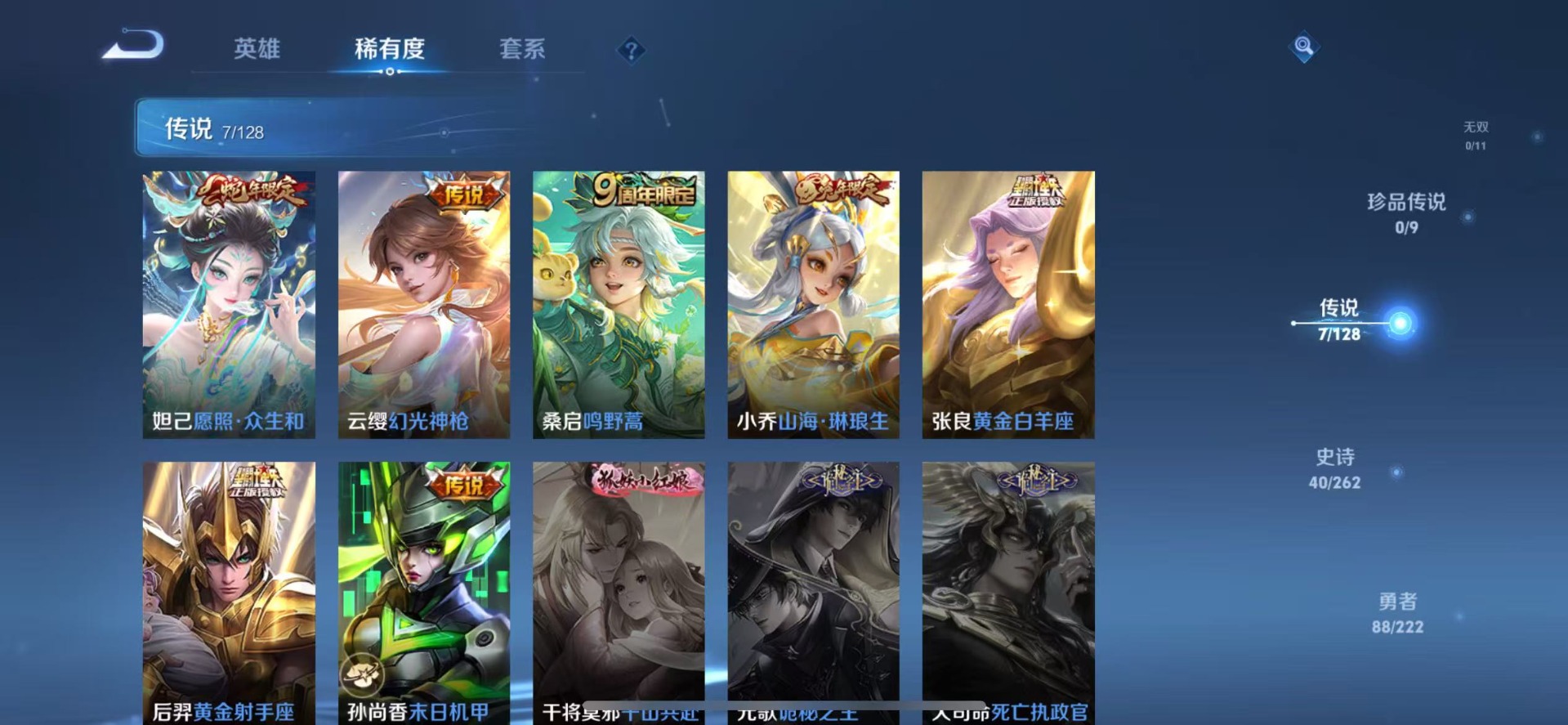 - [12297010]V7 1典藏 1珍品传说 7传说 125英雄 190皮肤 可修改实名 优质装备:全息碎影(猴子典藏),黄金狮子座,冠军飞将,久胜战神,超时空战士-狄仁杰 珍品传说:时之奇旅-孙策 传说皮:幻光神枪 珍宝阁皮:妄想食味 限定皮:愿照·山河定(司空震年限),鸣野蒿,梁祝,御风骁将(吕布年限),李小龙,山海·玄木吟(马可年限) 史诗皮:器灵·浮梦炉,化蝶舞,星界战将,谪仙醉月,龙之律动,藏狐·褐绒,茶境仙,破空之剑,紫霞仙子,特工魅影,雪夜绮愿(周瑜),魅语,百解令(蒙犽),高渐离燃音魔法,蒙恬荣光圣徽,无限星赏官,冰冠公主,偶像歌手,龙骑士(小龙虾),末日机甲-吕布,乱世虎臣,节奏热浪,修罗,水果甜心,德古拉伯爵,暗隐猎兽者,幽灵船长,鬼剑武藏,地狱岩魂,纤云弄巧,缤纷独角兽,水晶猎龙者,圣诞狂欢,鹰眼统帅,魅力维加斯