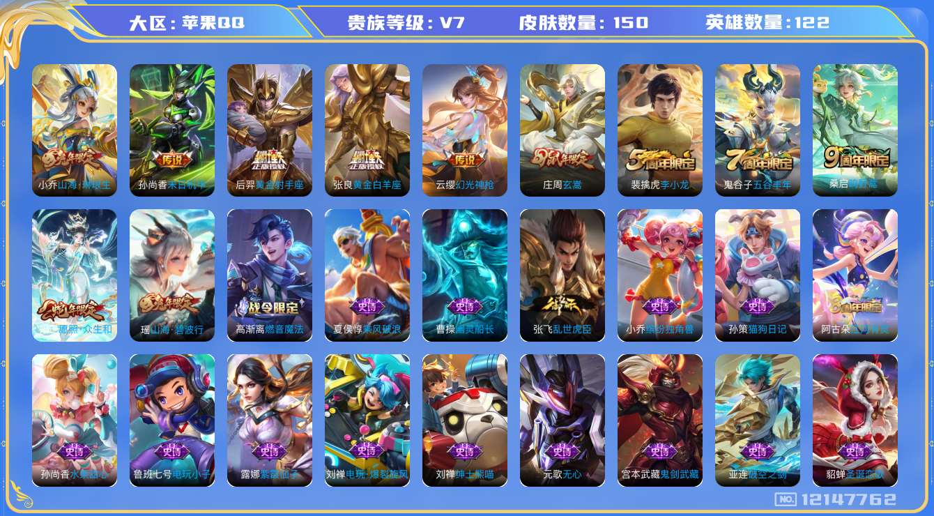 [12147762]V7 7传说 122英雄 150皮肤 可修改实名 女号 优质装备:黄金射手座,黄金白羊座,末日机甲-孙尚香(绿蚂蚱),山海·琳琅生(小乔年限),涂山容容 传说皮:幻光神枪 珍宝阁皮:蔷薇恋人 限定皮:愿照·众生和(妲己年限),鸣野蒿,玄嵩(庄周年限),山海·碧波行(瑶年限),五谷丰年,李小龙 史诗皮:破空之剑,乘龙·聚宝船(安琪拉年限),紫霞仙子,电玩小子(小书包),千年之狐,江河有灵,高渐离燃音魔法,电玩·爆裂旋风,晚萤,偶像歌手,猫狗日记-孙策,乱世虎臣,女仆咖啡,水果甜心,绅士熊喵,心灵骇客,幽灵船长,鬼剑武藏,心灵战警,舞动绿茵,诗语江南,缤纷独角兽,乘风破浪,金属风暴,圣诞恋歌,魅力维加斯,无心,未来纪元-赵云