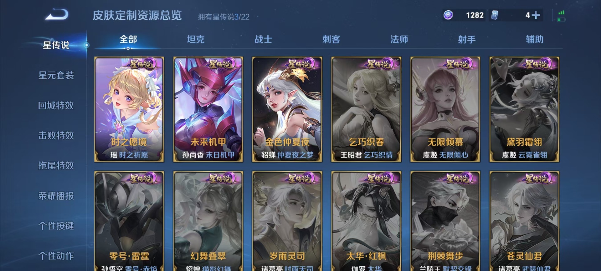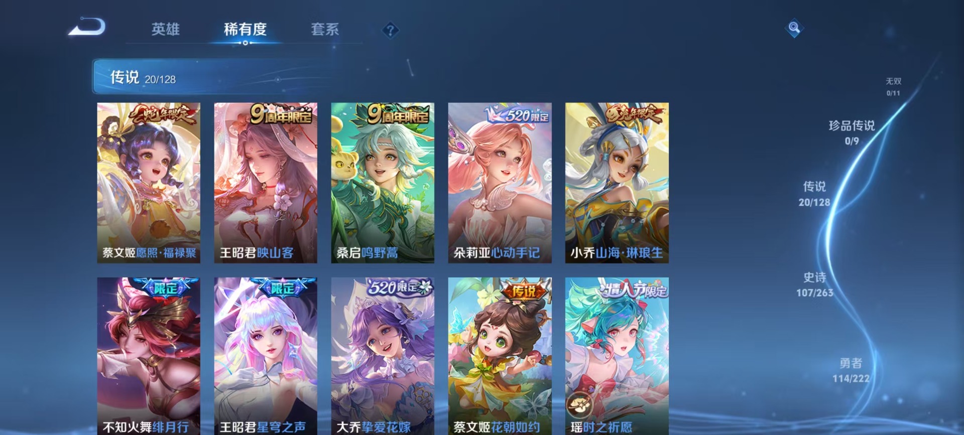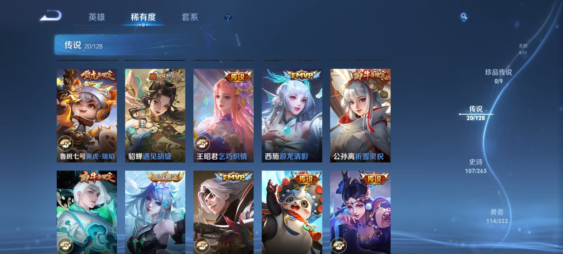 大乔白鹤梁神女,甄姬女儿国国王,铠青龙志,伽罗天狼溯光者,孙膑天狼运算者,不知火舞绯月行,鲁班七号乒乒小将,鲁班七号寅虎·瑞焰,庄周云端筑梦师,诸葛亮时雨天司,杨玉环寅虎·心曲,公孙离祈雪灵祝,裴擒虎李小龙,东皇太一逐梦之光,上官婉儿天狼绘梦者,花木兰默契交锋,安琪拉魔法小厨娘,马可波罗山海·玄木吟,桑启鸣野蒿,猪八戒猪悟能,孙悟空孙行者,芈月白晶晶,雅典娜神奇女侠,妲己时之彼端,妲己时之奇旅,蔡文姬奇迹圣诞,蔡文姬愿照·福禄聚,瑶时之祈愿,瑶山海·碧波行,王昭君星穹之声,王昭君映山客