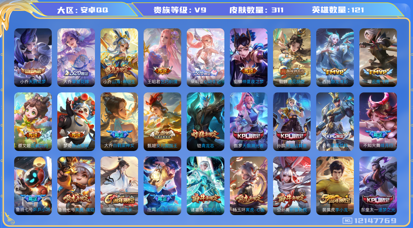 [12147769]V9 1典藏 20传说 121英雄 311皮肤 可修改实名 女号 优质装备:天鹅之梦(小乔典藏),云鹰飞将(小将军),仲夏夜之梦(大飞蛾),胖达荣荣,乞巧织情,游龙清影(小青龙),遇见胡旋,花朝如约(花篮子),挚爱花嫁,山海·琳琅生(小乔年限),朵莉亚心动手记 珍宝阁皮:蔷薇恋人,女武神 限定皮:愿照·福禄聚(蔡文姬年限),逐霄战戟,映山客,鸣野蒿,星穹之声,绯月行,时之彼端,白鹤梁神女,魔法小厨娘,白晶晶,时雨天司(水龙头),山海·碧波行(瑶年限),高山流水,五谷丰年,青龙志(铠年限),天狼运算者,天狼溯光者,祈雪灵祝(雪兔子),天狼绘梦者,李小龙,逐梦之光,奇迹圣诞,默契交锋-花木兰,孙行者,猪悟能,云端筑梦师,乒乒小将,神奇女侠,女儿国国王,寅虎·瑞焰(虎皮蛋子),寅虎·心曲(虎婆),时之祈愿-瑶(瑶传限),时之奇旅-妲己,山海·玄木吟(马可年限) 史诗皮:乘龙·忆丹青(大乔年限),谪仙醉月,炽弈燎原,撼地雄心,破空之剑,涂山红红,东方月初,蒙犽顽岩魄,芈月浮光幕影,乘龙·聚宝船(安琪拉年限),夜落电台,上官婉儿群星魔术团,蔬乡物语(鲁班七号),遇见神鹿,电玩小子(小书包),特工魅影,千年之狐,冰冠公主,白蛇,江河有灵,青蛇,百解令(蒙犽),魅语,无限星赏官,晚萤,偶像歌手,电玩·兔顽号,银翎春语,末日机甲-吕布,猫狗日记-孙策,猫狗日记-大乔,时之恋人-孙尚香,乱世虎臣,节奏热浪,修罗,女仆咖啡,水果甜心,绅士熊喵,天才门将,星夜王子,心灵骇客,时之奇旅-安琪拉,功夫厨神,德古拉伯爵,暗隐猎兽者,幽灵船长,鬼剑武藏,心灵战警,乐园奇幻夜,舞动绿茵,诗语江南,纤云弄巧,繁星吟游(呼啦呼啦),拒霜思,缤纷独角兽,乘风破浪,逐浪之夏,曙光守护者,热力回旋,唤灵魅影,金属风暴,圣诞恋歌,鹰眼统帅,魅力维加斯,无心,未来纪元-赵云