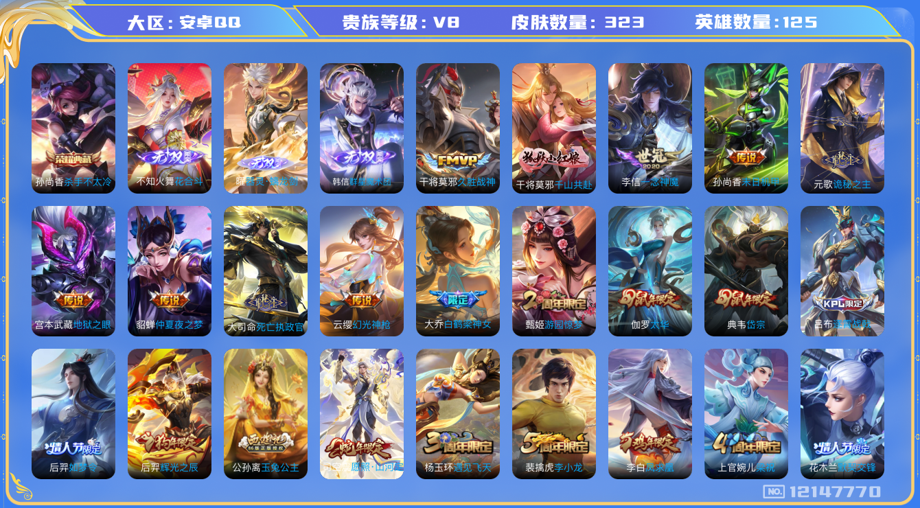[12147770]V8 1典藏 3无双 21传说 125英雄 323皮肤 可修改实名 优质装备:杀手不太冷,韩信群星魔术团(韩信无双),花合斗,器灵·螭龙剑,久胜战神,一念神魔,末日机甲-孙尚香(绿蚂蚱),仲夏夜之梦(大飞蛾),地狱之眼,诡秘之主,千山共赴,涂山容容 传说皮:死亡执政官,幻光神枪 珍宝阁皮:妄想食味,优雅恋人 限定皮:愿照·九州拓(澜年限),愿照·福禄聚(蔡文姬年限),愿照·岁时盈(虞姬年限),愿照·山河定(司空震年限),愿照·众生和(妲己年限),愿照·千秋盛(女娲年限),逐霄战戟,鸣野蒿,凤求凰(白切鸡),太华(伽罗年限),白鹤梁神女,神威(电光马子),飞衡(韩信年限),遇见飞天,五谷丰年,冰锋战神,武圣,游园惊梦,梁祝,逐梦之星,岱宗(典韦年限),李小龙,永曜之星,辉光之辰,如梦令-后羿,默契交锋-花木兰,猪悟能,大圣娶亲,玉兔公主 史诗皮:器灵·浮梦炉,龙之律动,星界战将,茶境仙,破空之剑,怒海争锋,织梦人,紫霞仙子,黄金分割率,特工魅影,冰冠公主,百解令(蒙犽),高渐离燃音魔法,蒙恬荣光圣徽,魅语,电玩·爆裂旋风,偶像歌手,猫狗日记-孙策,乱世虎臣,修罗,女仆咖啡,摇滚巨星,水果甜心,绅士熊喵,天才门将,星夜王子,功夫厨神,德古拉伯爵,暗隐猎兽者,幽灵船长,鬼剑武藏,心灵战警,天秀·启明,地狱岩魂,纤云弄巧,繁星吟游(呼啦呼啦),拒霜思,缤纷独角兽,逐浪之夏,水晶猎龙者,曙光守护者,金属风暴,原初追逐者,圣诞狂欢,鹰眼统帅,王者之锤,暗夜贵公子,魅力维加斯,黎明之约,滕王阁序,无心,未来纪元-赵云