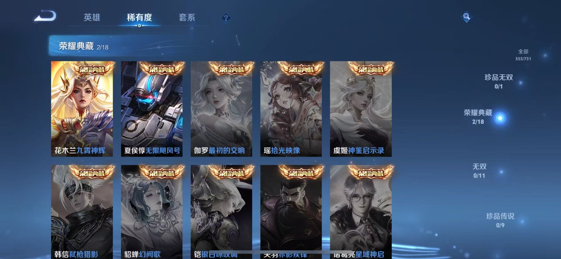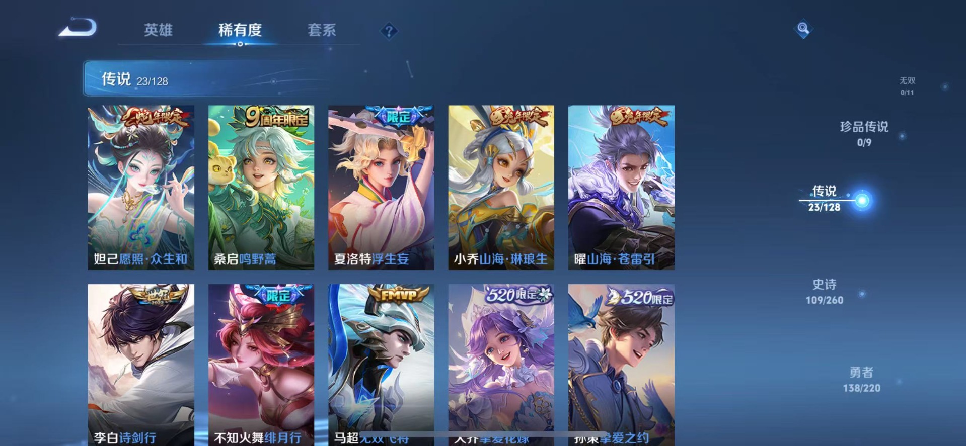 伽罗天狼溯光者,赵云百木心枪,干将莫邪冰霜恋舞曲,孙尚香异界灵契,不知火舞绯月行,项羽霸王别姬,后羿辉光之辰,露娜一生所爱,镜匿光追影者,庄周云端筑梦师,杨玉环寅虎·心曲,公孙离玉兔公主,公孙离蜜橘之夏,裴擒虎梅西,裴擒虎李小龙,上官婉儿梁祝,上官婉儿天狼绘梦者,李白诗剑行,花木兰青春决赛季,马可波罗山海·玄木吟,桑启鸣野蒿,孙悟空大圣娶亲,孙悟空至尊宝,百里玄策白虎志,马超神威,云中君时之祈愿,妲己愿照·众生和,韩信逐梦之影,百里守约朱雀志,瑶山海·碧波行,虞姬霸王别姬,关羽冰锋战神