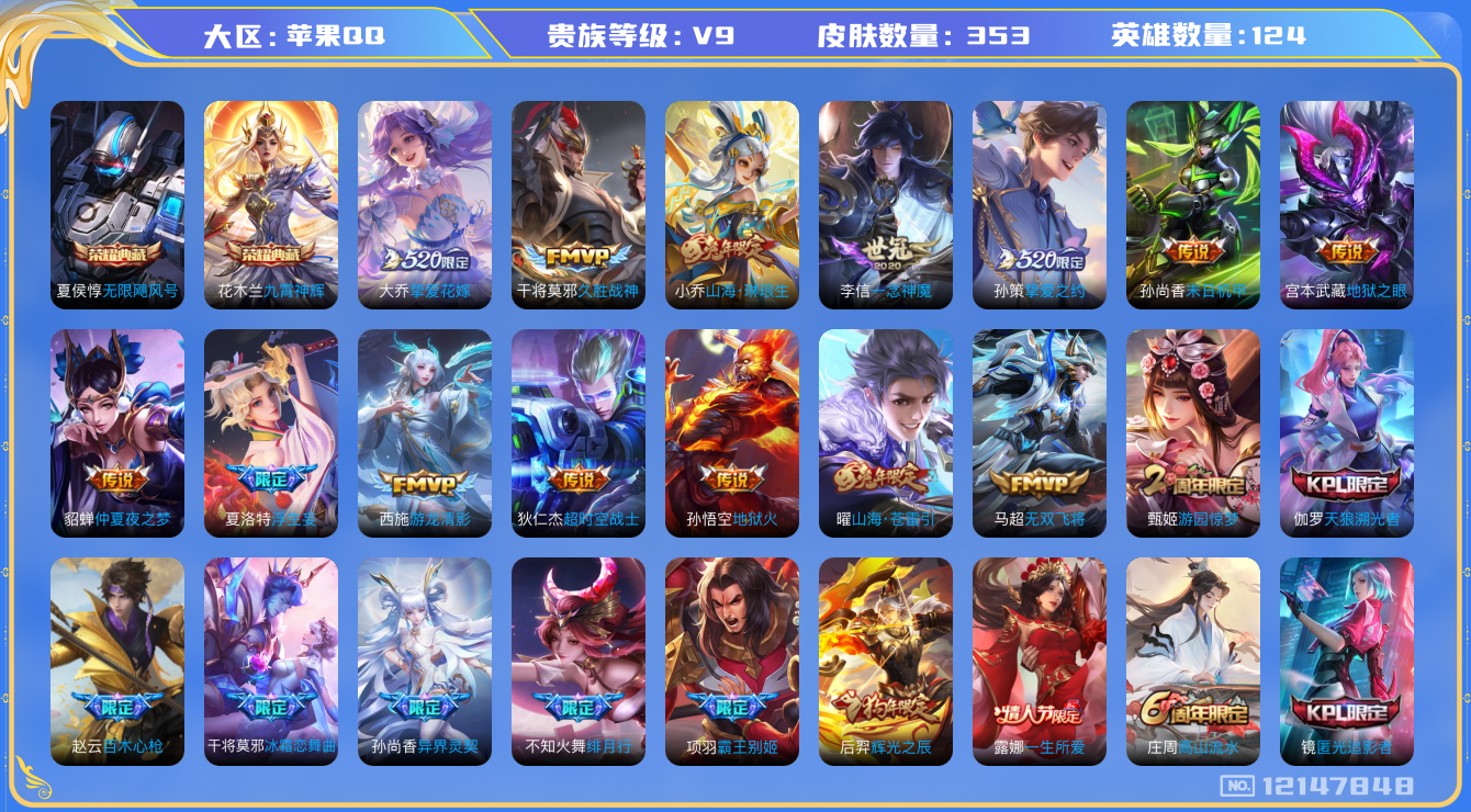 [12147848]V9 2典藏 23传说 124英雄 353皮肤 可修改实名 优质装备:无限飓风号(高达),九霄神辉(木兰典藏),久胜战神,一念神魔,末日机甲-孙尚香(绿蚂蚱),地狱火,仲夏夜之梦(大飞蛾),地狱之眼,游龙清影(小青龙),超时空战士-狄仁杰,挚爱之约,挚爱花嫁,无双飞将,山海·琳琅生(小乔年限),山海·苍雷引(电光曜子),浮生妄 珍宝阁皮:优雅恋人,女武神 限定皮:愿照·众生和(妲己年限),鸣野蒿,至尊宝,白虎志(电光耗子),梅西,武陵仙君(小桃花),异界灵契(白毛香),绯月行,神威(电光马子),山海·碧波行(瑶年限),遇见飞天,高山流水,诗剑行,五谷丰年,冰锋战神,游园惊梦,梁祝,天狼溯光者,天狼绘梦者,李小龙,逐梦之影,朱雀志(守约年限),永曜之星,辉光之辰,霸王别姬-项羽,霸王别姬-虞姬,一生所爱,大圣娶亲,青春决赛季,冰霜恋舞曲,云端筑梦师,蜜橘之夏,匿光追影者,寅虎·心曲(虎婆),时之祈愿-云中君,百木心枪,玉兔公主,山海·玄木吟(马可年限) 史诗皮:藏狐·褐绒,电玩小子(小书包),白龙吟,黄金分割率,特工魅影,千年之狐,永昼,魅语,蒙恬荣光圣徽,冰冠公主,偶像歌手,晚萤,银翎春语,龙骑士(小龙虾),猫狗日记-孙策,乱世虎臣,节奏热浪,修罗,女仆咖啡,摇滚巨星,水果甜心,绅士熊喵,天才门将,星夜王子,心灵骇客,时之奇旅-安琪拉,功夫厨神,德古拉伯爵,暗隐猎兽者,幽灵船长,鬼剑武藏,暗渊魔法,心灵战警,舞动绿茵,地狱岩魂,诗语江南,纤云弄巧,繁星吟游(呼啦呼啦),拒霜思,缤纷独角兽,乘风破浪,逐浪之夏,月团寄思,水晶猎龙者,曙光守护者,箭羽风息,金属风暴,原初追逐者,圣诞狂欢,圣诞恋歌,鹰眼统帅,暗夜贵公子,魅力维加斯,黎明之约,赏金猎手,奇遇舞章,天秀·音浪,无心,未来纪元-赵云