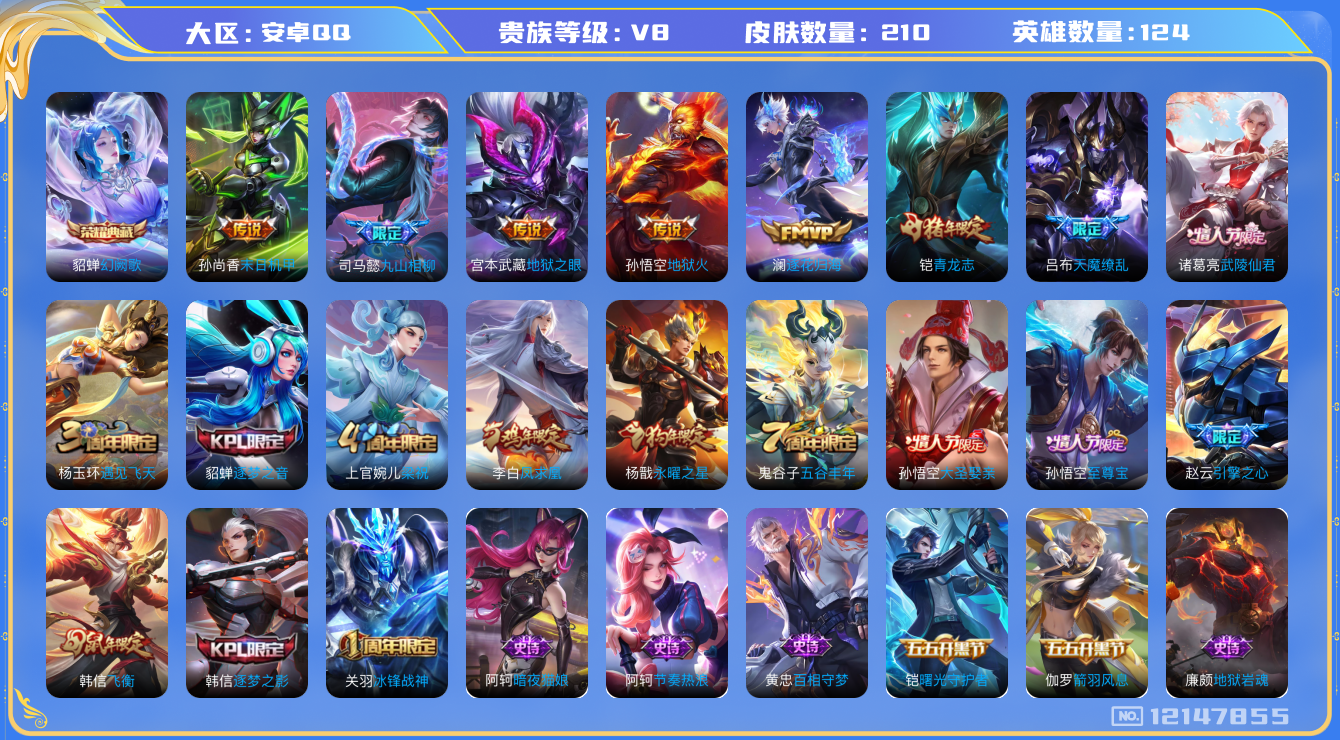 [12147855]V8 1典藏 10传说 124英雄 210皮肤 可修改实名 优质装备:幻阙歌(貂蝉典藏),末日机甲-孙尚香(绿蚂蚱),地狱火,地狱之眼,澜逐花归海,涂山容容 传说皮:九山相柳 珍宝阁皮:玩趣恶龙 限定皮:至尊宝,凤求凰(白切鸡),武陵仙君(小桃花),飞衡(韩信年限),遇见飞天,五谷丰年,青龙志(铠年限),冰锋战神,梁祝,逐梦之音,逐梦之影,永曜之星,大圣娶亲,引擎之心,天魔缭乱 史诗皮:赞萌露比,苍鳞隐世,绮世丹青,灵蛊蚀心,龙之律动,石田雨龙,百相守梦-周瑜,幻珠鲛人,百相守梦-黄忠,紫霞仙子,白龙吟,黄金分割率,特工魅影,千年之狐,冰冠公主,偶像歌手,电玩·爆裂旋风,暗夜猫娘,龙骑士(小龙虾),末日机甲-吕布,乱世虎臣,节奏热浪,修罗,水果甜心,绅士熊喵,心灵骇客,暗隐猎兽者,鬼剑武藏,地狱岩魂,逐浪之夏,水晶猎龙者,曙光守护者,箭羽风息,金属风暴,原初追逐者,圣诞恋歌,鹰眼统帅,魅力维加斯,未来纪元-赵云