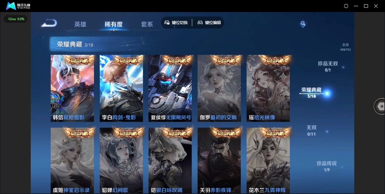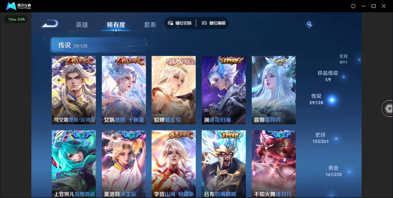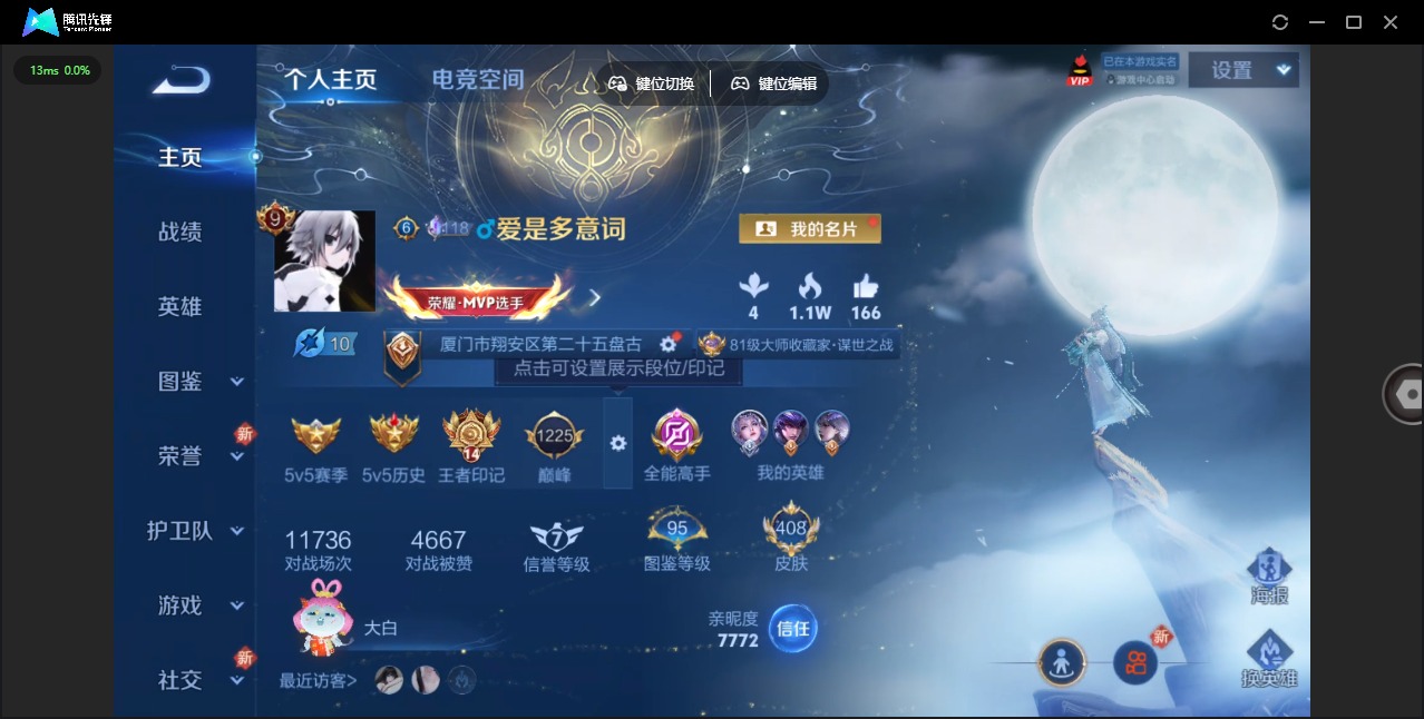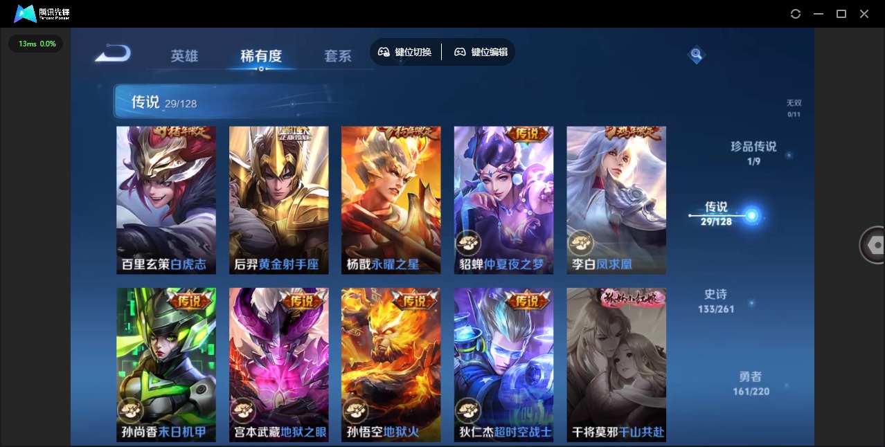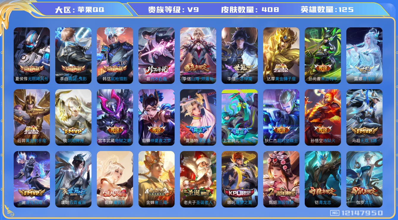 [12147950]V9 3典藏 1珍品传说 29传说 125英雄 408皮肤 可修改实名 优质装备:无限飓风号(高达),鸣剑·曳影,弑枪猎影(韩信典藏),朽木白哉,黄金狮子座,黄金射手座,炽阳神光,一念神魔,云霓雀翎,末日机甲-孙尚香(绿蚂蚱),地狱火,仲夏夜之梦(大飞蛾),地狱之眼,超时空战士-狄仁杰,无双飞将,山海·炽霜斩(李信年限),浮生妄,妄想奇谈,霜月吟,澜逐花归海 传说皮:貂蝉曦玄引 珍宝阁皮:优雅恋人,玩趣恶龙 限定皮:愿照·山河定(司空震年限),愿照·千秋盛(女娲年限),至尊宝,白虎志(电光耗子),凤求凰(白切鸡),太华(伽罗年限),梅西,傲雪梅枪,绯月行,时之彼端,白晶晶,时雨天司(水龙头),遇见飞天,高山流水,怒海麟威,五谷丰年,青龙志(铠年限),冰锋战神,游园惊梦,梁祝,天狼狩猎者,逐梦之翼,李小龙,逐梦之影,逐梦之光,玄武志(苏烈年限),朱雀志(守约年限),永曜之星,辉光之辰,圣诞老人,一生所爱,大圣娶亲,引擎之心,冰霜恋舞曲,云端筑梦师,神奇女侠,寅虎·心曲(虎婆),寅虎·赤拳(老虎年限),玉兔公主,深海之息(深海大菠萝),唐三藏 史诗皮:鸭鸭历险记-刘禅,飞车小橘子,器灵·浮梦炉,化蝶舞,灵蛊蚀心,星界战将,龙之律动,石田雨龙,百相守梦-周瑜,茶境仙,炽弈燎原,破空之剑,战舞者,东方月初,蔬乡物语(鲁班七号),乘龙·忆丹青(大乔年限),紫霞仙子,苍穹之光,电玩小子(小书包),白龙吟,黄金分割率,特工魅影,千年之狐,魅语,高渐离燃音魔法,无限星赏官,冰冠公主,青蛇,偶像歌手,白蛇,晚萤,暗夜猫娘,龙骑士(小龙虾),末日机甲-吕布,猫狗日记-孙策,猫狗日记-大乔,乱世虎臣,节奏热浪,修罗,女仆咖啡,摇滚巨星,水果甜心,绅士熊喵,天才门将,星夜王子,心灵骇客,功夫厨神,德古拉伯爵,暗隐猎兽者,幽灵船长,鬼剑武藏,暗渊魔法,心灵战警,乐园奇幻夜,舞动绿茵,地狱岩魂,诗语江南,纤云弄巧,繁星吟游(呼啦呼啦),缤纷独角兽,乘风破浪,逐浪之夏,月团寄思,水晶猎龙者,曙光守护者,箭羽风息,金属风暴,原初追逐者,圣诞狂欢,圣诞恋歌,鹰眼统帅,暗夜贵公子,魅力维加斯,黎明之约,赏金猎手,奇遇舞章,天秀·音浪,滕王阁序,顽趣-阿古朵,无心,未来纪元-赵云