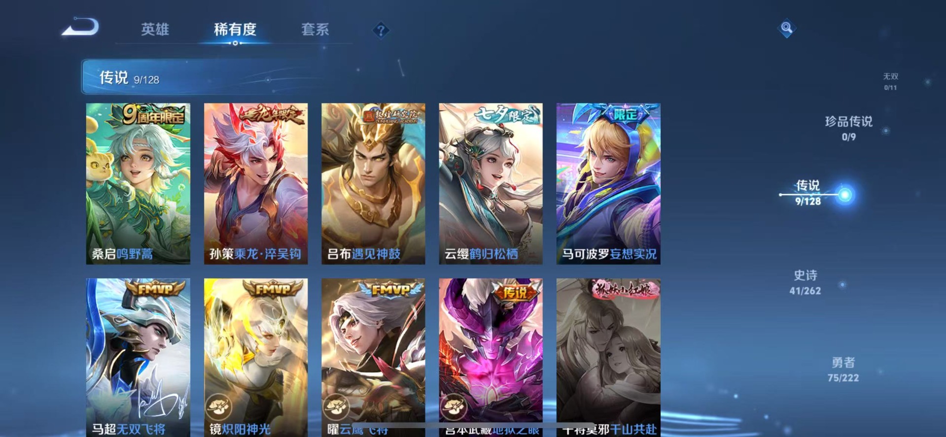 - PX_2068064-06 安卓QQ/至尊星耀/275皮肤/125英雄/1典藏/0珍品无双/0无双/4珍品传说/15传说/66史诗/9稀有英雄 【4 珍品传说】黑崎一护 宫本武藏,怪盗基德 马可波罗,时之奇旅 孙策,江户川柯南 鲁班七号, 【1 典藏皮肤】神鉴启示录 虞姬, 【15 传说皮肤】花朝如约 蔡文姬,无双飞将 马超,浮生妄 夏洛特,鹤羽星尊 诸葛亮,时雨天司 诸葛亮,音你心动 周瑜,炽阳
