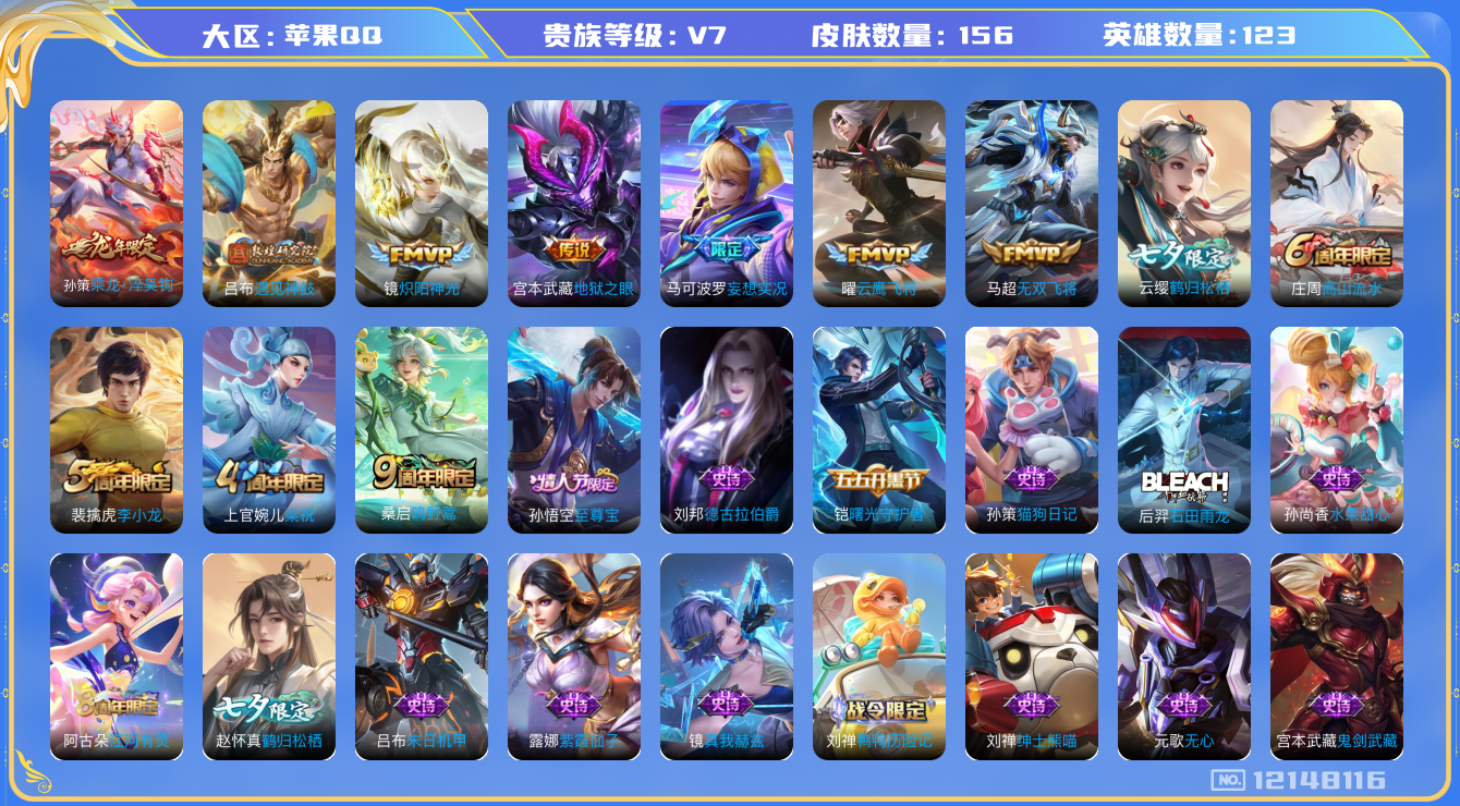 [12148116]V7 9传说 123英雄 156皮肤 可修改实名 女号 优质装备:云鹰飞将(小将军),炽阳神光,地狱之眼,无双飞将,妄想实况,鹤归松栖(云缨),遇见神鼓 传说皮:乘龙·淬吴钩(孙策年限) 珍宝阁皮:蔷薇恋人 限定皮:鸣野蒿,至尊宝,高山流水,梁祝,李小龙 史诗皮:鸭鸭历险记-刘禅,龙之律动,石田雨龙,东方月初,蒙犽顽岩魄,紫霞仙子,真我赫兹(镜),鹤归松栖(赵怀真),江河有灵,百解令(蒙犽),偶像歌手,末日机甲-吕布,猫狗日记-孙策,水果甜心,绅士熊喵,功夫厨神,德古拉伯爵,暗隐猎兽者,鬼剑武藏,心灵战警,乐园奇幻夜,舞动绿茵,纤云弄巧,逐浪之夏,水晶猎龙者,曙光守护者,金属风暴,鹰眼统帅,魅力维加斯,滕王阁序,无心