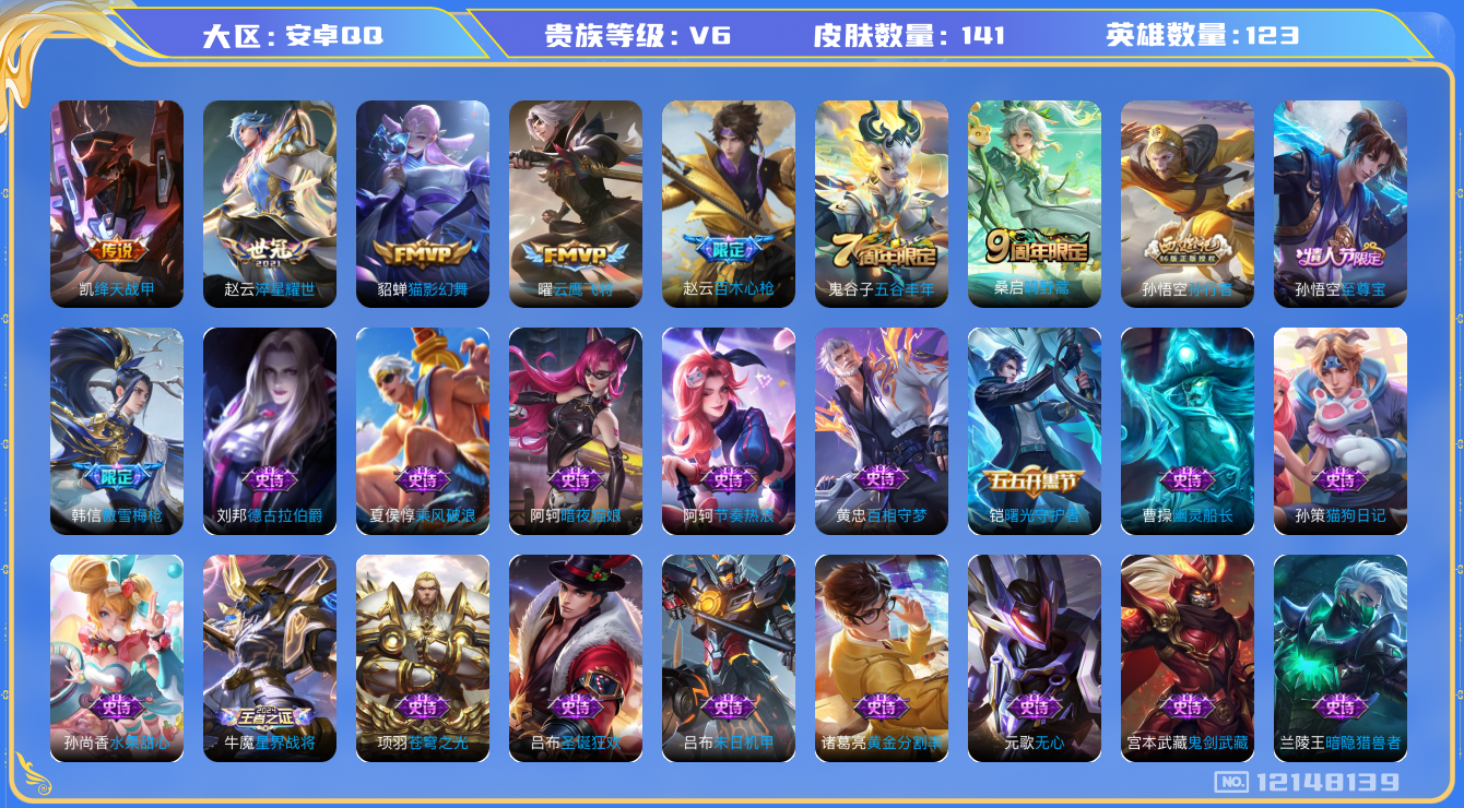 [12148139]V6 5传说 123英雄 141皮肤 可修改实名 优质装备:云鹰飞将(小将军),绛天战甲(鸡嘴战神),猫影幻舞,淬星耀世 珍宝阁皮:胡桃夹子,万物之道 限定皮:鸣野蒿,至尊宝,傲雪梅枪,五谷丰年,孙行者,百木心枪 史诗皮:龙之律动,星界战将,百相守梦-黄忠,苍穹之光,黄金分割率,蒙恬荣光圣徽,暗夜猫娘,末日机甲-吕布,猫狗日记-孙策,节奏热浪,摇滚巨星,水果甜心,星夜王子,德古拉伯爵,暗隐猎兽者,幽灵船长,鬼剑武藏,心灵战警,乘风破浪,逐浪之夏,水晶猎龙者,曙光守护者,热力回旋,金属风暴,原初追逐者,圣诞狂欢,圣诞恋歌,鹰眼统帅,魅力维加斯,无心