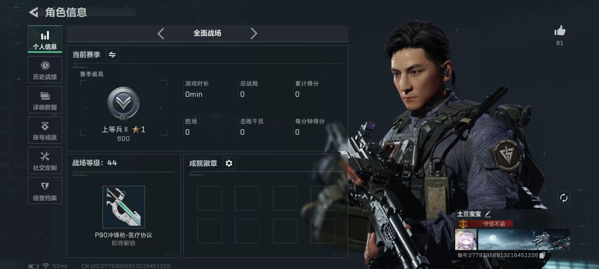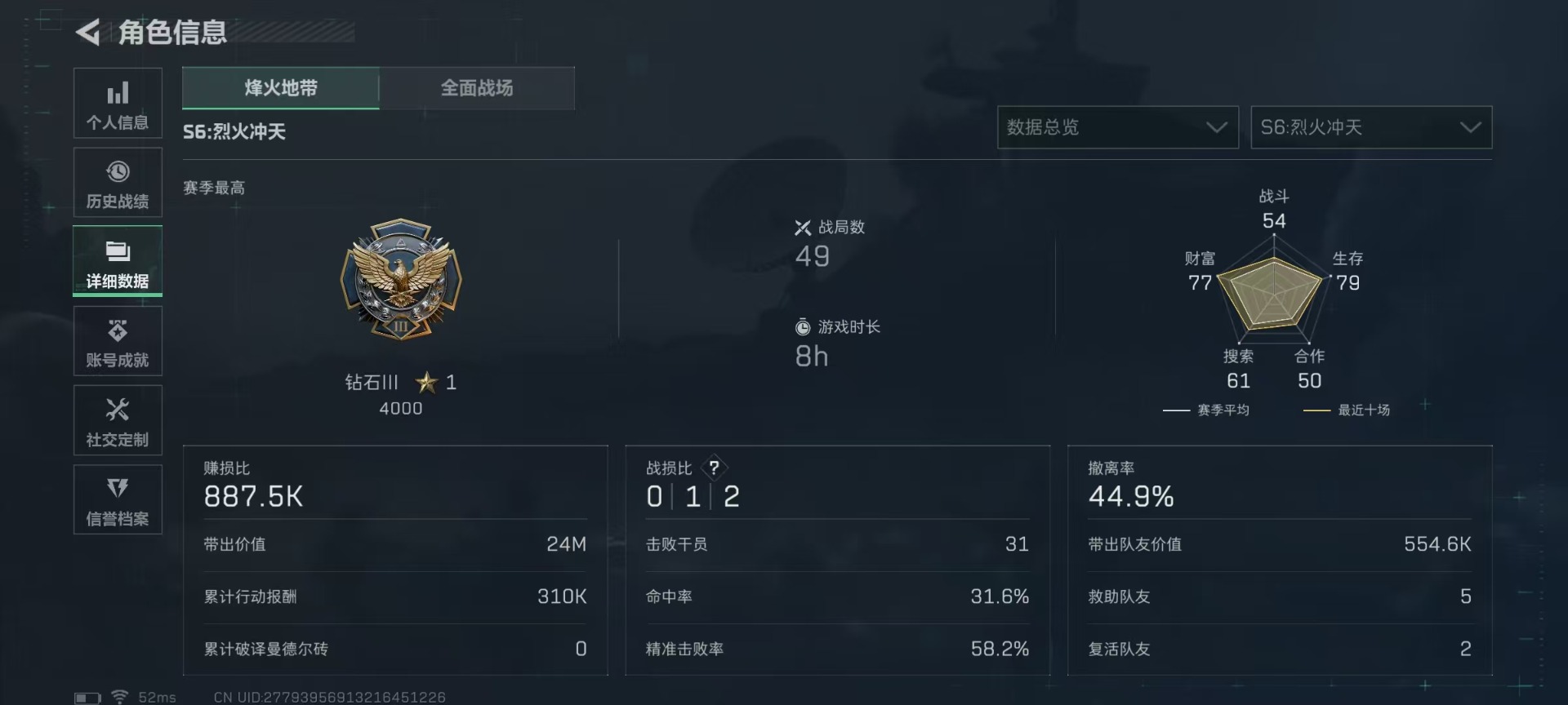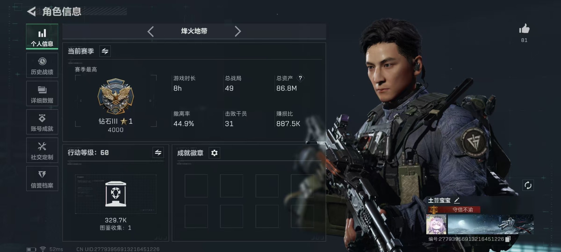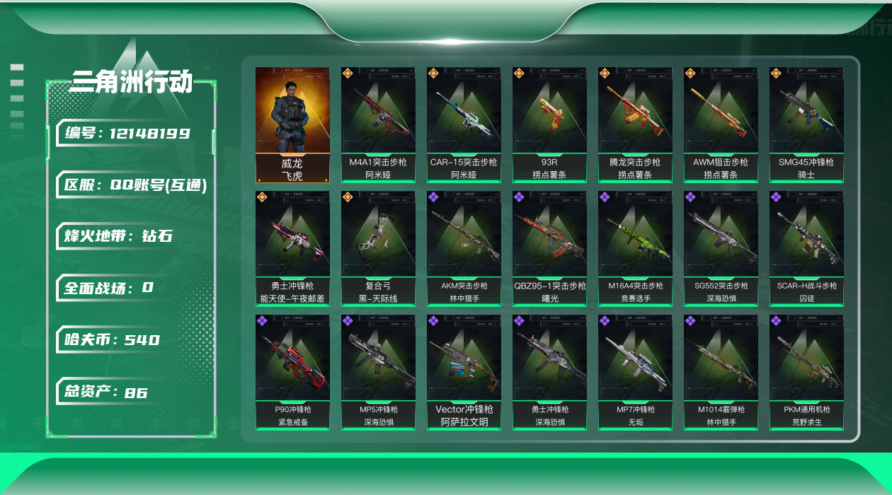 [12148199]总资产:86.8M 1干员外观 8传说枪械 哈夫币:540.920K 可二次 可修改实名 烽火地带段位:钻石 全面战场段位:上等兵 传说武器皮肤:勇士冲锋枪-能天使-午夜邮差,M4A1突击步枪-阿米娅,CAR-15突击步枪-阿米娅,复合弓-黑-天际线,AWM狙击步枪-捞点薯条,腾龙突击步枪-捞点薯条,93R-捞点薯条,SMG45冲锋枪-骑士 史诗武器皮肤:M700狙击步枪-蝮蛇,SV-98狙击步枪-囚徒,SV-98狙击步枪-林中猎手,M1014霰弹枪-林中猎手,PKM通用机枪-荒野求生,SCAR-H战斗步枪-囚徒,SVD狙击步枪-荒野求生,MP7冲锋枪-无垢,M16A4突击步枪-竞赛选手,P90冲锋枪-紧急戒备,QJB201轻机枪-Old Habits,沙漠之鹰-曙光,QBZ95-1突击步枪-曙光,Vector冲锋枪-阿萨拉文明,M700狙击步枪-竞技风,MP5冲锋枪-深海恐惧,勇士冲锋枪-深海恐惧,SG552突击步枪-深海恐惧,AKM突击步枪-林中猎手,PKM通用机枪-英雄 干员外观:威龙-飞虎