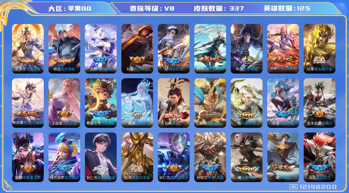 [12148200]V8 2典藏 39传说 125英雄 337皮肤 可修改实名 优质装备:九霄神辉(木兰典藏),弑枪猎影(韩信典藏),黄金狮子座,云鹰飞将(小将军),黄金白羊座,炽阳神光,一念神魔,仲夏夜之梦(大飞蛾),零号·赤焰,李逍遥,乞巧织情,时之恋人-刘备(电焊工),超时空战士-狄仁杰,花朝如约(花篮子),无双飞将,妄想实况,鹤归松栖(云缨),惊梅引,遇见神鼓,鲁班七号-时之奇旅,大乔-时之奇旅,永恒水手月亮,夜礼服假面,霜月吟,澜逐花归海,琥珀纪元铠,琥珀纪元马超,黄金天蝎座 传说皮:乘龙·问璇玑(孙尚香年限),乘龙·铭钟鼎(赵云年限),乘龙·淬吴钩(孙策年限),貂蝉曦玄引,吕布曦玄引,落雪白狼 珍宝阁皮:妄想食味,胡桃夹子 限定皮:愿照·山河定(司空震年限),鸣野蒿,夏侯惇霜北刀,傲雪梅枪,白晶晶,至美·乘鲤谣,高山流水,诗剑行,五谷丰年,梁祝,御风骁将(吕布年限),如梦令-嫦娥,如梦令-后羿,默契交锋-花木兰,猪悟能,引擎之心,寅虎·赤拳(老虎年限),深海之息(深海大菠萝),神器·万象笔,天降福星,山海·玄木吟(马可年限) 史诗皮:器灵·浮梦炉,化蝶舞,龙之律动,雪豹·霜爪,怒海争锋,破空之剑,战舞者,蒙犽顽岩魄,埋骨钱,芈月浮光幕影,海诺心动手记,琥珀纪元伽罗,蔬乡物语(鲁班七号),曹操夜都魔契,超元猎域,乘龙·聚宝船(安琪拉年限),乘龙·忆丹青(大乔年限),遇见神鹿,紫霞仙子,苍穹之光,黄金分割率,特工魅影,千年之狐,永昼,江河有灵,匿光侦查者,末日机甲-莱西奥,鹤归松栖(赵怀真),真我赫兹(镜),浮梦罗烟,魅语,百解令(蒙犽),高渐离燃音魔法,蒙恬荣光圣徽,无限星赏官,冰冠公主,青蛇,偶像歌手,晚萤,电玩·爆裂旋风,暗夜猫娘,末日机甲-吕布,猫狗日记-孙策,乱世虎臣,节奏热浪,修罗,女仆咖啡,摇滚巨星,水果甜心,绅士熊喵,天才门将,星夜王子,心灵骇客,功夫厨神,暗隐猎兽者,幽灵船长,鬼剑武藏,暗渊魔法,心灵战警,天秀·启明,舞动绿茵,地狱岩魂,纤云弄巧,拒霜思,缤纷独角兽,乘风破浪,逐浪之夏,月团寄思,水晶猎龙者,曙光守护者,热力回旋,箭羽风息,金属风暴,原初追逐者,圣诞狂欢,圣诞恋歌,鹰眼统帅,暗夜贵公子,魅力维加斯,黎明之约,无心,未来纪元-赵云