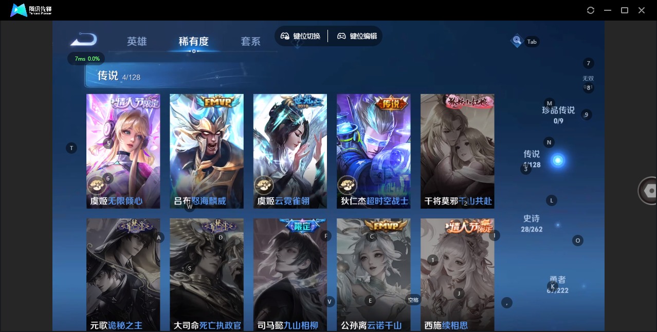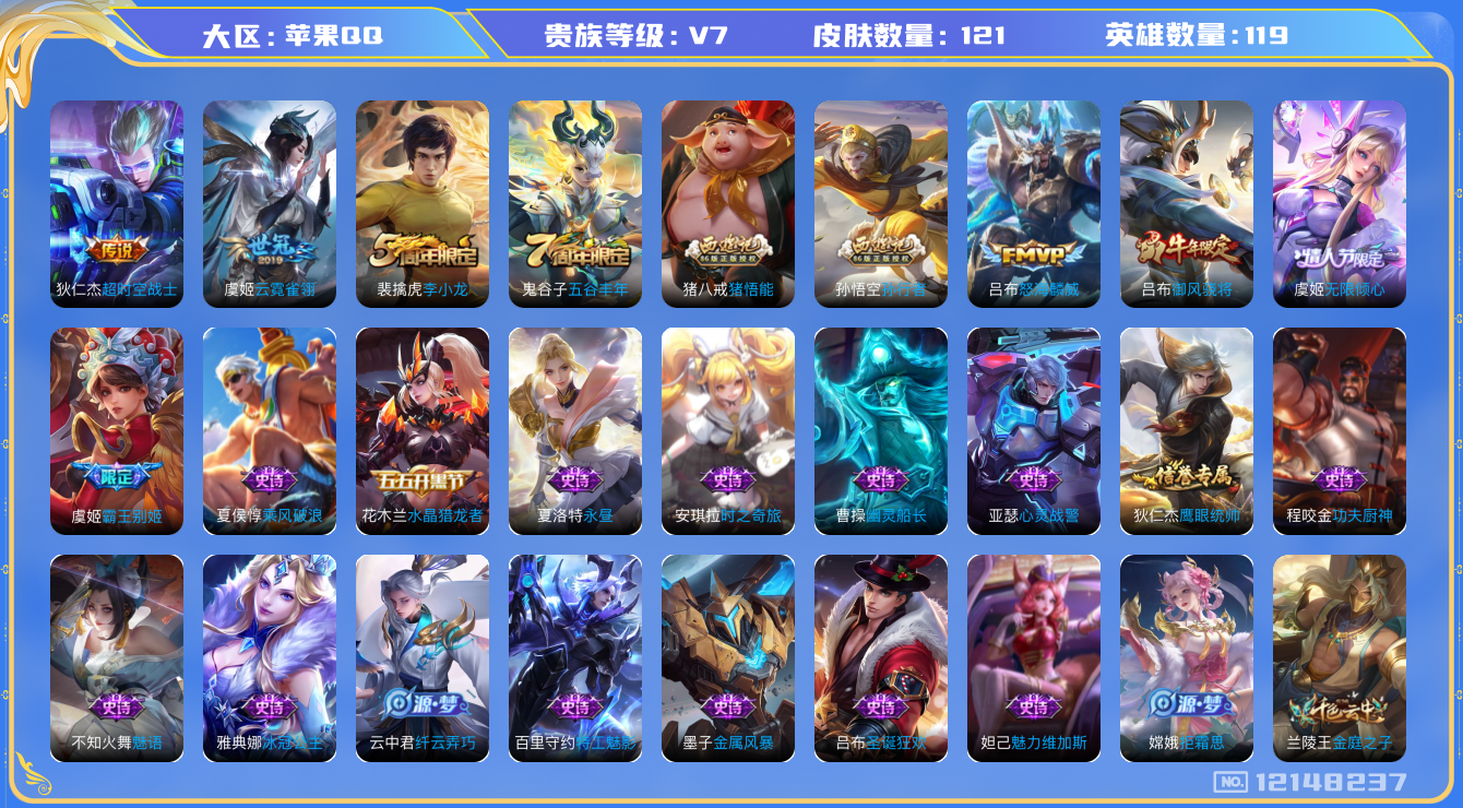 [12148237]V7 4传说 119英雄 121皮肤 可修改实名 优质装备:云霓雀翎,超时空战士-狄仁杰 限定皮:无限倾心-虞姬,怒海麟威,五谷丰年,御风骁将(吕布年限),李小龙,霸王别姬-虞姬,孙行者,猪悟能 史诗皮:特工魅影,永昼,冰冠公主,魅语,时之奇旅-安琪拉,功夫厨神,幽灵船长,心灵战警,纤云弄巧,拒霜思,乘风破浪,水晶猎龙者,金属风暴,圣诞狂欢,鹰眼统帅,魅力维加斯
