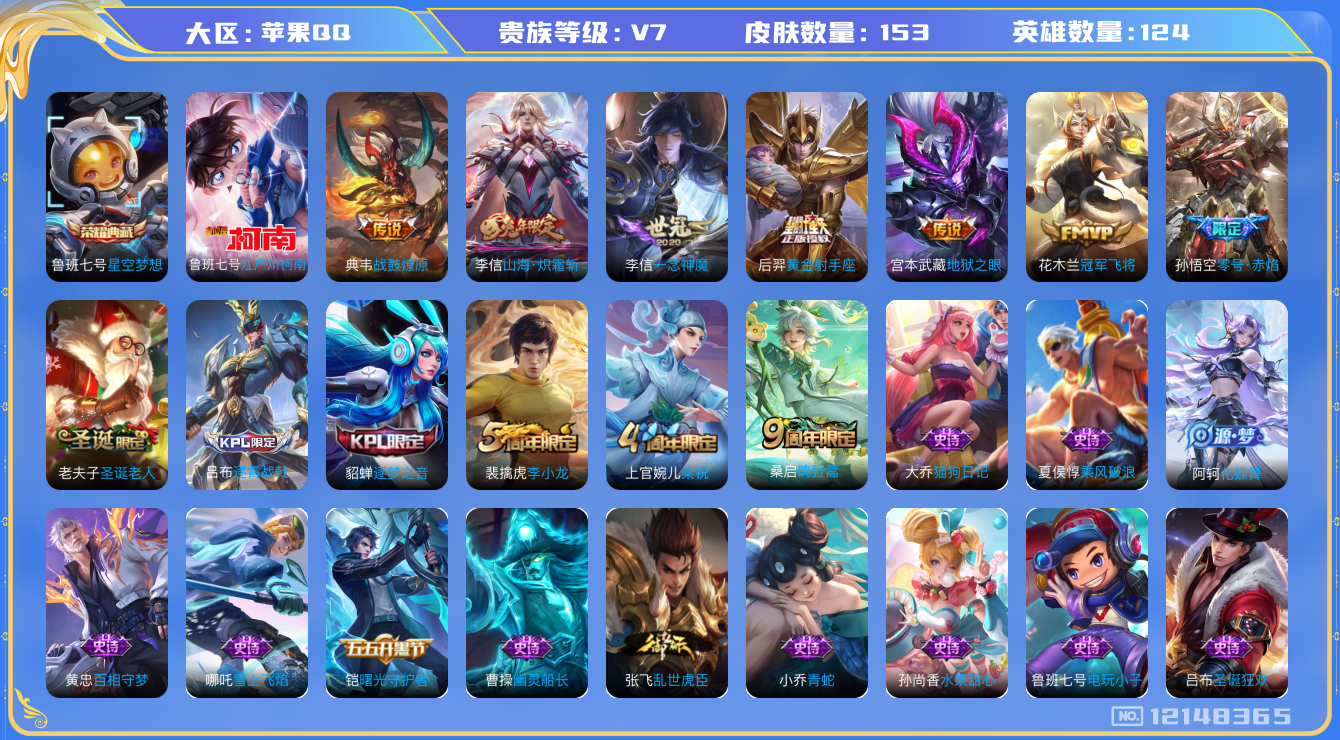 [12148365]V7 1典藏 1珍品传说 8传说 124英雄 153皮肤 可修改实名 优质装备:星空梦想(太空人),江户川柯南,黄金射手座,冠军飞将,一念神魔,零号·赤焰,地狱之眼,山海·炽霜斩(李信年限) 传说皮:典韦战鼓燎原 珍宝阁皮:玩趣恶龙 限定皮:逐霄战戟,鸣野蒿,梁祝,逐梦之音,李小龙,圣诞老人 史诗皮:化蝶舞,龙之律动,破空之剑,百相守梦-百里守约,百相守梦-黄忠,紫霞仙子,电玩小子(小书包),千年之狐,蒙恬荣光圣徽,冰冠公主,青蛇,末日机甲-吕布,猫狗日记-大乔,乱世虎臣,修罗,女仆咖啡,水果甜心,星夜王子,功夫厨神,暗隐猎兽者,幽灵船长,鬼剑武藏,纤云弄巧,乘风破浪,逐浪之夏,水晶猎龙者,曙光守护者,金属风暴,原初追逐者,圣诞狂欢,圣诞恋歌,鹰眼统帅,魅力维加斯,黎明之约,雪上飞焰,赏金猎手,未来纪元-赵云