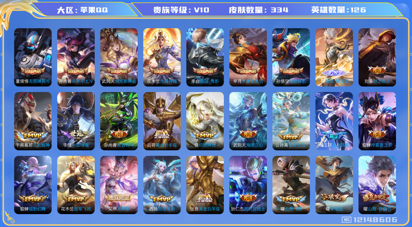 [12148606]V10 7典藏 1无双 35传说 126英雄 334皮肤 典藏英雄武则天 可修改实名 优质装备:倪克斯神谕(宇宙婆娘),无限飓风号(高达),杀手不太冷,大秦宣太后,鸣剑·曳影,全息碎影(猴子典藏),九霄神辉(木兰典藏),器灵·螭龙剑,黄金射手座,冠军飞将,云鹰飞将(小将军),黄金白羊座,猫影幻舞,久胜战神,炽阳神光,一念神魔,云霓雀翎,末日机甲-孙尚香(绿蚂蚱),仲夏夜之梦(大飞蛾),海洋之心,李逍遥,时之恋人-刘备(电焊工),游龙清影(小青龙),超时空战士-狄仁杰,山海·苍雷引(电光曜子),艾琳觅芳踪 传说皮:云诺千山,星之鸣奏 珍宝阁皮:蔷薇恋人,女武神 限定皮:愿照·千秋盛(女娲年限),至尊宝,白虎志(电光耗子),凤求凰(白切鸡),太华(伽罗年限),寅虎·展翼(孙膑年限),前尘镜,绯月行,时之彼端,白晶晶,时雨天司(水龙头),神威(电光马子),飞衡(韩信年限),玄嵩(庄周年限),怒海麟威,五谷丰年,冰锋战神,幽恒(沐浴露),武圣,天狼运算者,御风骁将(吕布年限),天狼狩猎者,龙胆,逐梦之星,烈魂,岱宗(典韦年限),天狼溯光者,虎魄,奔雷神使(牛魔年限),祈雪灵祝(雪兔子),天狼绘梦者,李小龙,逐梦之影,逐梦之光,如梦令-后羿,霸王别姬-项羽,霸王别姬-虞姬,奇迹圣诞,默契交锋-兰陵王,默契交锋-花木兰,一生所爱,大圣娶亲,天魔缭乱,青春决赛季,冰霜恋舞曲,云端筑梦师,蜜橘之夏,神奇女侠,匿光追影者,寅虎·御盾(廉颇年限),寅虎·瑞焰(虎皮蛋子),寅虎·心曲(虎婆),寅虎·赤拳(老虎年限),时之祈愿-云中君,玉兔公主,山海·玄木吟(马可年限) 史诗皮:化蝶舞,紫霞仙子,苍穹之光,电玩小子(小书包),白龙吟,特工魅影,千年之狐,永昼,魅语,蒙恬荣光圣徽,无限星赏官,冰冠公主,偶像歌手,晚萤,暗夜猫娘,末日机甲-吕布,猫狗日记-孙策,时之恋人-孙尚香,乱世虎臣,节奏热浪,修罗,水果甜心,绅士熊喵,天才门将,星夜王子,心灵骇客,功夫厨神,德古拉伯爵,暗隐猎兽者,幽灵船长,鬼剑武藏,心灵战警,舞动绿茵,地狱岩魂,纤云弄巧,繁星吟游(呼啦呼啦),拒霜思,缤纷独角兽,乘风破浪,逐浪之夏,水晶猎龙者,曙光守护者,箭羽风息,金属风暴,原初追逐者,圣诞狂欢,圣诞恋歌,鹰眼统帅,暗夜贵公子,魅力维加斯,黎明之约,寅虎·御盾