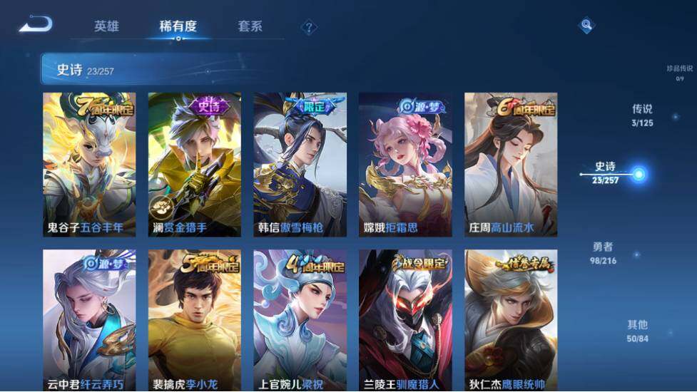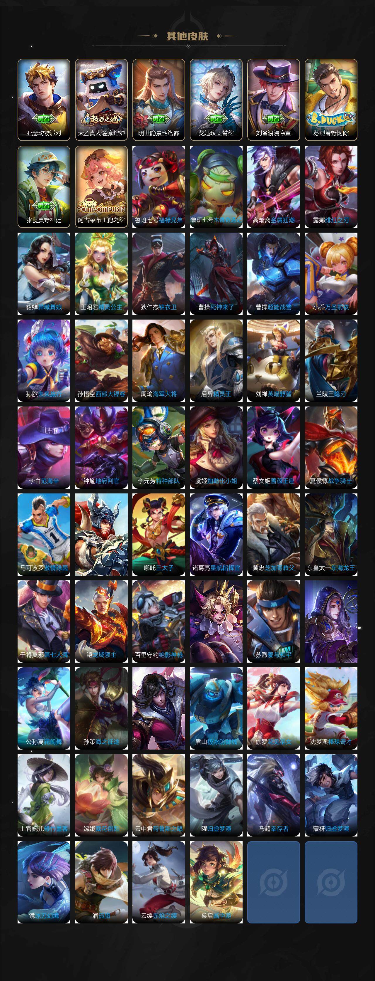 【限定皮肤】:白起狰,虞姬夏日便利店,姜子牙天穹之誓,狄仁杰阴阳师,赵云皇家上将,庄周高山流水,芈月重明,周瑜赤莲之焰,夏侯惇朔风刀,甄姬游园惊梦,曹操烛龙,典韦穷奇,狄仁杰魔术师,狄仁杰万华元夜,达摩沙漠行僧,项羽海滩派对,老夫子醍醐杖,程咬金演武夺筹,韩信傲雪梅枪,兰陵王驯魔猎人,兰陵王金庭之子,孙悟空至尊宝,孙悟空零号赤焰,牛魔御旌,李元芳云中旅人,钟馗驱傩正仪,杨玉环遇见飞天,干将莫邪胡桃夹子,太乙真人饕餮,鬼谷子原初探秘者,鬼谷子五谷丰年,苏烈千军破阵,弈星混沌棋,沈梦溪大漠名商,明世隐疑决卦,裴擒虎李小龙,狂铁御狮,米莱狄御霄,云中君纤云弄巧,盾山御銮,上官婉儿梁祝,嫦娥拒霜思,桑启海盐诗旅,刘邦剑破天穹,刘备异域游侠,周瑜熔金海岸