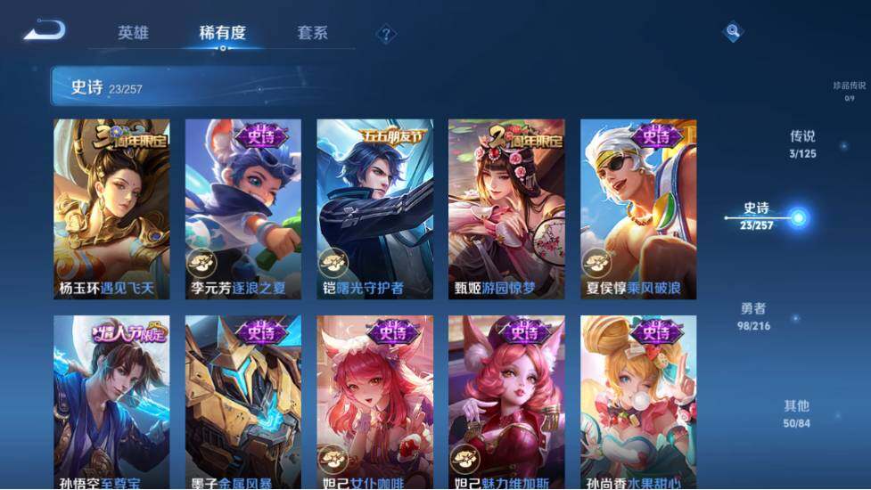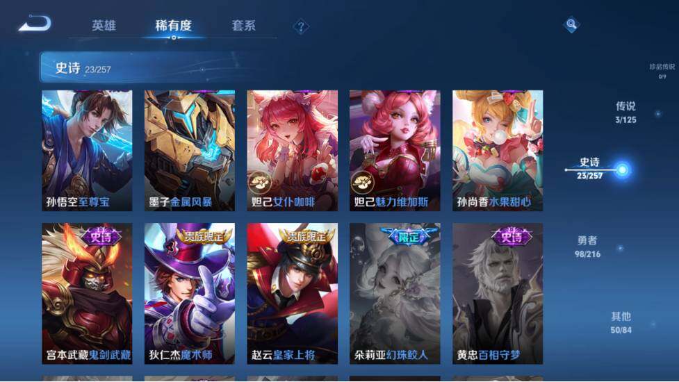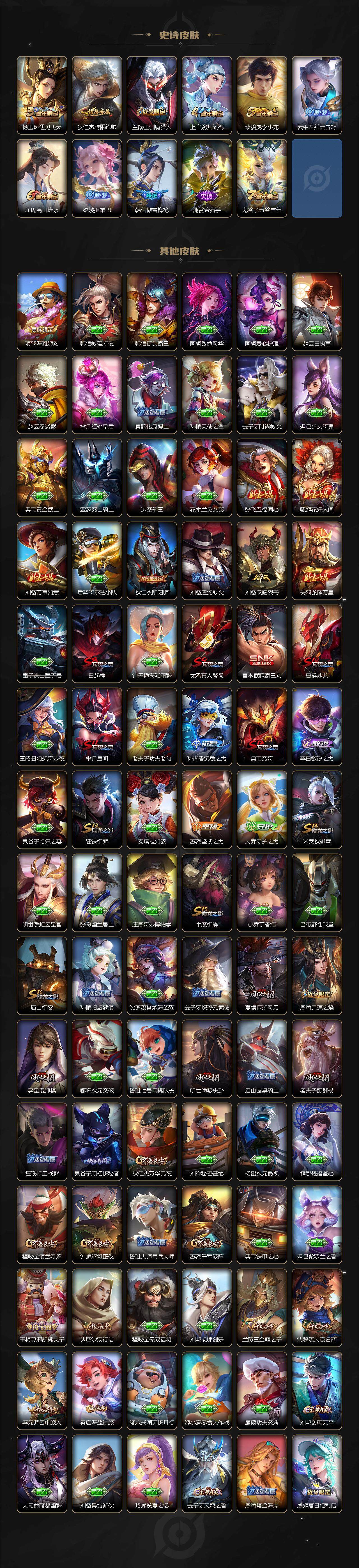 【史诗皮肤】:赵云皇家上将,狄仁杰魔术师,宫本武藏鬼剑武藏,孙尚香水果甜心,妲己魅力维加斯,妲己女仆咖啡,墨子金属风暴,孙悟空至尊宝,夏侯惇乘风破浪,甄姬游园惊梦,铠曙光守护者,李元芳逐浪之夏,杨玉环遇见飞天,狄仁杰鹰眼统帅,兰陵王驯魔猎人,上官婉儿梁祝,裴擒虎李小龙,云中君纤云弄巧,庄周高山流水,嫦娥拒霜思,韩信傲雪梅枪,澜赏金猎手,鬼谷子五谷丰年