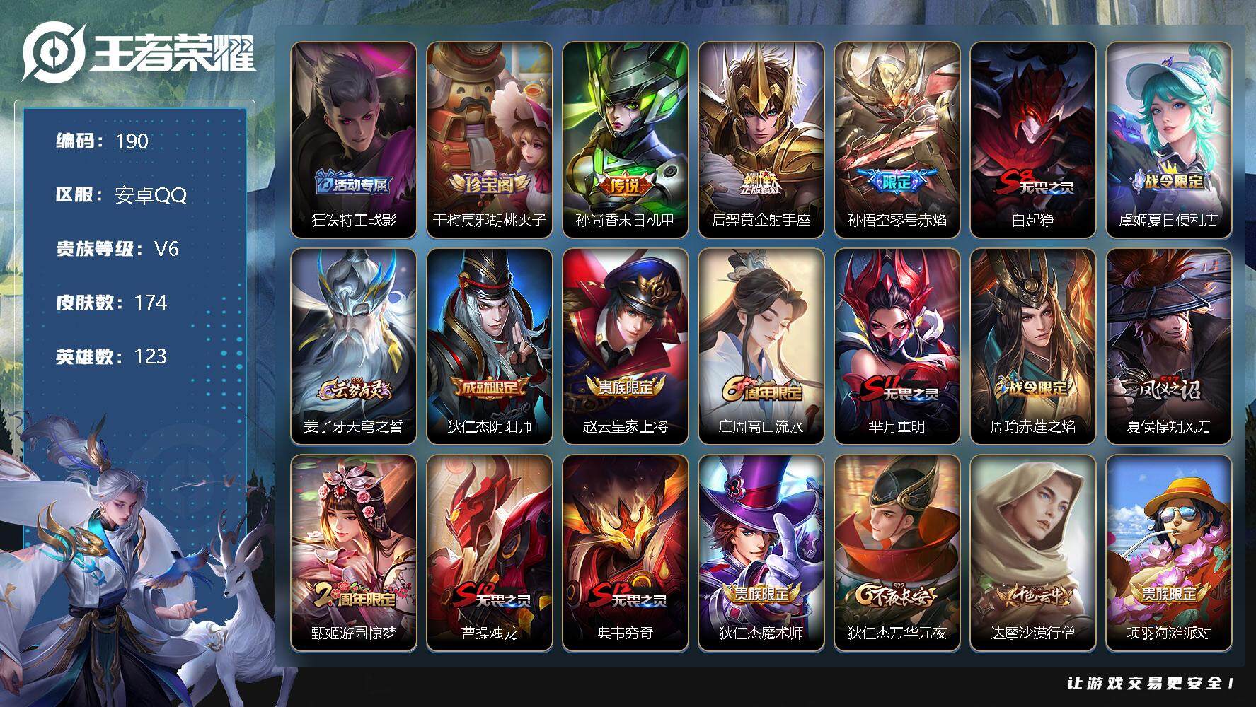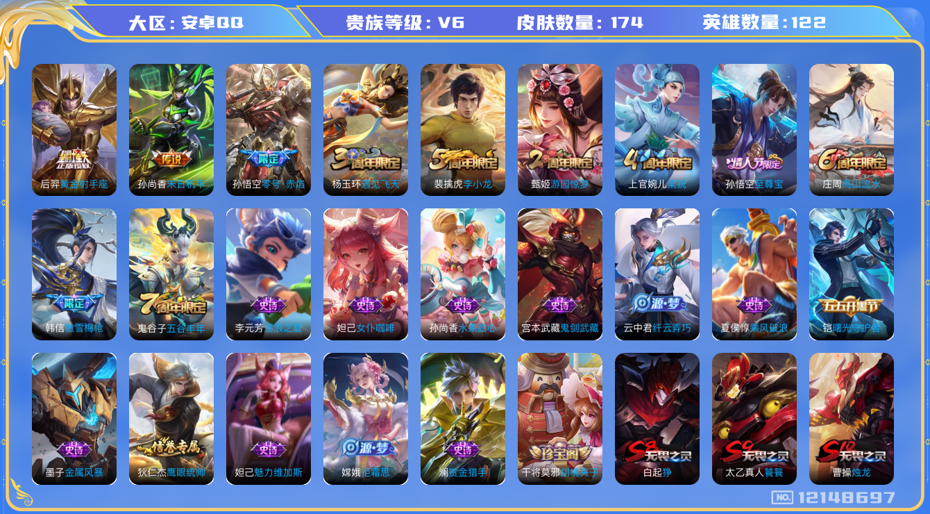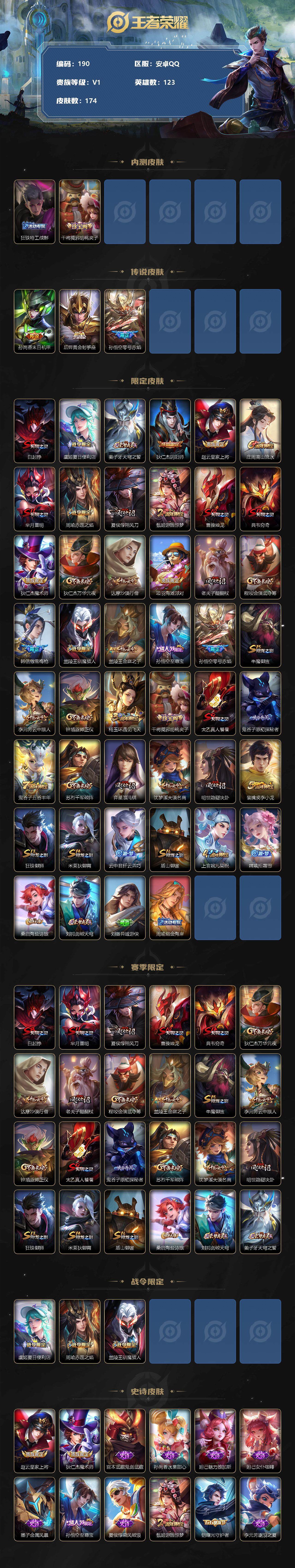 [12148697]【商品标题】:安卓Q-V1-永恒钻石V段位-123英雄-174皮肤-0典藏-0珍品无双-0无双-0珍品传说-3传说-23史诗