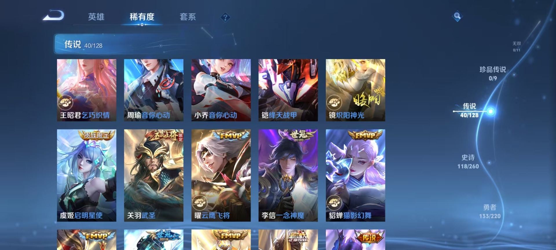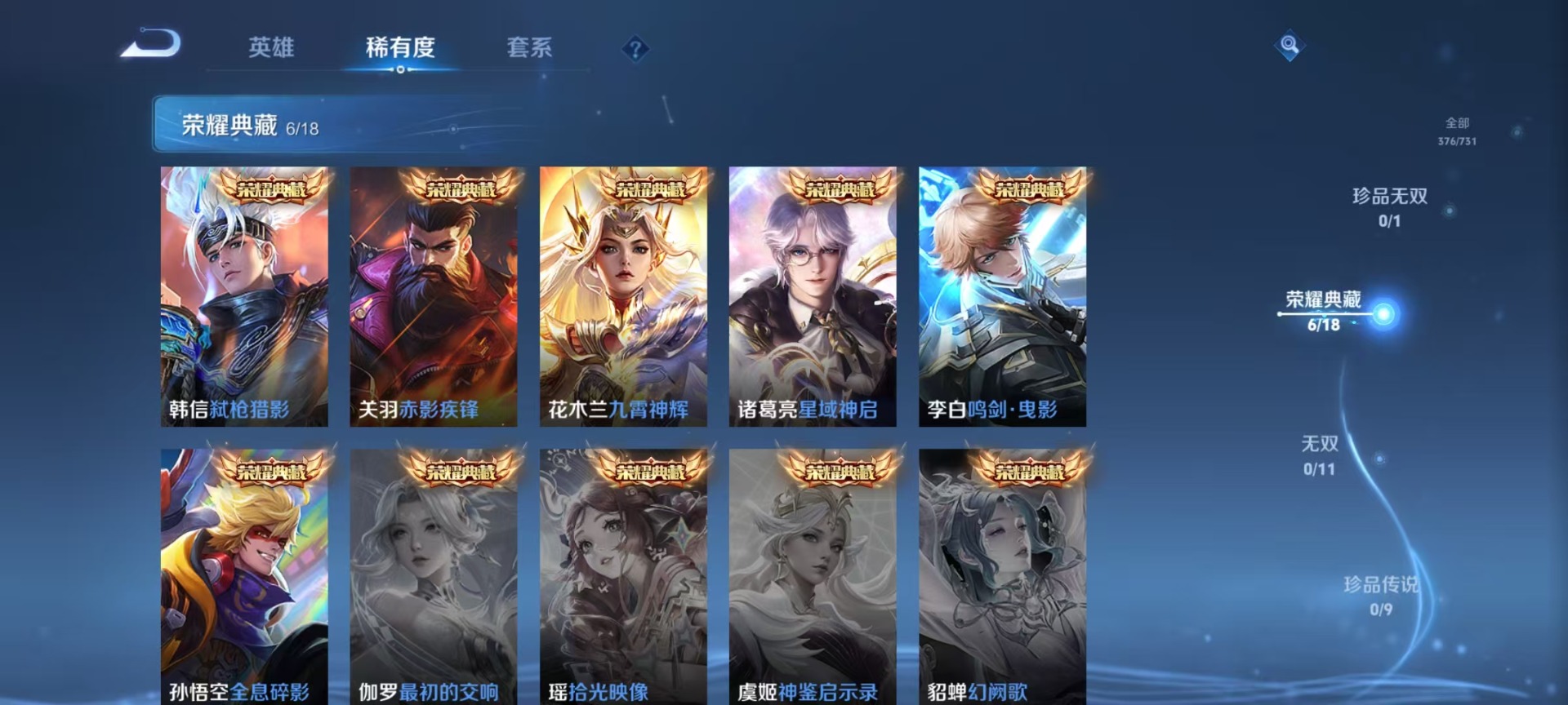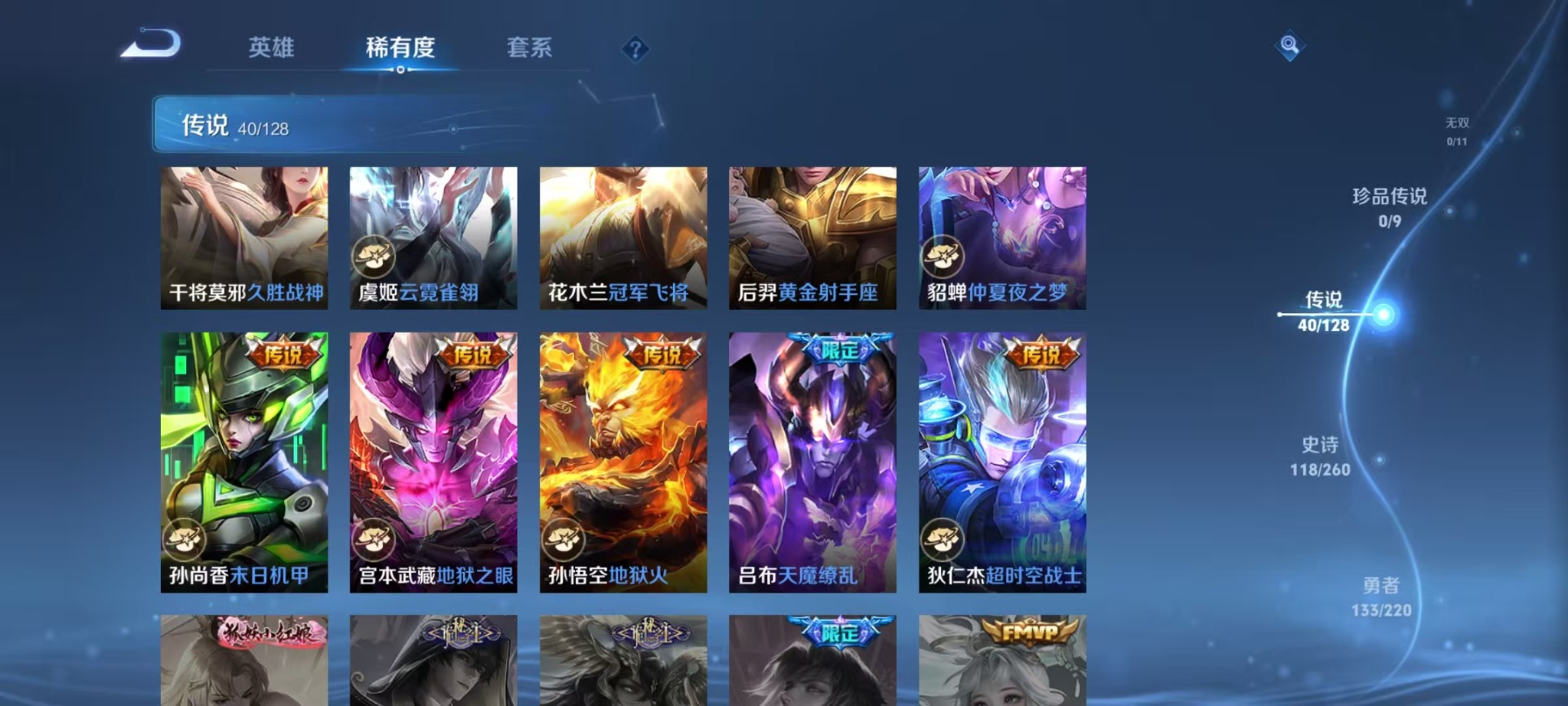 黄忠烈魂,盾山梦圆繁星,典韦岱宗,后羿无尽星芒,兰陵王影龙天霄,鲁班大师匿光启智者,裴擒虎天狼狩猎者,李白诗剑行,花木兰瑞麟志,马可波罗深海之息,西施至美·乘鲤谣,桑启鸣野蒿,孙悟空孙行者,孙悟空大圣娶亲,芈月白晶晶,妲己时之奇旅,韩信傲雪梅枪,百里守约朱雀志,墨子降魔,关羽武圣,橘右京枫霜尽