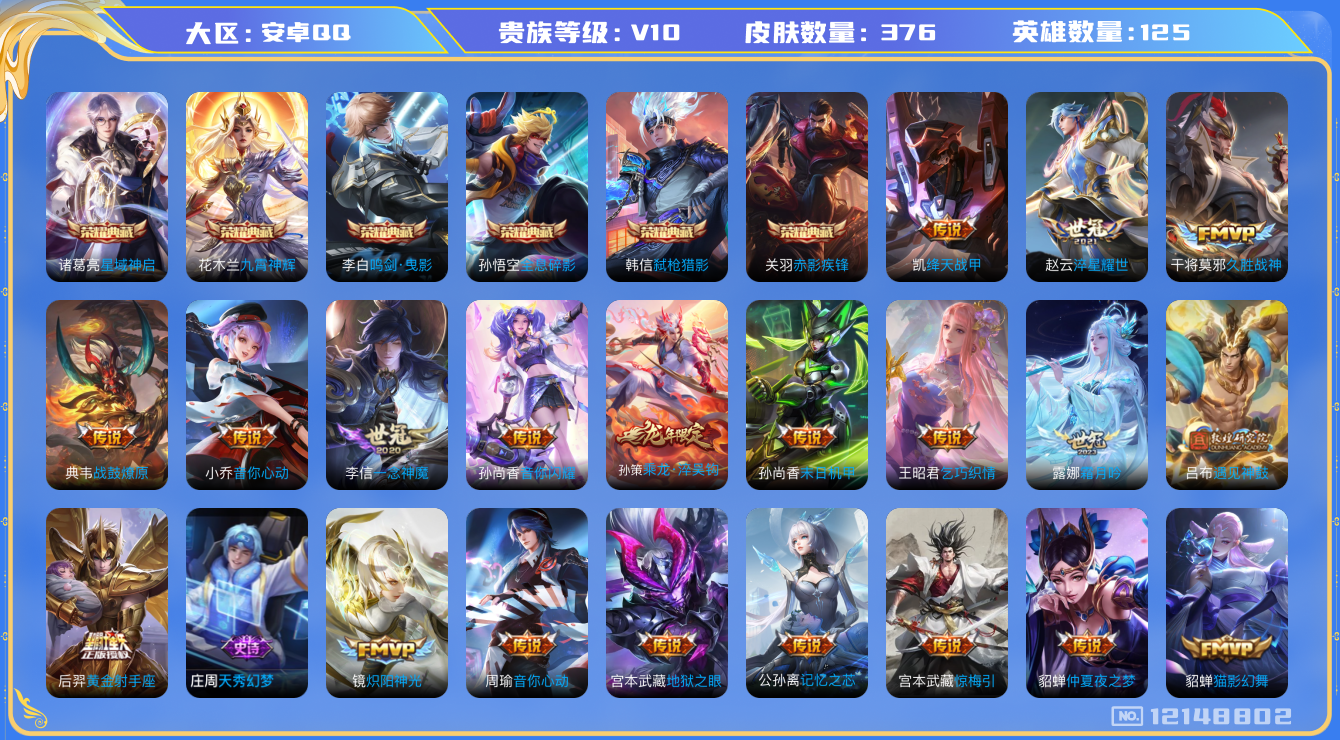 [12148802]V10 6典藏 40传说 125英雄 376皮肤 可修改实名 优质装备:鸣剑·曳影,全息碎影(猴子典藏),星域神启(倪克斯贼亮),九霄神辉(木兰典藏),赤影疾锋,弑枪猎影(韩信典藏),黄金射手座,冠军飞将,云鹰飞将(小将军),绛天战甲(鸡嘴战神),猫影幻舞,久胜战神,炽阳神光,一念神魔,云霓雀翎,末日机甲-孙尚香(绿蚂蚱),地狱火,仲夏夜之梦(大飞蛾),音你心动-小乔,地狱之眼,音你心动-周瑜,乞巧织情,淬星耀世,超时空战士-狄仁杰,无双飞将,音你闪耀(rap皮),碎云,天秀幻梦,神器·狴犴令,记忆之芯(机甲兔),灼幽烈阳,惊梅引,遇见神鼓,霜月吟,艾琳觅芳踪,涂山容容 传说皮:乘龙·淬吴钩(孙策年限),典韦战鼓燎原 珍宝阁皮:妄想食味 限定皮:鸣野蒿,傲雪梅枪,白晶晶,瑞麟志(木兰年限),至美·乘鲤谣,影龙天霄,遇见飞天,诗剑行,怒海麟威,降魔,五谷丰年,武圣,天狼狩猎者,烈魂,岱宗(典韦年限),朱雀志(守约年限),孙行者,大圣娶亲,天魔缭乱,无尽星芒,深海之息(深海大菠萝),枫霜尽,匿光启智者,时之奇旅-妲己,梦圆繁星 史诗皮:鸭鸭历险记-刘禅,化蝶舞,灵蛊蚀心,龙之律动,小牛鸭,石田雨龙,怒海争锋,琥珀纪元伽罗,决胜骁骑,蔬乡物语(鲁班七号),超元猎域,百相守梦-百里守约,百相守梦-黄忠,遇见神鹿,紫霞仙子,苍穹之光,电玩小子(小书包),白龙吟,黄金分割率,特工魅影,千年之狐,永昼,江河有灵,匿光侦查者,真我赫兹(镜),真我赫兹(百里守约),完美假期,闲日渔趣,魅语,百解令(蒙犽),高渐离燃音魔法,无限星赏官,冰冠公主,青蛇,偶像歌手,白蛇,晚萤,暗夜猫娘,龙骑士(小龙虾),末日机甲-吕布,猫狗日记-孙策,猫狗日记-大乔,时之恋人-孙尚香,乱世虎臣,节奏热浪,修罗,女仆咖啡,摇滚巨星,水果甜心,绅士熊喵,天才门将,星夜王子,心灵骇客,时之奇旅-安琪拉,功夫厨神,德古拉伯爵,暗隐猎兽者,幽灵船长,鬼剑武藏,暗渊魔法,心灵战警,乐园奇幻夜,天秀·启明,舞动绿茵,地狱岩魂,诗语江南,纤云弄巧,拒霜思,缤纷独角兽,乘风破浪,逐浪之夏,月团寄思,水晶猎龙者,曙光守护者,箭羽风息,唤灵魅影,金属风暴,圣诞狂欢,圣诞恋歌,鹰眼统帅,暗夜贵公子,魅力维加斯,雪上飞焰,赏金猎手,天秀·音浪,天秀幻梦,千筹问战,无心,未来纪元-赵云