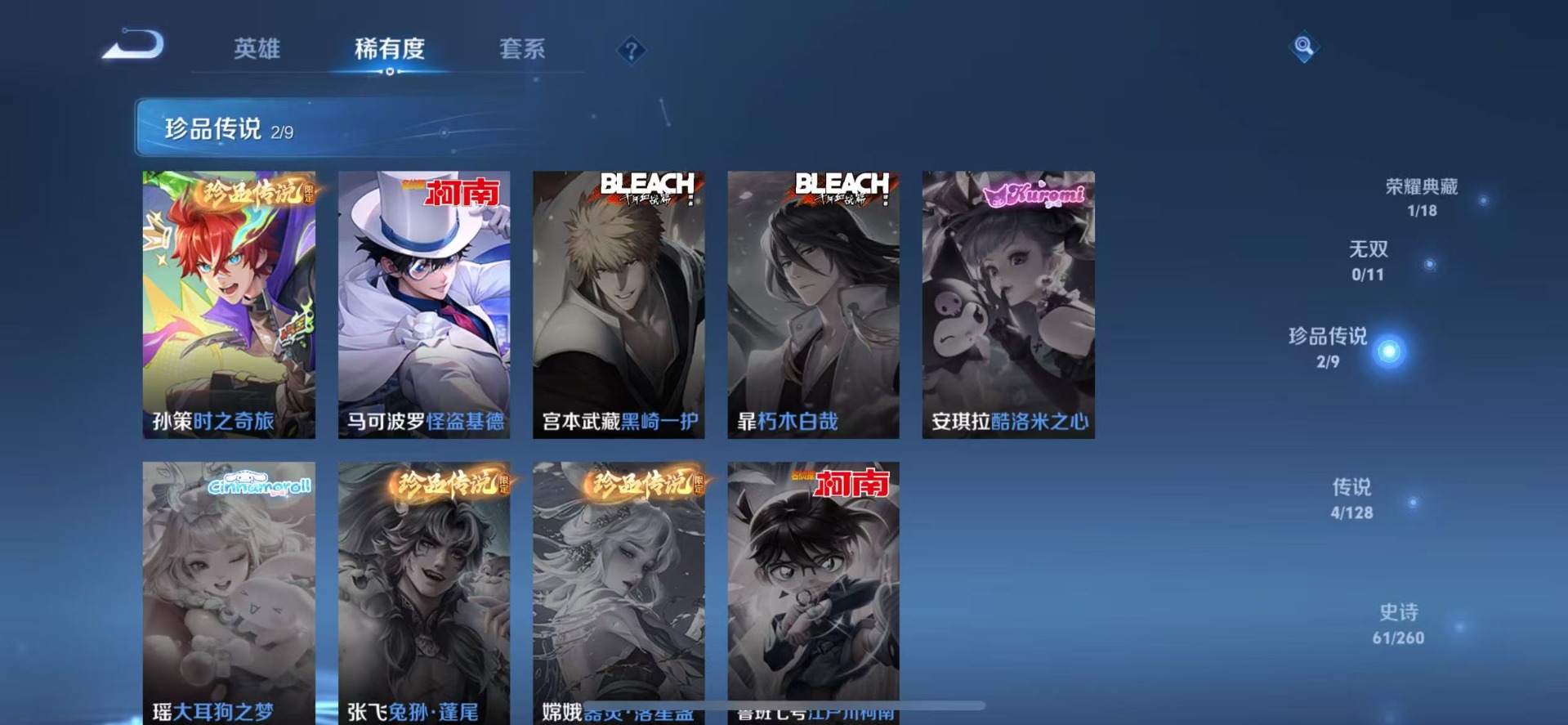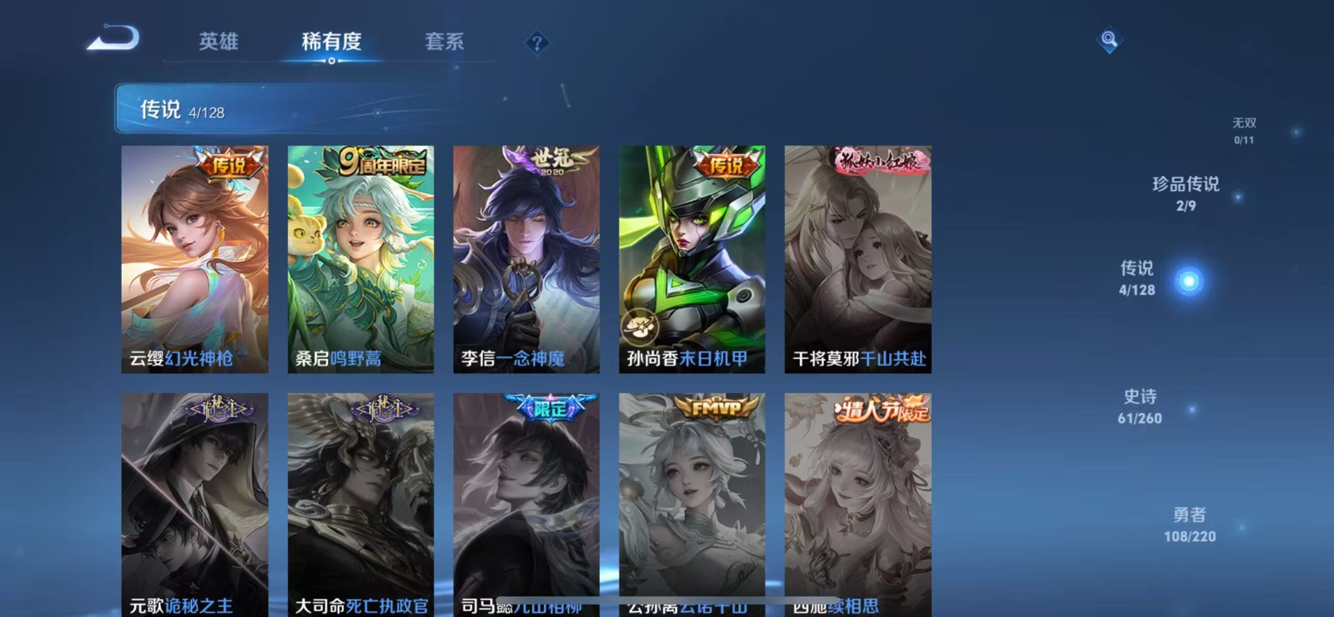 - PX_2091698-27 安卓QQ/无双王者/193皮肤/125英雄/1典藏/0珍品无双/0无双/1珍品传说/13传说/49史诗/9稀有英雄 【1 珍品传说】时之奇旅 孙策, 【1 典藏皮肤】赤影疾锋 关羽, 【13 传说皮肤】碎云 百里守约,无双飞将 马超,地狱之眼 宫本武藏,乞巧织情 王昭君,时之恋人 刘备,黄金狮子座 达摩,末日机甲 孙尚香,一念神魔 李信,绛天战甲 铠,愿照·九州拓 澜,