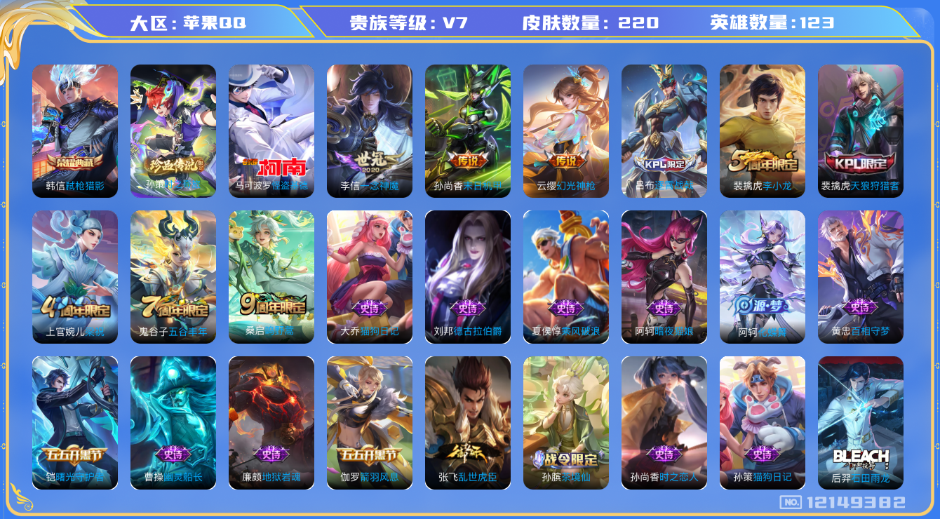 [12149382]V7 1典藏 2珍品传说 4传说 123英雄 220皮肤 可修改实名 优质装备:弑枪猎影(韩信典藏),怪盗基德,一念神魔,末日机甲-孙尚香(绿蚂蚱),涂山容容 珍品传说:时之奇旅-孙策 传说皮:幻光神枪 珍宝阁皮:妄想食味,玩趣恶龙 限定皮:逐霄战戟,鸣野蒿,五谷丰年,梁祝,天狼狩猎者,李小龙 史诗皮:鸭鸭历险记-刘禅,器灵·浮梦炉,化蝶舞,星界战将,龙之律动,雪豹·霜爪,石田雨龙,百相守梦-周瑜,茶境仙,破空之剑,百相守梦-百里守约,星界特工,百相守梦-黄忠,白龙吟,特工魅影,千年之狐,冰冠公主,暗夜猫娘,猫狗日记-孙策,猫狗日记-大乔,时之恋人-孙尚香,乱世虎臣,修罗,摇滚巨星,水果甜心,星夜王子,心灵骇客,功夫厨神,德古拉伯爵,暗隐猎兽者,幽灵船长,鬼剑武藏,暗渊魔法,舞动绿茵,地狱岩魂,纤云弄巧,繁星吟游(呼啦呼啦),乘风破浪,逐浪之夏,水晶猎龙者,曙光守护者,箭羽风息,金属风暴,圣诞恋歌,鹰眼统帅,黎明之约,无心,未来纪元-赵云