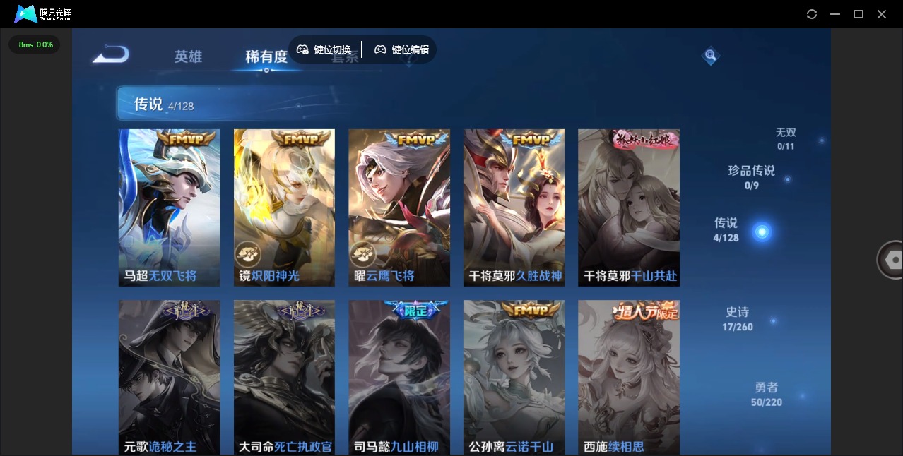 - [11677402]V6 6传说 97英雄 100皮肤 可修改实名 优质装备:云鹰飞将(小将军),绛天战甲(鸡嘴战神),炽阳神光,一念神魔,李逍遥 珍宝阁皮:万物之道,玩趣恶龙 限定皮:白虎志(电光耗子),五谷丰年,李小龙 史诗皮:紫霞仙子,黄金分割率,江河有灵,冰冠公主,末日机甲-吕布,猫狗日记-孙策,乱世虎臣,修罗,女仆咖啡,水果甜心,星夜王子,心灵骇客,纤云弄巧,拒霜思,缤纷独角兽,乘风破浪,金属风暴,鹰眼统帅,魅力维加斯,未来纪元-赵云