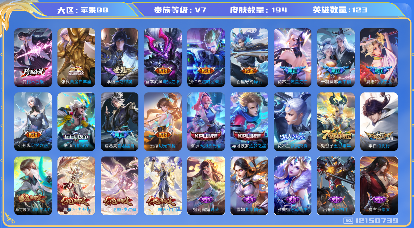 [12150739]【商品标题】:苹果Q-V6-最强王者段位-124英雄-194皮肤-0典藏-0珍品无双-0无双-1珍品传说-16传说-49史诗
