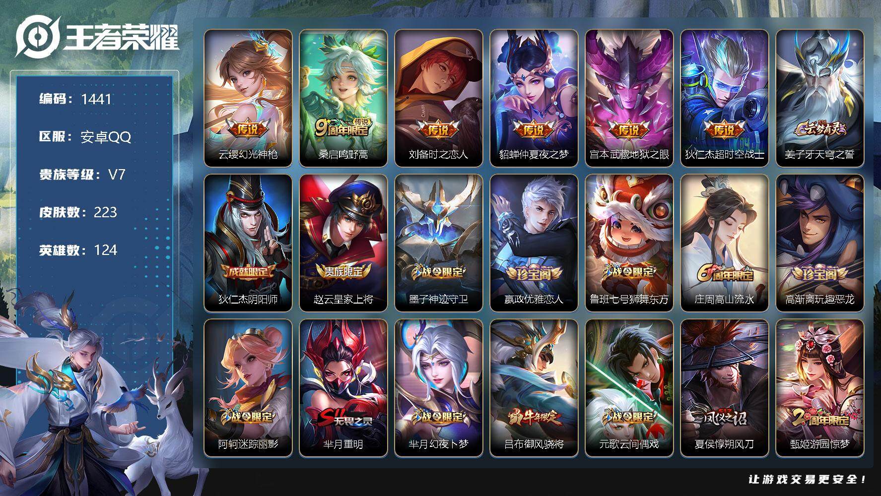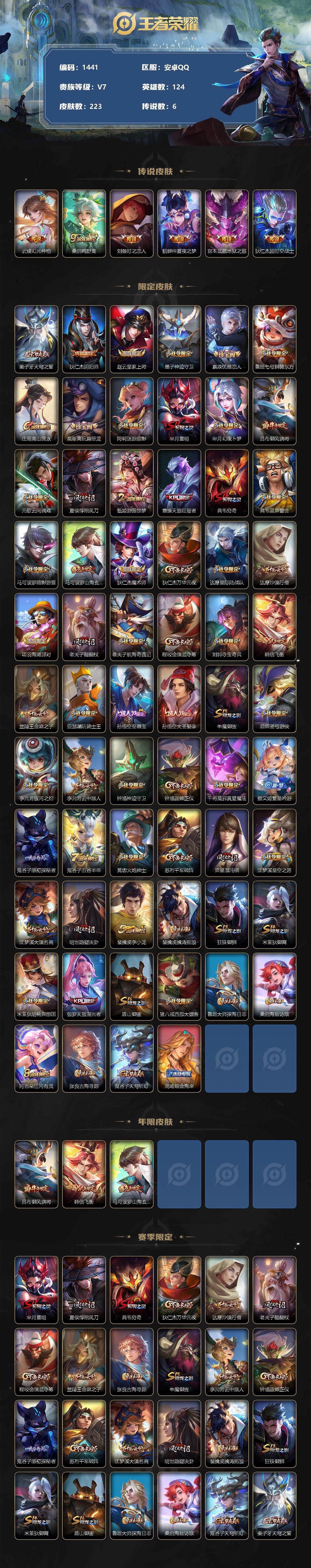 [12151280]【商品标题】:安卓Q-V0-最强王者段位-124英雄-223皮肤-0典藏-0珍品无双-0无双-0珍品传说-6传说-58史诗