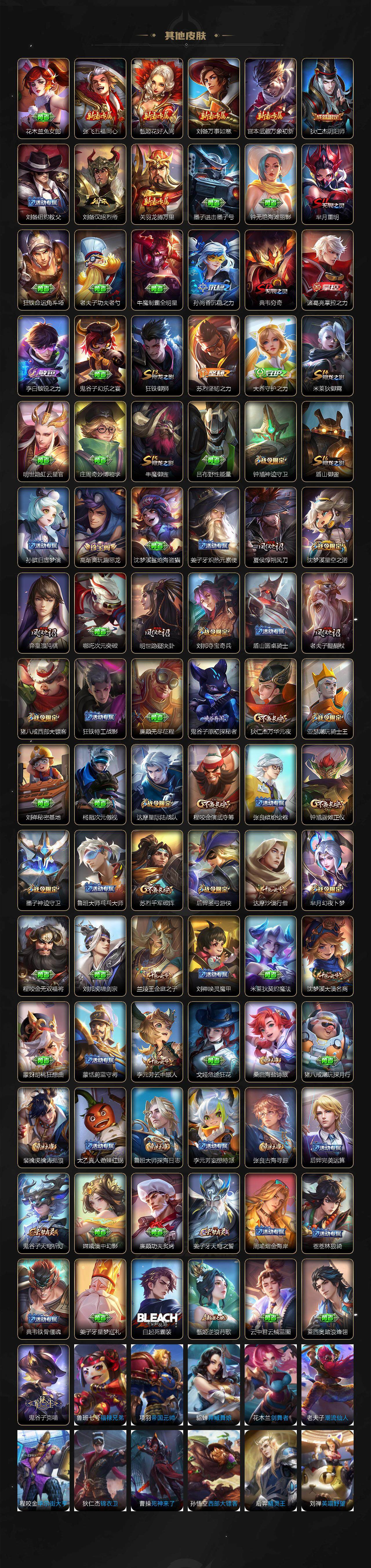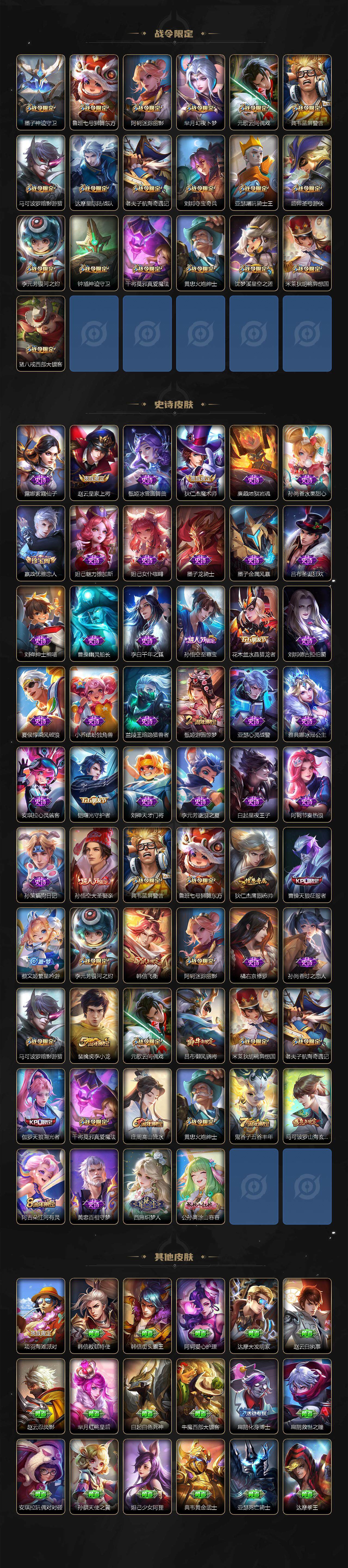 【限定皮肤】:姜子牙天穹之誓,狄仁杰阴阳师,赵云皇家上将,墨子神迹守卫,嬴政优雅恋人,鲁班七号狮舞东方,庄周高山流水,高渐离玩趣恶龙,阿轲迷踪丽影,芈月重明,芈月幻夜卜梦,吕布御风骁将,元歌云间偶戏,夏侯惇朔风刀,甄姬游园惊梦,曹操天狼征服者,典韦穷奇,典韦蓝屏警告,马可波罗暗影游猎,马可波罗山海玄木吟,狄仁杰魔术师,狄仁杰万华元夜,达摩星际陆战队,达摩沙漠行僧,项羽海滩派对,老夫子醍醐杖,老夫子航海奇遇记,程咬金演武夺筹,刘邦夺宝奇兵,韩信飞衡,兰陵王金庭之子,亚瑟潮玩骑士王,孙悟空至尊宝,孙悟空大圣娶亲,牛魔御旌,后羿圣弓游侠,李元芳银河之约,李元芳云中旅人,钟馗神迹守卫,钟馗驱傩正仪,干将莫邪真爱魔法,蔡文姬繁星吟游,鬼谷子原初探秘者,鬼谷子五谷丰年,黄忠火炮绅士,苏烈千军破阵,弈星混沌棋,沈梦溪星空之诺,沈梦溪大漠名商,明世隐疑决卦,裴擒虎李小龙,裴擒虎擒涛扼浪,狂铁御狮,米莱狄御霄,米莱狄胡桃异想国,伽罗天狼溯光者,盾山御銮,猪八戒西部大镖客,鲁班大师探海日志,桑启海盐诗旅,阿古朵江河有灵,张良古海寻踪,鬼谷子天穹祈灯,周瑜熔金海岸