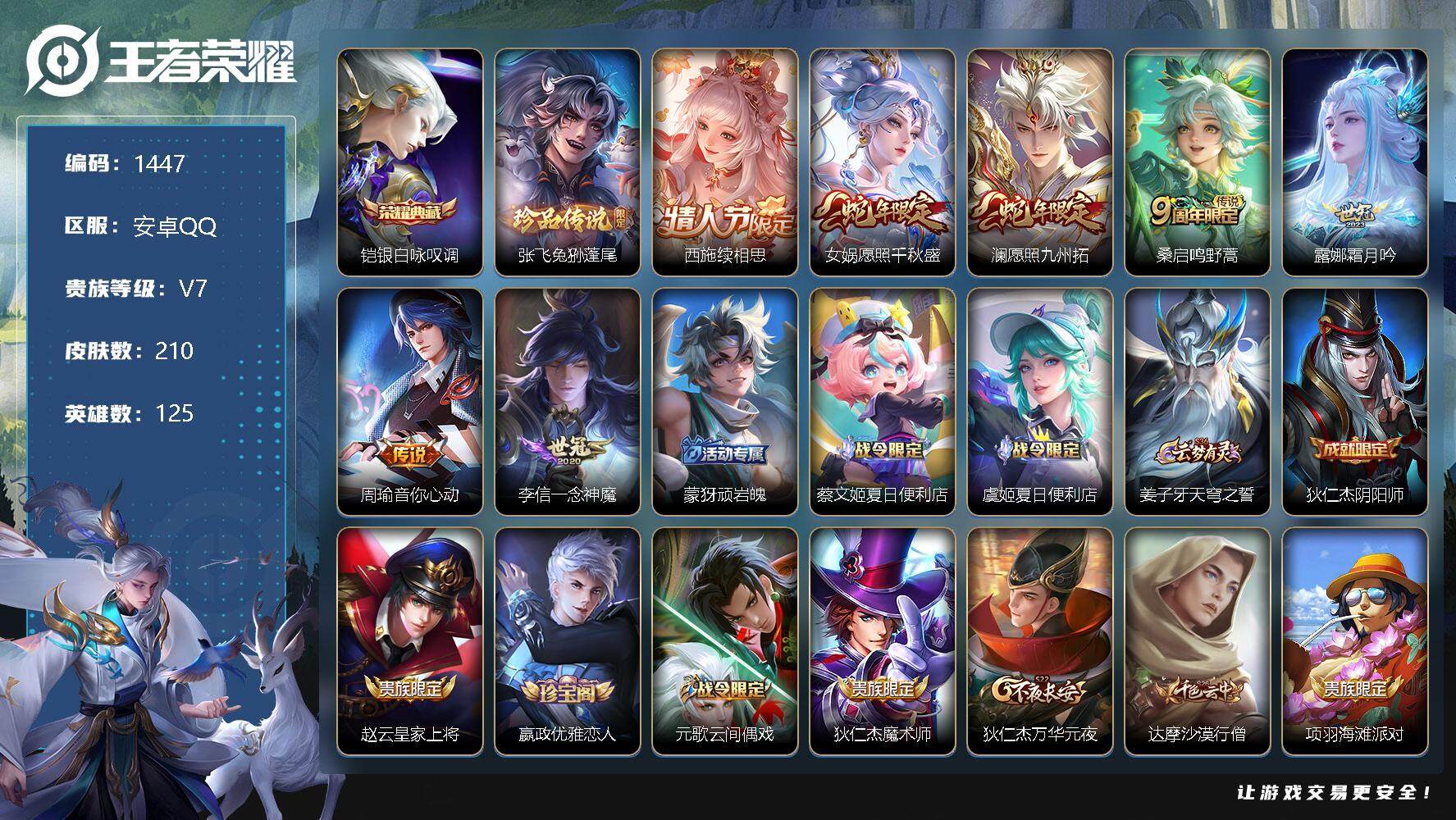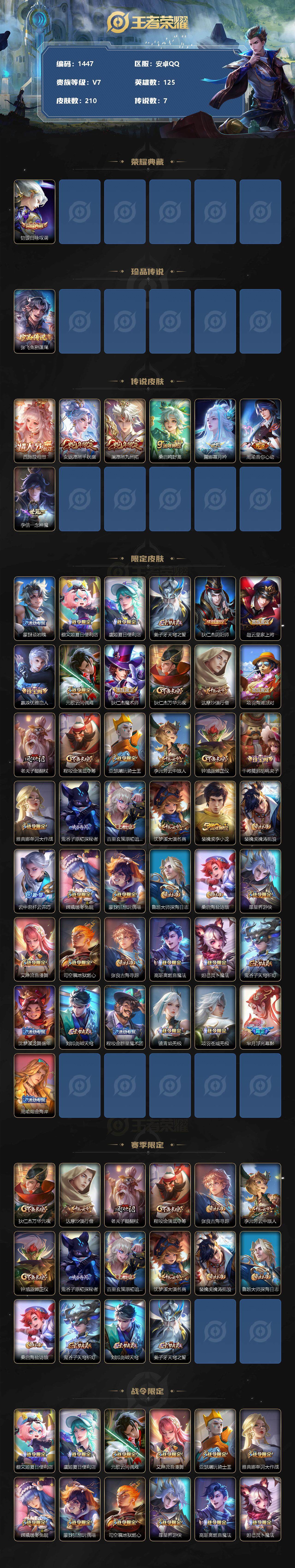 [12154726]【商品标题】:安卓Q-V7-最强王者段位-125英雄-210皮肤-1典藏-0珍品无双-0无双-1珍品传说-7传说-56史诗