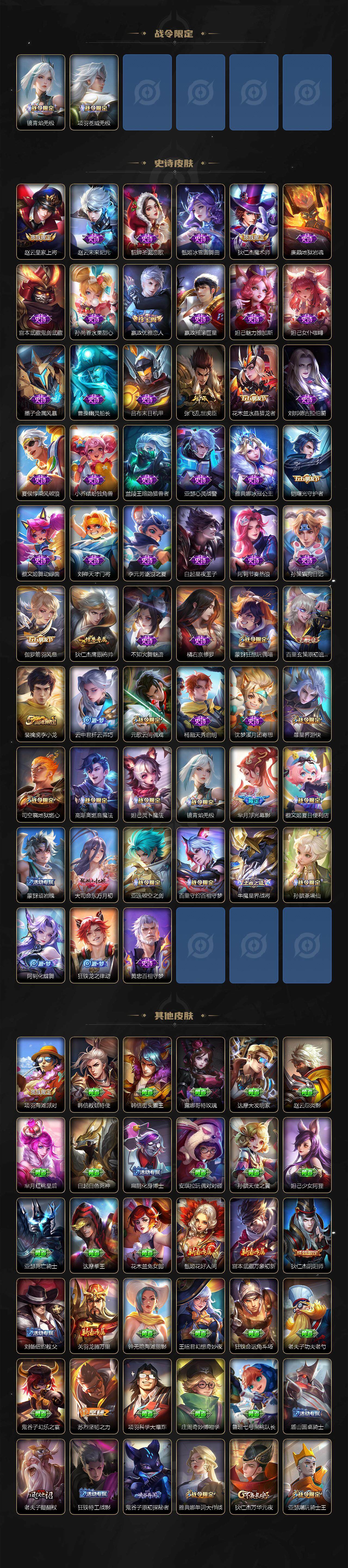 【史诗皮肤】:赵云皇家上将,赵云未来纪元,貂蝉圣诞恋歌,甄姬冰雪圆舞曲,狄仁杰魔术师,廉颇地狱岩魂,宫本武藏鬼剑武藏,孙尚香水果甜心,嬴政优雅恋人,嬴政摇滚巨星,妲己魅力维加斯,妲己女仆咖啡,墨子金属风暴,曹操幽灵船长,吕布末日机甲,张飞乱世虎臣,花木兰水晶猎龙者,刘邦德古拉伯爵,夏侯惇乘风破浪,小乔缤纷独角兽,兰陵王暗隐猎兽者,亚瑟心灵战警,雅典娜冰冠公主,铠曙光守护者,蔡文姬舞动绿茵,刘禅天才门将,李元芳逐浪之夏,白起星夜王子,阿轲节奏热浪,孙策猫狗日记,伽罗箭羽风息,狄仁杰鹰眼统帅,不知火舞魅语,橘右京修罗,蒙犽狂想玩偶喵,百里玄策原初追逐