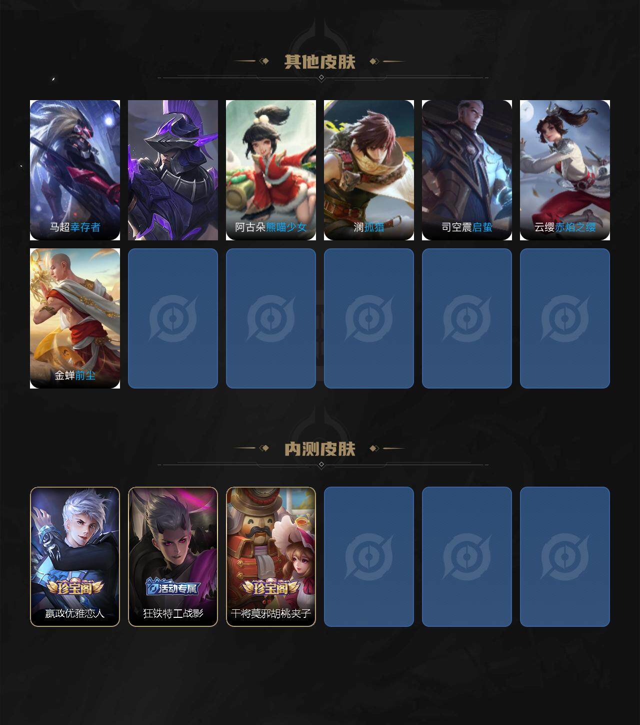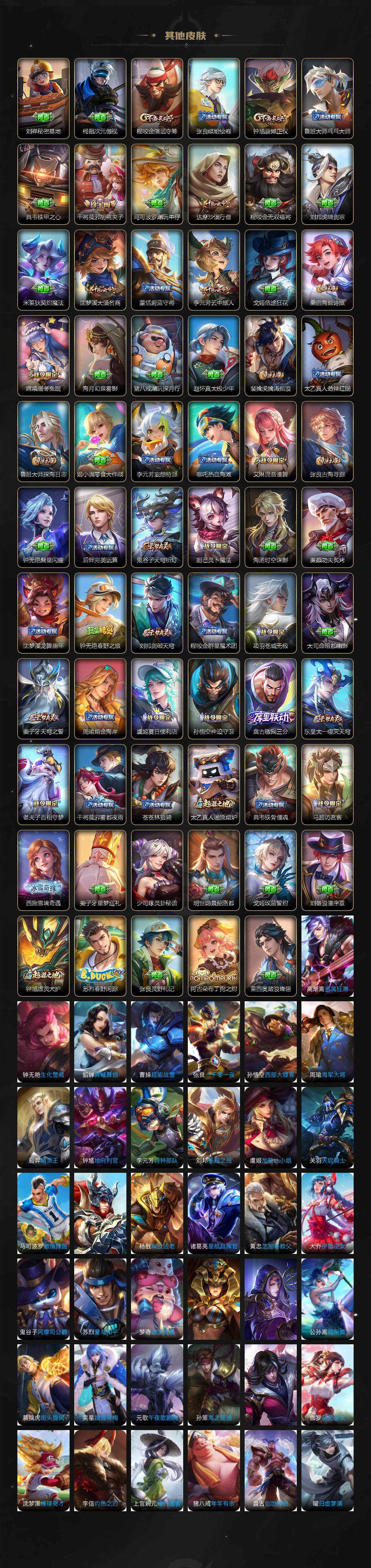 【赛季限定】:狄仁杰万华元夜,达摩沙漠行僧,老夫子醍醐杖,程咬金演武夺筹,张良古海寻踪,李元芳云中旅人,钟馗驱傩正仪,鬼谷子原初探秘者,百里玄策原初追逐者,沈梦溪大漠名商,裴擒虎擒涛扼浪,鲁班大师探海日志,桑启海盐诗旅,鬼谷子天穹祈灯,刘邦剑破天穹,姜子牙天穹之誓
