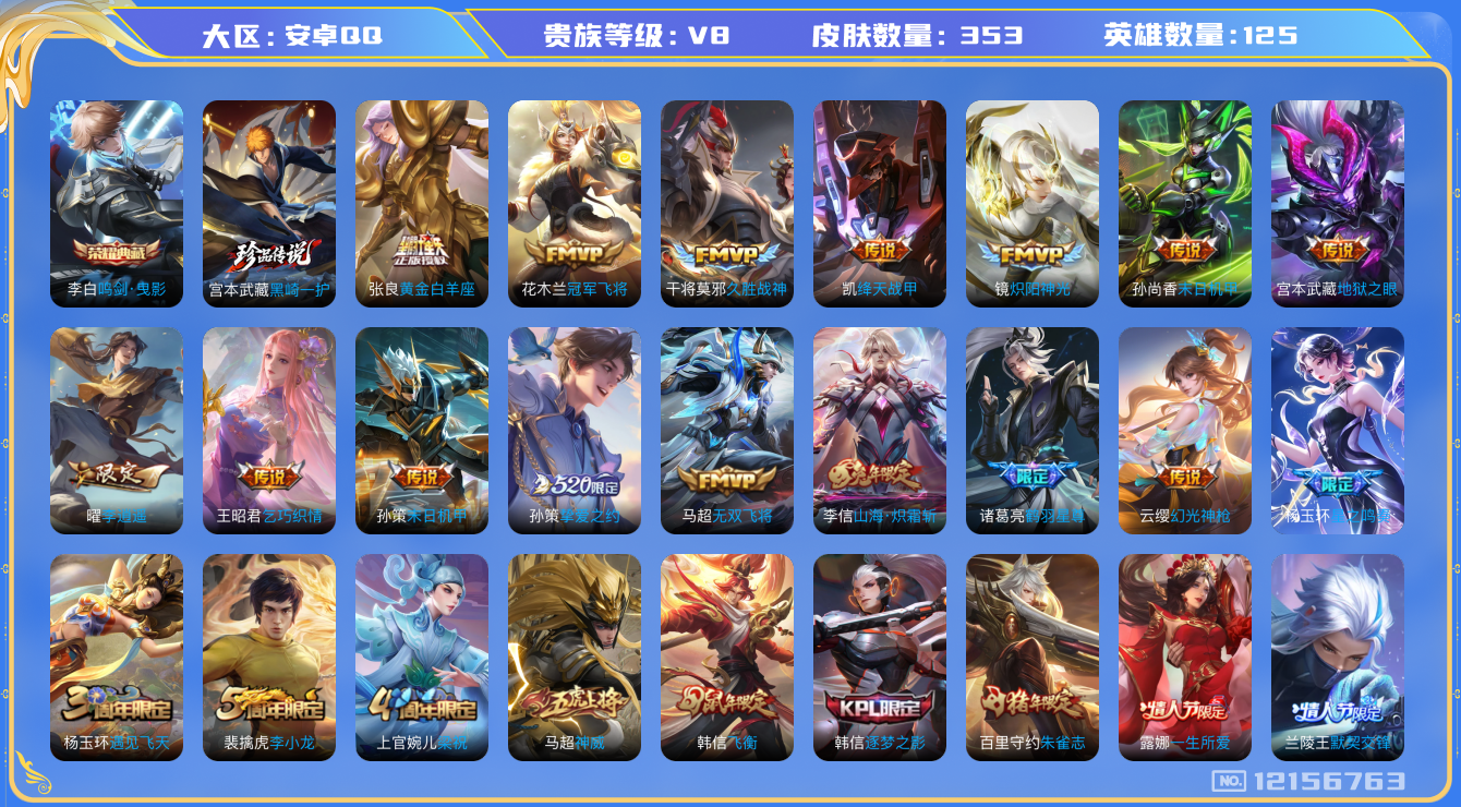[12156763]【商品标题】:安卓Q-V8-最强王者段位-125英雄-353皮肤-1典藏-0珍品无双-0无双-1珍品传说-28传说-106史诗