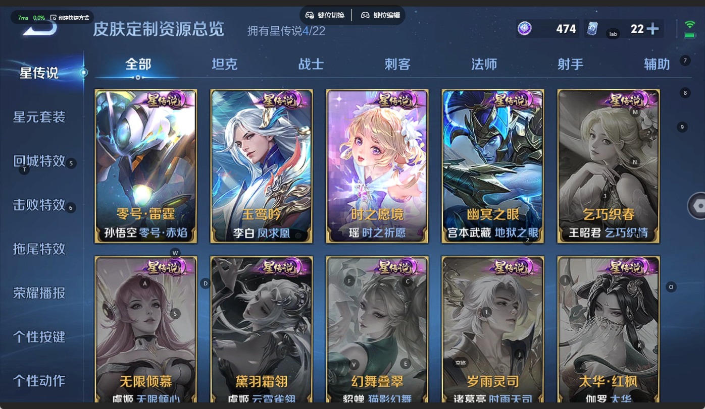 金蝉唐三藏,夏侯惇匿光决锋者,哪吒逐梦之翼,甄姬幽恒,盾山梦圆繁星,铠青龙志,曹操天狼征服者,伽罗太华,赵云百木心枪,干将莫邪冰霜恋舞曲,典韦岱宗,孙尚香异界灵契,牛魔奔雷神使,项羽霸王别姬,吕布御风骁将,后羿如梦令,露娜启示之音,后羿辉光之辰,露娜一生所爱,庄周玄嵩,庄周云端筑梦师,诸葛亮时雨天司,兰陵王默契交锋,公孙离祈雪灵祝,公孙离玉兔公主,司空震愿照·山河定,公孙离蜜橘之夏,裴擒虎李小龙,裴擒虎天狼狩猎者,裴擒虎寅虎·赤拳,东皇太一逐梦之光,上官婉儿天狼绘梦者,李白诗剑行,花木兰默契交锋,马可波罗逐梦之星,马可波罗山海·玄木吟,桑启鸣野蒿,女娲补天,孙悟空孙行者,孙悟空至尊宝,孙悟空美猴王,百里玄策白虎志,马超神威,雅典娜神奇女侠,赵云引擎之心,云中君时之祈愿,韩信傲雪梅枪,韩信飞衡,韩信逐梦之影,百里守约朱雀志,墨子降魔,瑶时之祈愿,瑶山海·碧波行,澜愿照·九州拓,虞姬霸王别姬,王昭君凤凰于飞,嫦娥如梦令,关羽武圣,关羽冰锋战神,橘右京枫霜尽