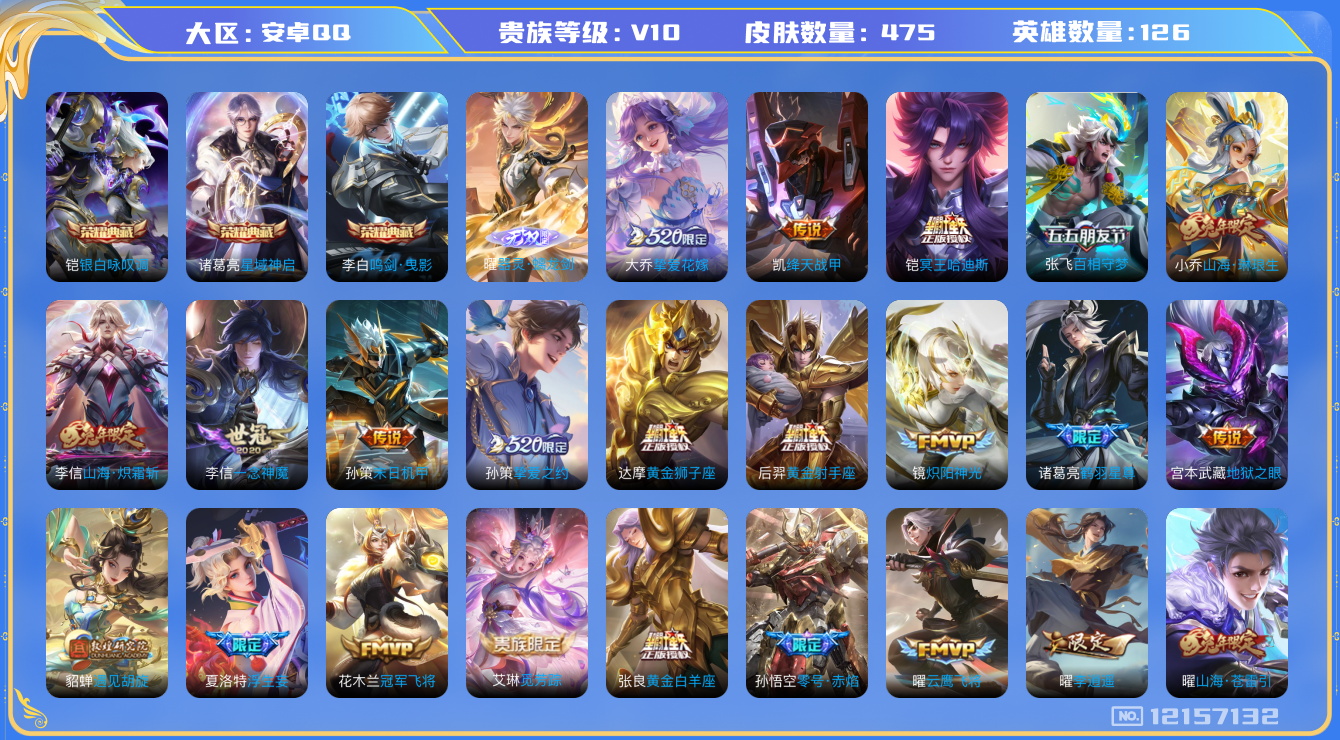[12157132]V10 3典藏 1无双 50传说 126英雄 475皮肤 可修改实名 优质装备:鸣剑·曳影,星域神启(倪克斯贼亮),银白咏叹调(倪克斯侍卫),器灵·螭龙剑,黄金狮子座,黄金射手座,冠军飞将,云鹰飞将(小将军),绛天战甲(鸡嘴战神),黄金白羊座,炽阳神光,一念神魔,零号·赤焰,地狱之眼,李逍遥,遇见胡旋,末日机甲-孙策,挚爱之约,挚爱花嫁,无双飞将,山海·炽霜斩(李信年限),山海·琳琅生(小乔年限),山海·苍雷引(电光曜子),浮生妄,百相守梦(张飞),电玩·雷克斯,鹤羽星尊,艾琳觅芳踪,黄金天蝎座,涂山容容 传说皮:死亡执政官,铠冥王哈迪斯,幻光神枪 珍宝阁皮:胡桃夹子,优雅恋人,女武神 限定皮:愿照·九州拓(澜年限),愿照·山河定(司空震年限),逐霄战戟,鸣野蒿,至尊宝,白虎志(电光耗子),凤求凰(白切鸡),凤凰于飞,太华(伽罗年限),武陵仙君(小桃花),异界灵契(白毛香),傲雪梅枪,补天,时雨天司(水龙头),神威(电光马子),飞衡(韩信年限),玄嵩(庄周年限),山海·碧波行(瑶年限),无限倾心-项羽,高山流水,诗剑行,匿光决锋者,降魔,五谷丰年,青龙志(铠年限),冰锋战神,幽恒(沐浴露),武圣,御风骁将(吕布年限),天狼狩猎者,逐梦之翼,逐梦之星,岱宗(典韦年限),天狼征服者,奔雷神使(牛魔年限),祈雪灵祝(雪兔子),天狼绘梦者,李小龙,逐梦之影,逐梦之光,朱雀志(守约年限),永曜之星,辉光之辰,如梦令-嫦娥,如梦令-后羿,霸王别姬-项羽,霸王别姬-虞姬,默契交锋-兰陵王,默契交锋-花木兰,孙行者,一生所爱,引擎之心,天魔缭乱,冰霜恋舞曲,云端筑梦师,蜜橘之夏,神奇女侠,美猴王,寅虎·赤拳(老虎年限),时之祈愿-云中君,时之祈愿-瑶(瑶传限),百木心枪,玉兔公主,启示之音,唐三藏,枫霜尽,梦圆繁星,山海·玄木吟(马可年限) 史诗皮:苍鳞隐世,绮世丹青,龙之律动,灵蛊蚀心,星界战将,石田雨龙,百相守梦-周瑜,百相守梦-黄忠,破空之剑,东方月初,蒙犽顽岩魄,怒海争锋,蔬乡物语(鲁班七号),百相守梦-百里守约,织梦人,紫霞仙子,苍穹之光,电玩小子(小书包),白龙吟,黄金分割率,特工魅影,千年之狐,永昼,冰冠公主,白蛇,江河有灵,高渐离燃音魔法,蒙恬荣光圣徽,魅语,电玩·爆裂旋风,无限星赏官,晚萤,偶像歌手,匿光破解者,百相守梦(刘备),百相守梦(关羽),龙骑士(小龙