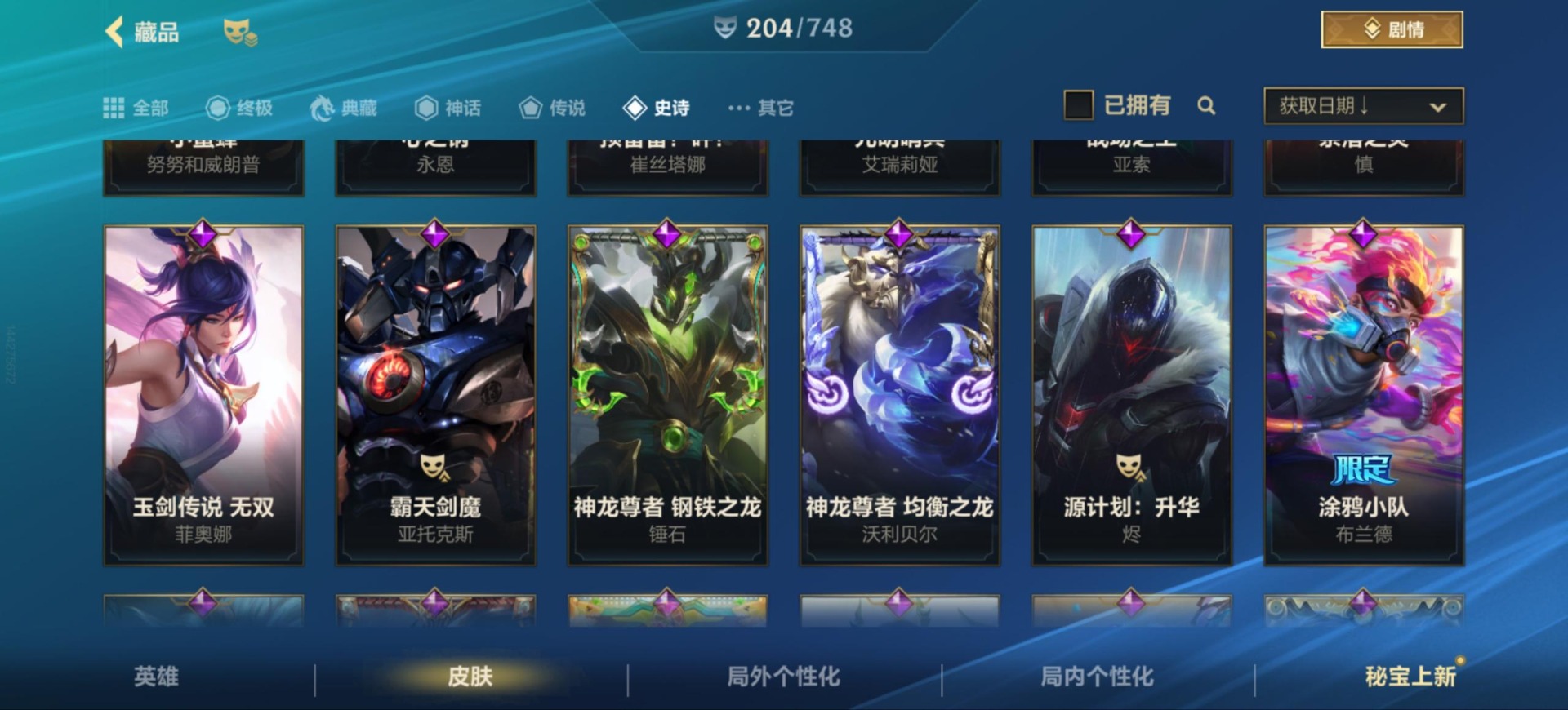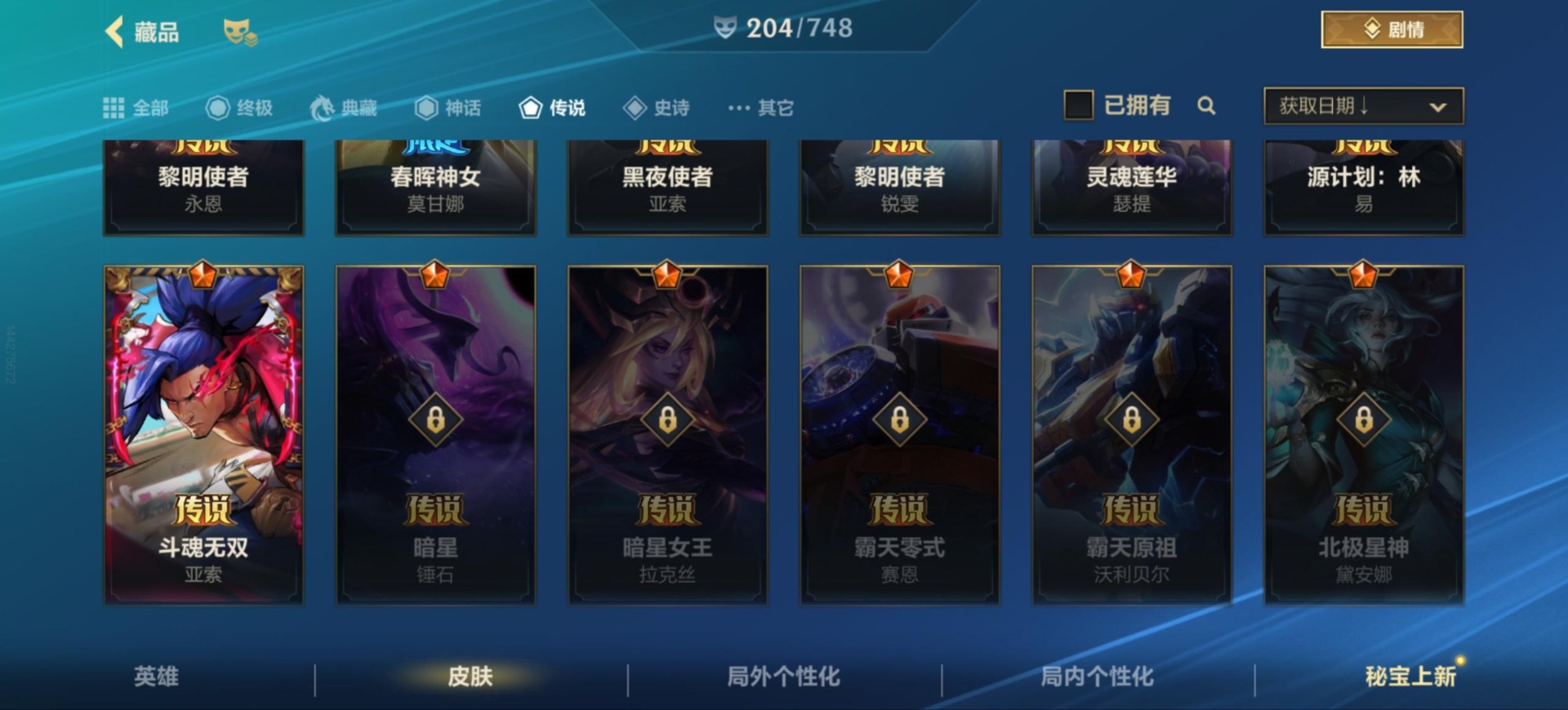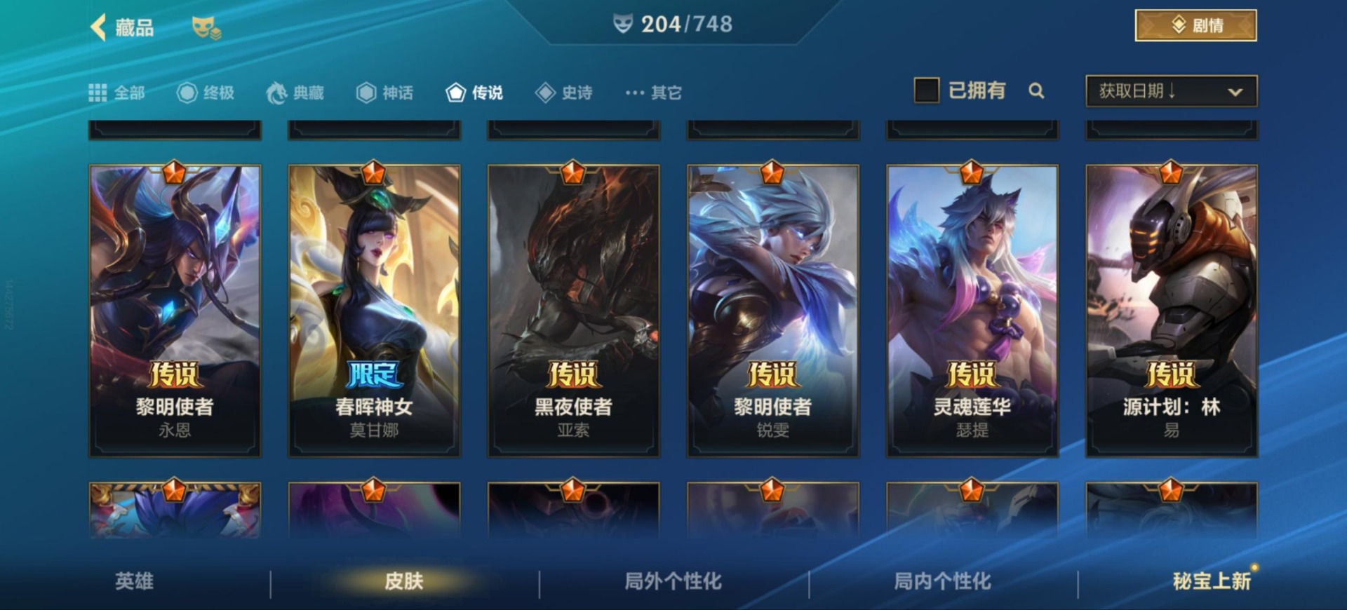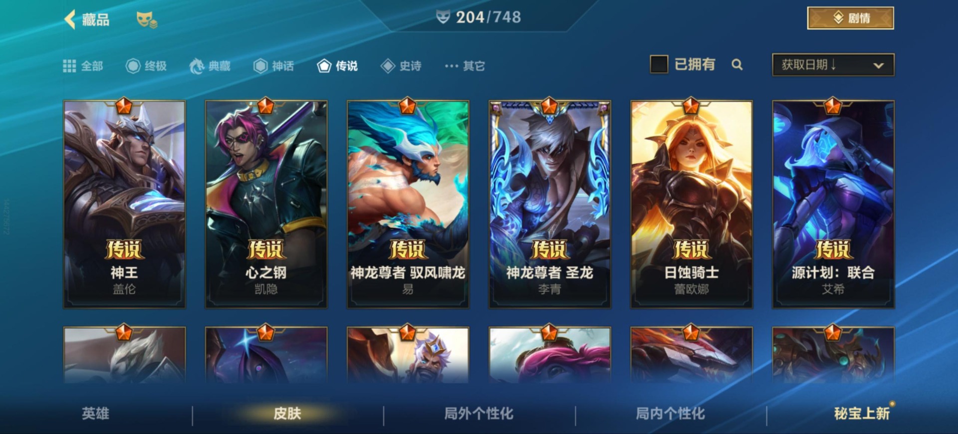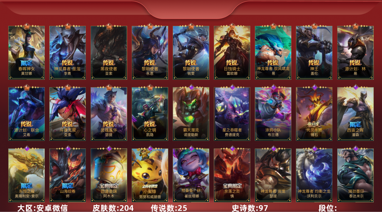 [12157581]25传说 97史诗 204皮肤 可二次 可修改实名 永久社交场景限制 优质装备:黑夜使者亚索,黎明使者锐雯,日蚀骑士蕾欧娜,神龙尊者 驭风啸龙,神王盖伦,源计划:联合,源计划:林,灵魂莲华腕豪,心之钢凯隐 传说皮:神龙尊者 圣龙 李青,春晖神女莫甘娜,斗魂无双亚索,黎明使者永恩