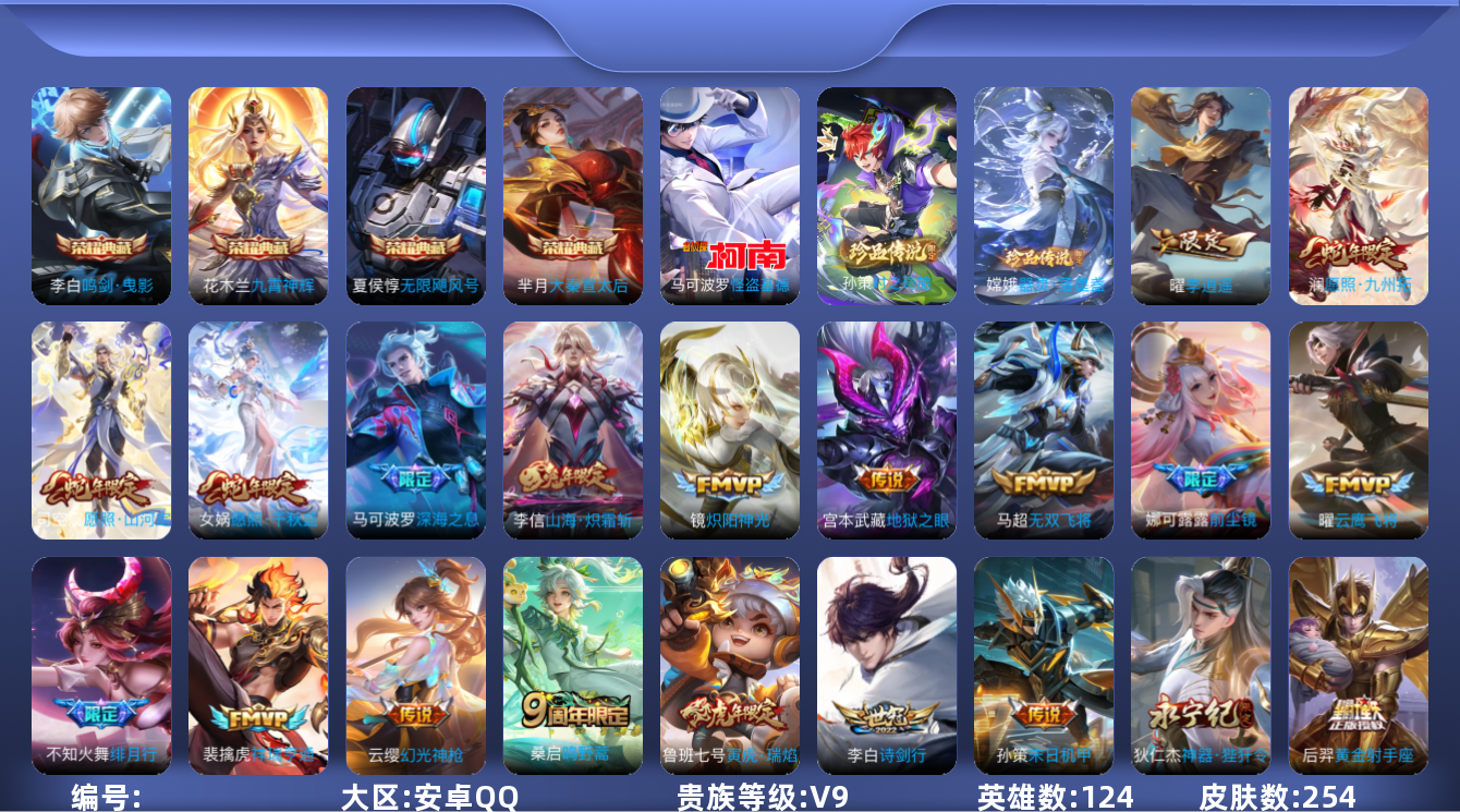 [12158163]【商品标题】:安卓Q-V9-至尊星耀V段位-124英雄-254皮肤-4典藏-0珍品无双-0无双-3珍品传说-24传说-76史诗