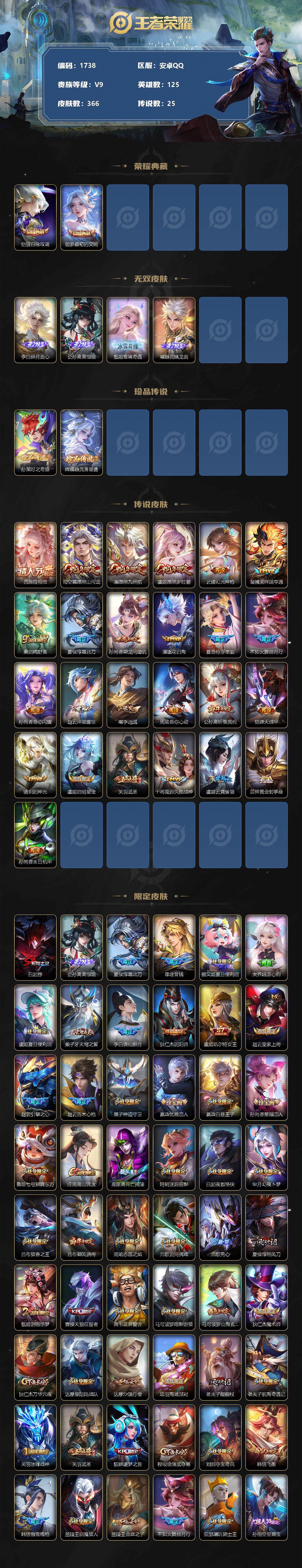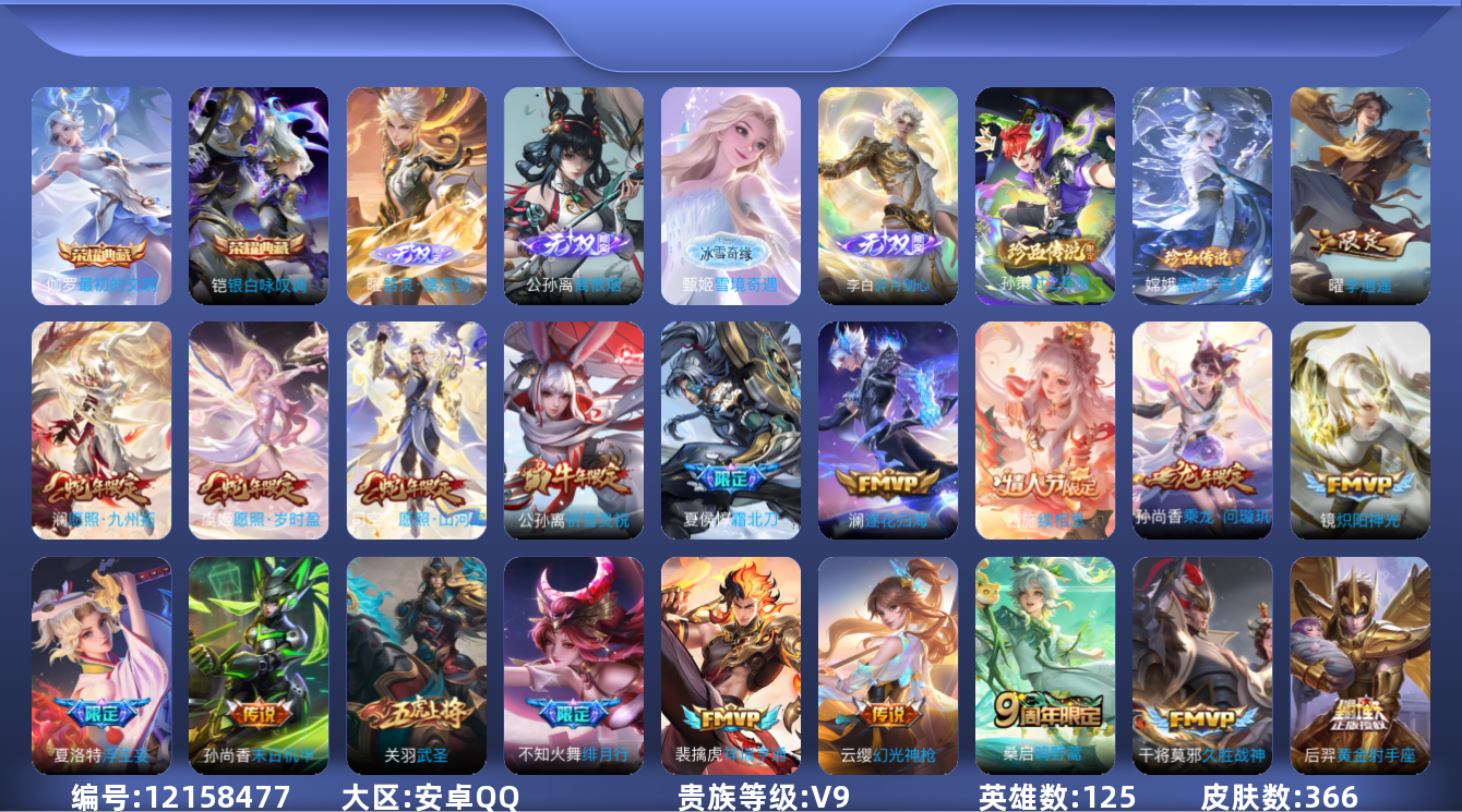 [12158477]【商品标题】:安卓Q-V9-尊贵铂金IV段位-125英雄-366皮肤-2典藏-0珍品无双-4无双-2珍品传说-25传说-112史诗