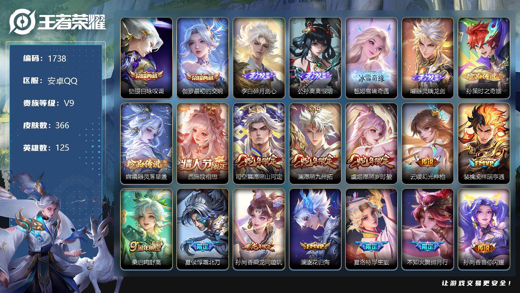 [12158477]【商品标题】:安卓Q-V9-尊贵铂金IV段位-125英雄-366皮肤-2典藏-0珍品无双-4无双-2珍品传说-25传说-112史诗 【荣耀典藏】:铠银白咏叹调,伽罗最初的交响 【无双皮肤】:李白碎月剑心,公孙离离恨烟,甄姬雪境奇遇,曜器灵螭龙剑 【珍品传说】:孙策时之奇旅,嫦娥器灵落星盏 【传说皮肤】:西施续相思,司空震愿照山河定,澜愿照九州拓,虞姬愿照岁时盈,云缨幻光神枪,裴擒虎祥瑞亨通,桑启鸣野蒿,夏侯惇霜北刀,孙尚香乘龙问璇玑,澜逐花归海,夏洛特浮生妄,不知火舞绯月行,孙尚香音你闪耀,赵云淬星耀世,曜李逍遥 ,周瑜音你心动,公孙离祈雪灵祝,铠绛天战甲,镜炽阳神光,虞姬启明星使,关羽武圣,干将莫邪久胜战神,虞姬云霓雀翎,后羿黄金射手座,孙尚香末日机甲 【限定皮肤】:白起狰,公孙离离恨烟,夏侯惇霜北刀,暃埋骨钱,蔡文姬夏日便利店,大乔绒语心约,虞姬夏日便利店,姜子牙天穹之誓,李白谪仙醉月,狄仁杰阴阳师,虞姬凯尔特女王,赵云皇家上将,赵云引擎之心,赵云百木心枪,墨子神迹守卫,嬴政优雅恋人,嬴政白昼王子,孙尚香蔷薇恋人,鲁班七号狮舞东方,庄周高山流水,高渐离死亡摇滚,阿轲迷踪丽影,白起夜都怪侠,芈月幻夜卜梦,吕布猎兽之王,吕布御风骁将,周瑜赤莲之焰,元歌云间偶戏,元歌无心,夏侯惇朔风刀,甄姬游园惊梦,曹操天狼征服者,典韦蓝屏警告,马可波罗暗影游猎,马可波罗山海玄木吟,狄仁杰魔术师,狄仁杰万华元夜,达摩星际陆战队,达摩沙漠行僧,项羽海滩派对,老夫子醍醐杖,老夫子航海奇遇记,关羽冰锋战神,关羽武圣,貂蝉逐梦之音,程咬金演武夺筹,刘邦夺宝奇兵,韩信飞衡,韩信傲雪梅枪,兰陵王驯魔猎人,兰陵王金庭之子,不知火舞绯月行,亚瑟潮玩骑士王,孙悟空至尊宝,牛魔御旌,后羿辉光之辰,李元芳银河之约,李元芳云中旅人,虞姬启明星使,钟馗神迹守卫,钟馗驱傩正仪,杨玉环遇见飞天,女娲朔望之晖,雅典娜单词大作战,雅典娜黎明之约,蔡文姬繁星吟游,太乙真人华丽摇滚,鬼谷子原初探秘者,鬼谷子五谷丰年,黄忠烈魂,黄忠火炮绅士,苏烈千军破阵,百里玄策原初追逐者,百里守约朱雀志,弈星混沌棋,梦奇顽趣,公孙离祈雪灵祝,沈梦溪星空之诺,沈梦溪大漠名商,明世隐疑决卦,明世隐吟游魔法,裴擒虎李小龙,裴擒虎擒涛扼浪,米莱狄御霄,米莱狄胡桃异想国,云中君纤云弄巧,盾山御銮,猪八戒西部大镖客,上官婉儿梁祝,上官婉儿天狼绘梦