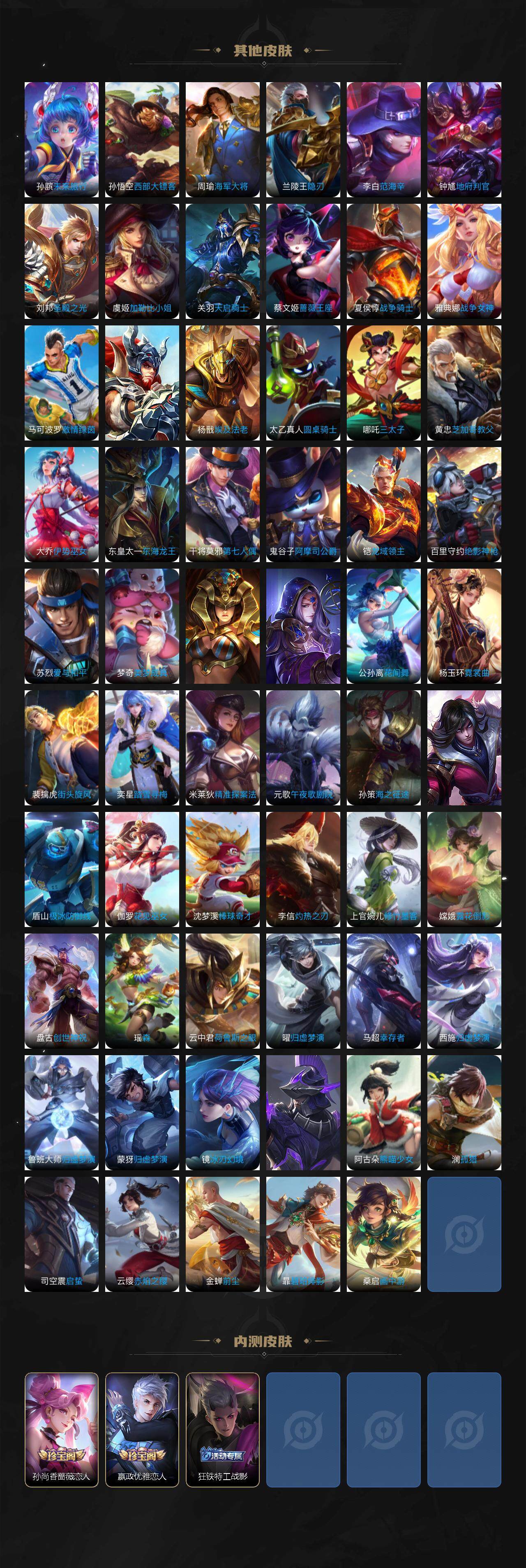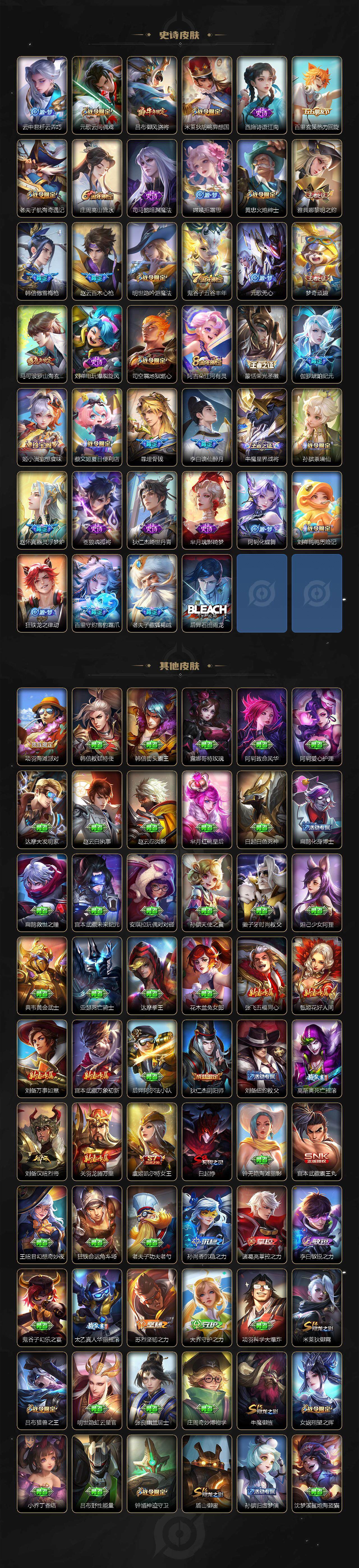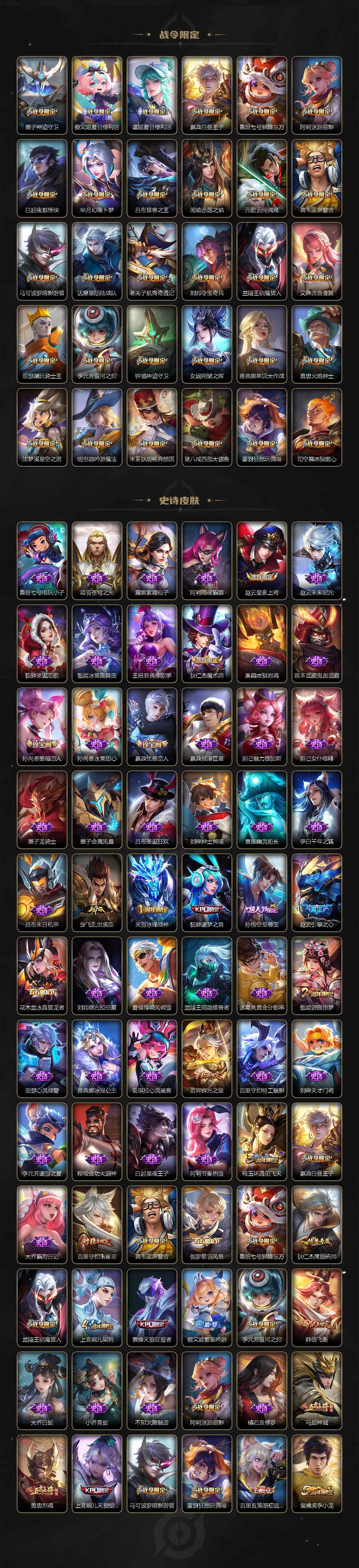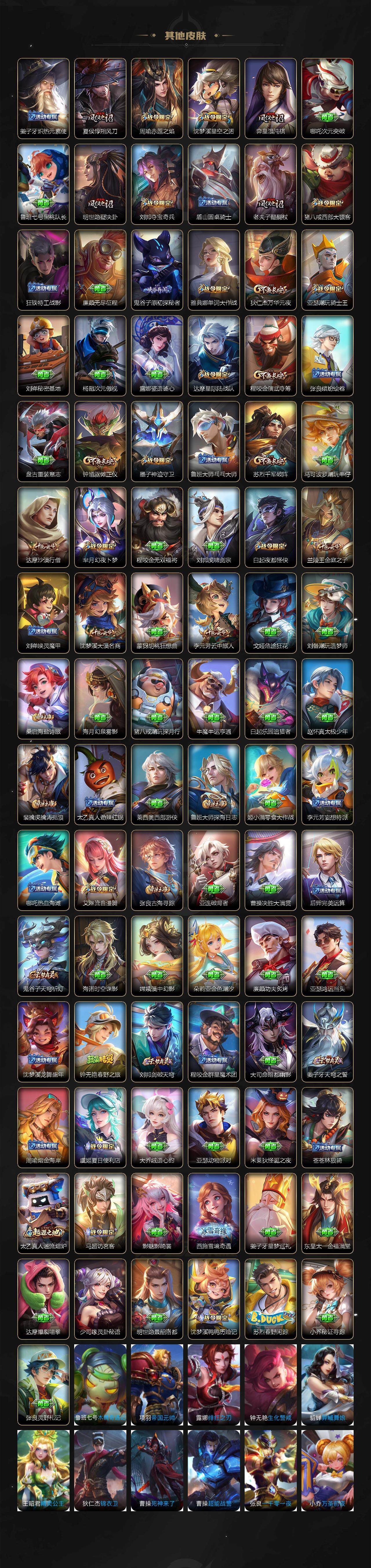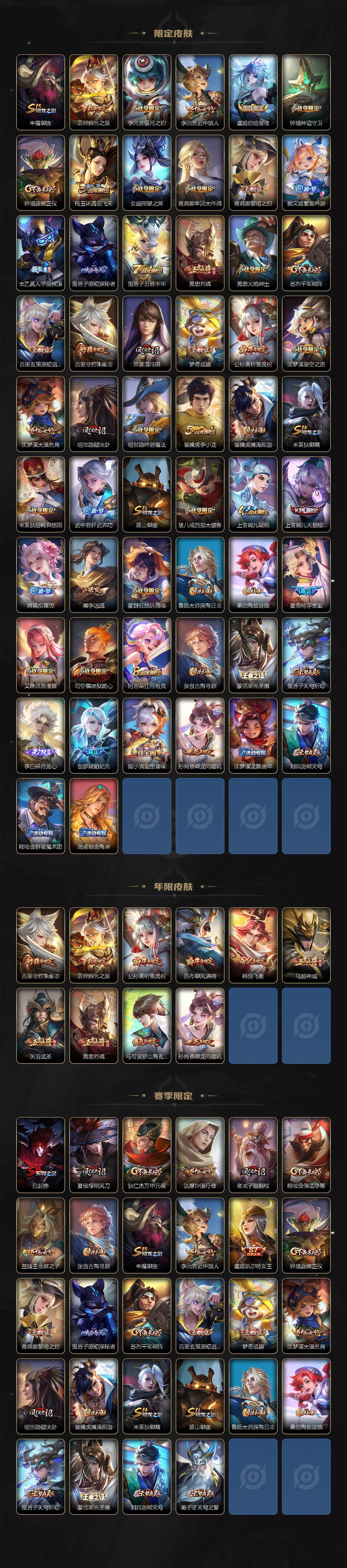 【限定皮肤】:白起狰,公孙离离恨烟,夏侯惇霜北刀,暃埋骨钱,蔡文姬夏日便利店,大乔绒语心约,虞姬夏日便利店,姜子牙天穹之誓,李白谪仙醉月,狄仁杰阴阳师,虞姬凯尔特女王,赵云皇家上将,赵云引擎之心,赵云百木心枪,墨子神迹守卫,嬴政优雅恋人,嬴政白昼王子,孙尚香蔷薇恋人,鲁班七号狮舞东方,庄周高山流水,高渐离死亡摇滚,阿轲迷踪丽影,白起夜都怪侠,芈月幻夜卜梦,吕布猎兽之王,吕布御风骁将,周瑜赤莲之焰,元歌云间偶戏,元歌无心,夏侯惇朔风刀,甄姬游园惊梦,曹操天狼征服者,典韦蓝屏警告,马可波罗暗影游猎,马可波罗山海玄木吟,狄仁杰魔术师,狄仁杰万华元夜,达摩星际陆战队,达摩沙漠行僧,项羽海滩派对,老夫子醍醐杖,老夫子航海奇遇记,关羽冰锋战神,关羽武圣,貂蝉逐梦之音,程咬金演武夺筹,刘邦夺宝奇兵,韩信飞衡,韩信傲雪梅枪,兰陵王驯魔猎人,兰陵王金庭之子,不知火舞绯月行,亚瑟潮玩骑士王,孙悟空至尊宝,牛魔御旌,后羿辉光之辰,李元芳银河之约,李元芳云中旅人,虞姬启明星使,钟馗神迹守卫,钟馗驱傩正仪,杨玉环遇见飞天,女娲朔望之晖,雅典娜单词大作战,雅典娜黎明之约,蔡文姬繁星吟游,太乙真人华丽摇滚,鬼谷子原初探秘者,鬼谷子五谷丰年,黄忠烈魂,黄忠火炮绅士,苏烈千军破阵,百里玄策原初追逐者,百里守约朱雀志,弈星混沌棋,梦奇顽趣,公孙离祈雪灵祝,沈梦溪星空之诺,沈梦溪大漠名商,明世隐疑决卦,明世隐吟游魔法,裴擒虎李小龙,裴擒虎擒涛扼浪,米莱狄御霄,米莱狄胡桃异想国,云中君纤云弄巧,盾山御銮,猪八戒西部大镖客,上官婉儿梁祝,上官婉儿天狼绘梦