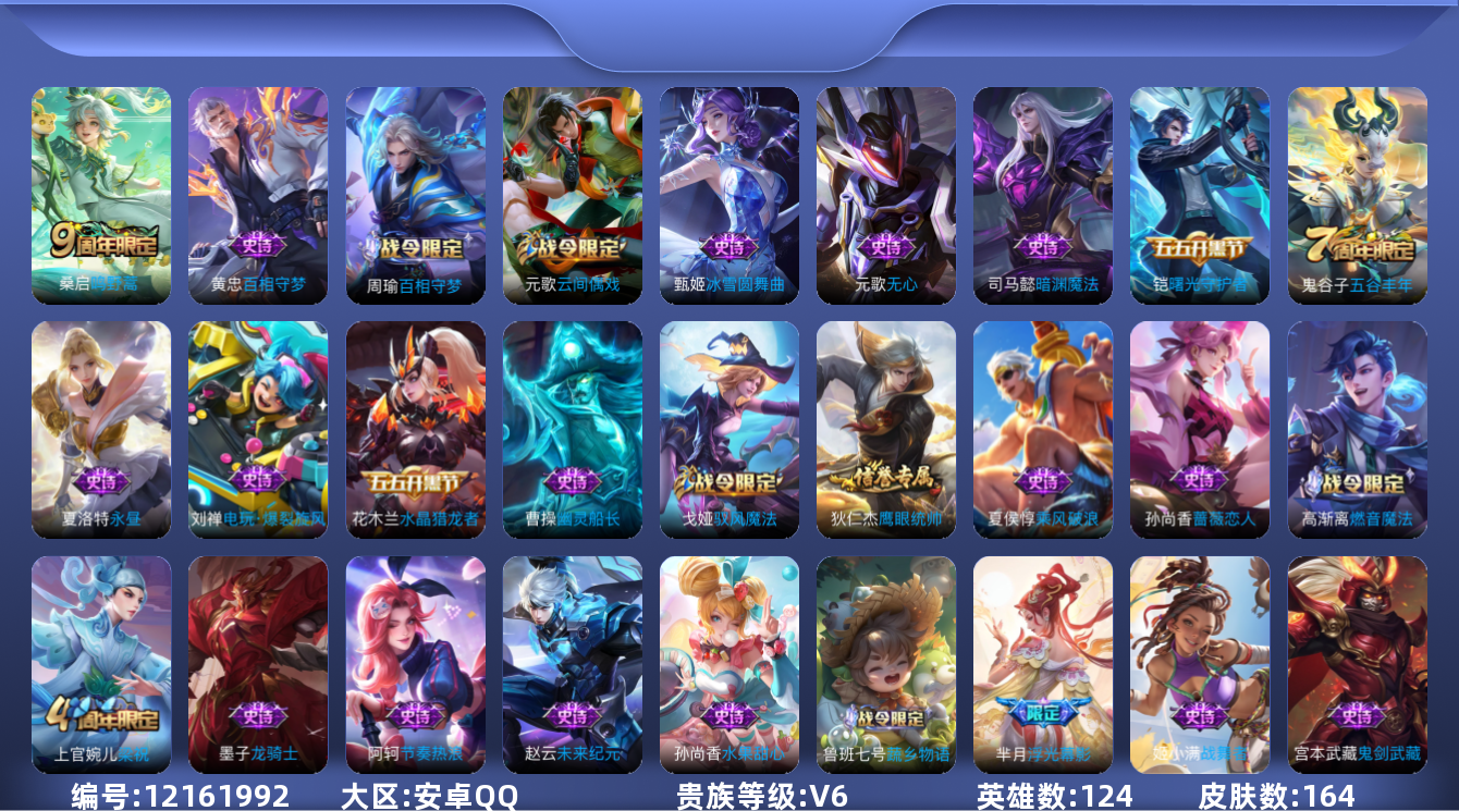 [12161992]【商品标题】:安卓Q-V6-最强王者段位-124英雄-164皮肤-0典藏-0珍品无双-0无双-0珍品传说-1传说-39史诗