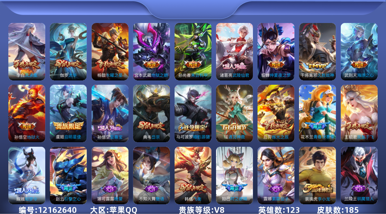 - PX_2105845-苹果QQ 281皮 贵族8级 2典藏 1珍品传说 8传说 69史诗【荣耀典藏】赤影疾锋,全息碎影【珍品传说】黑崎一护【传说皮肤】武圣,天魔缭乱,末日机甲,地狱火,久胜战神,鸣野蒿,愿照·九州拓,启明星使【史诗皮肤】石田雨龙,梁祝,纤云弄巧,箭羽风息,驯魔猎人,暗隐猎兽者,绅士熊喵,鸭鸭历险记,德古拉伯爵,圣诞狂欢,金属风暴,乘风破浪,魅力维加斯,暗夜贵公子,摇滚巨星,时之恋人